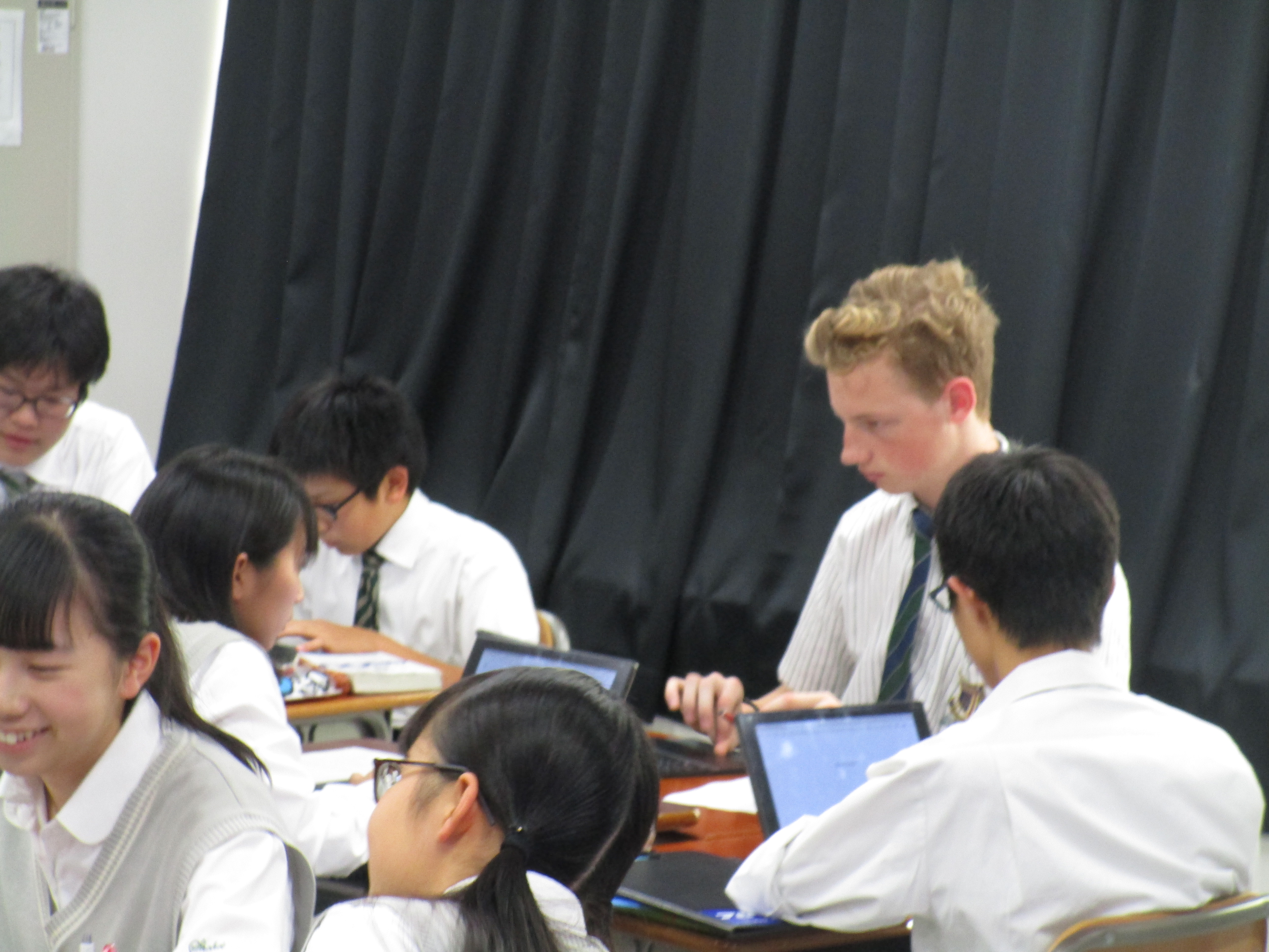 オーストラリアのクイーンズランド州からの留学生3人は、普段は高校のクラスでスクールバディと共に授業を受けています。そのうちの週4時間は、中学3年生の英語IB(国際バカロレア)の授業に参加しています。パワーポイントを使って、グループのメンバーと観光案内のプレゼンテーションの準備を進めています。年齢は高校生なので、中学生に時にはアドバイスをくれることもあり、お互いに良い刺激を受けつつ過ごしています。