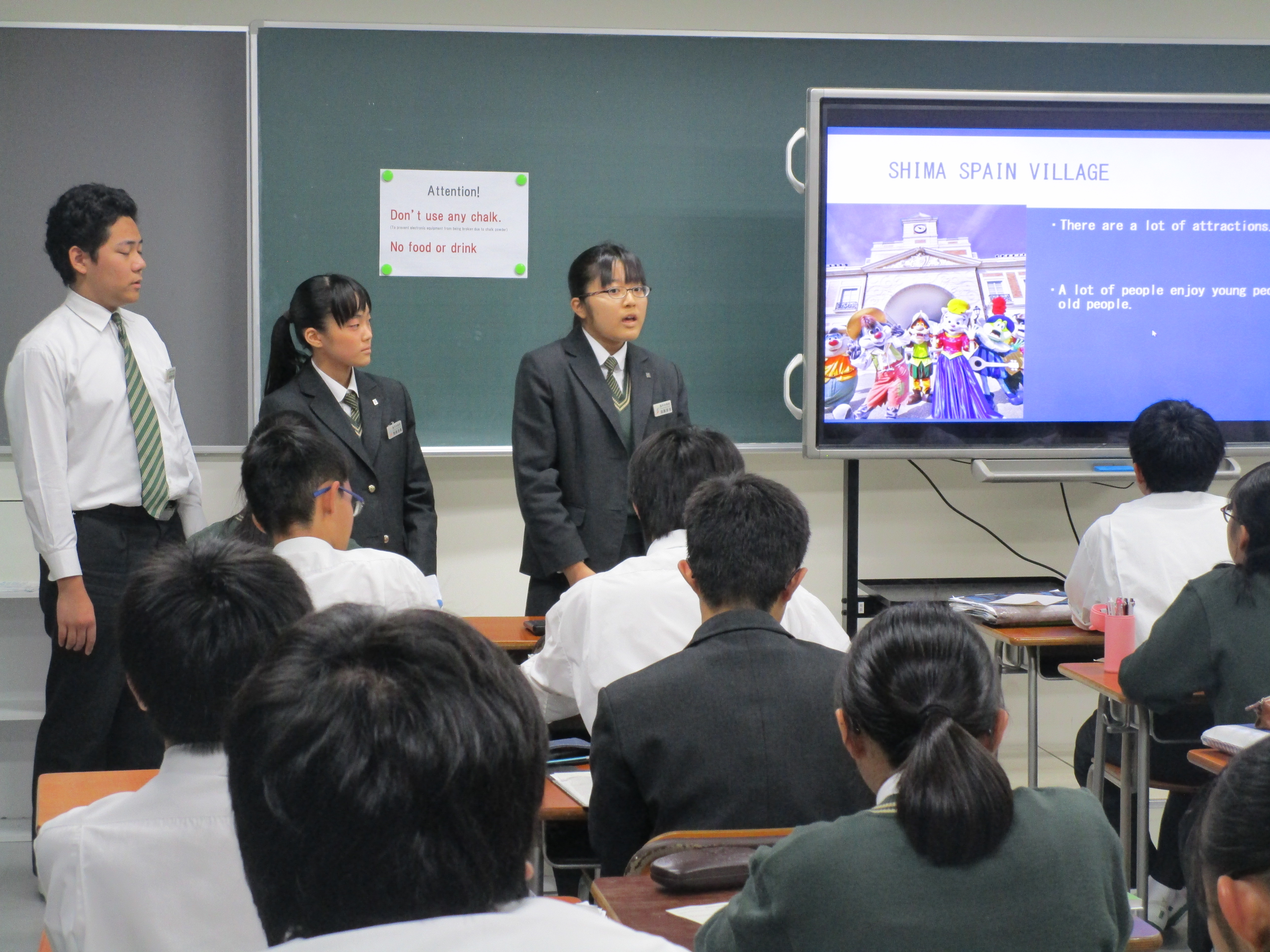 3年生は海外にばかり目を向けずに、日本の良さを再発見しようということで、旅行会社を作り、ツアーを組みました。和歌山、三重、岐阜、静岡、石川などの県をパワーポイントを使って英語でプレゼンテーションをして顧客の獲得を目指しました。自分達の住む日本を海外の人にも胸を張っておススメできることは誇らしいですね。茨城県の「魅力度ランキング」が47位で納得のいかない茨城の生徒は(いいところ、おいしいものばかりですよね)おいしい食べ物、絶景スポット、ゆるキャラ等を紹介した会社もありました。他の生徒達はとても興味を惹かれたようで、プレゼンテーションは大成功でした。