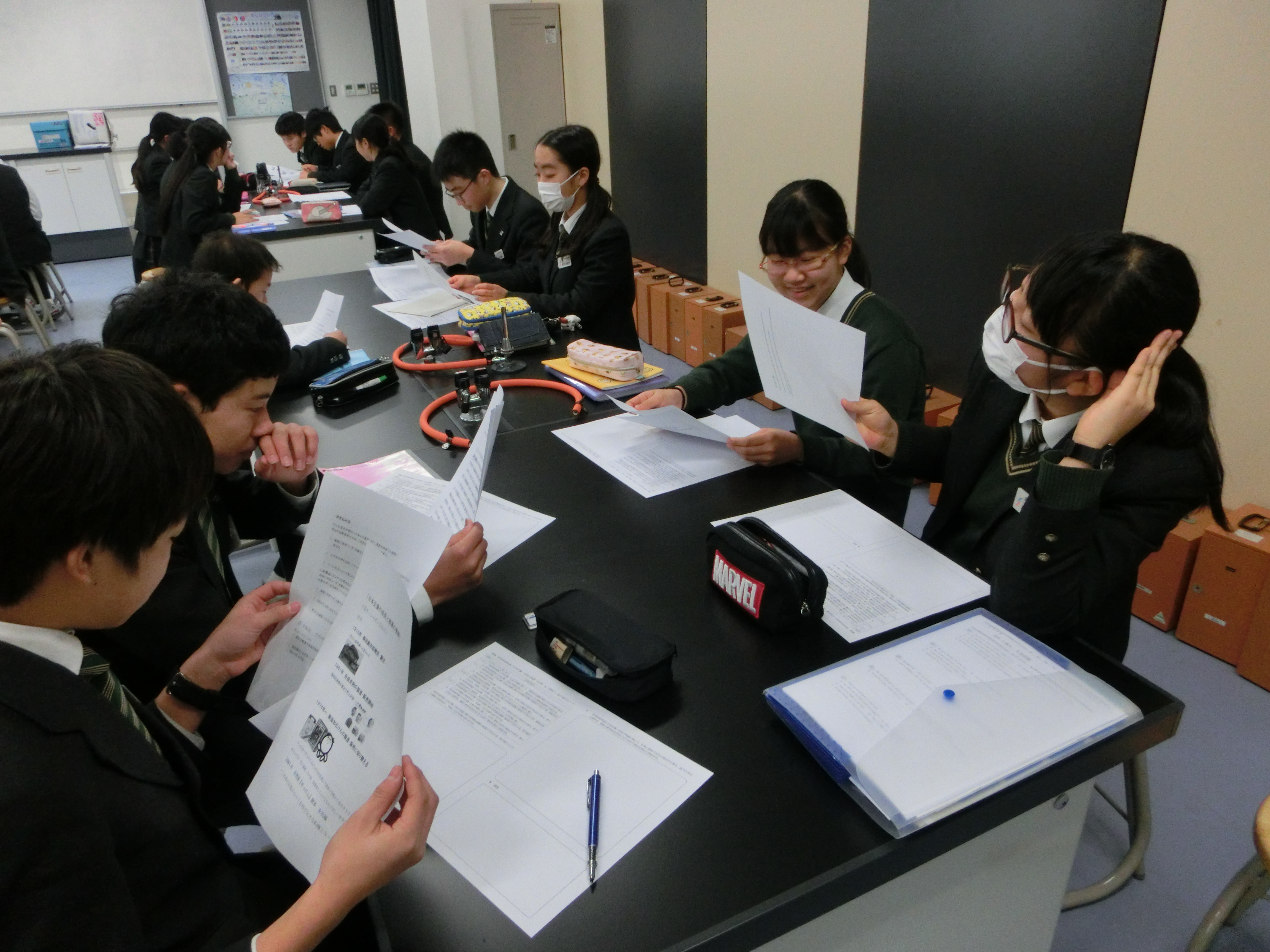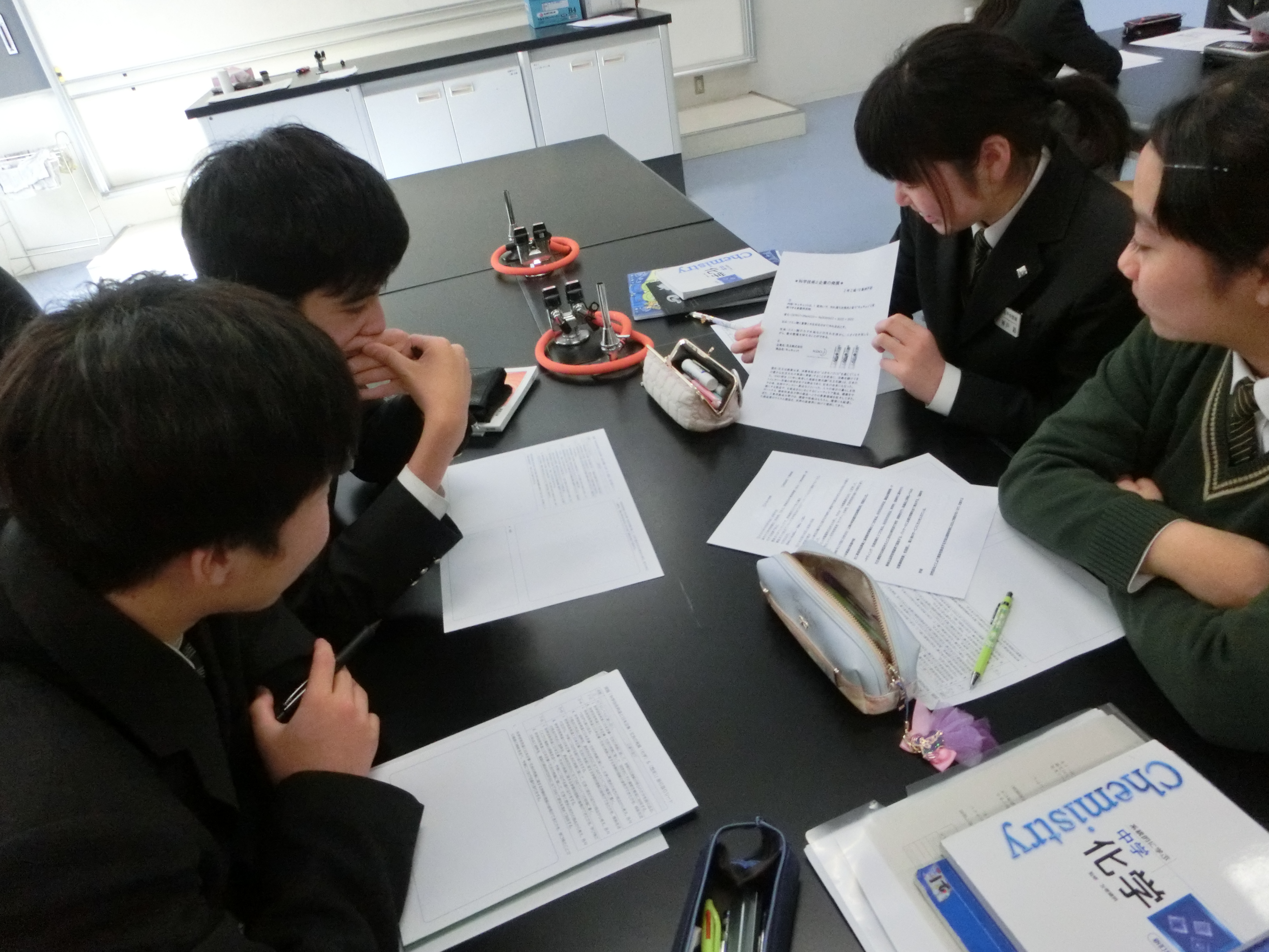 IB(国際バカロレア)の授業では、教科の枠に捉われない横断型の授業があります。今回、中学2年生で「科学技術の発達と企業・日本社会の発展」について化学と歴史の視点で授業を行いました。1つの化学反応や製品を題材に、それを活用して企業がどのような業績を挙げたかや、それが日本の社会にどのような影響を及ぼしたかを調査し、自分たちでまとめました。それぞれ自分のレポートを用いて皆に発表し、それぞれ様々な技術や企業を知ることができたようです。