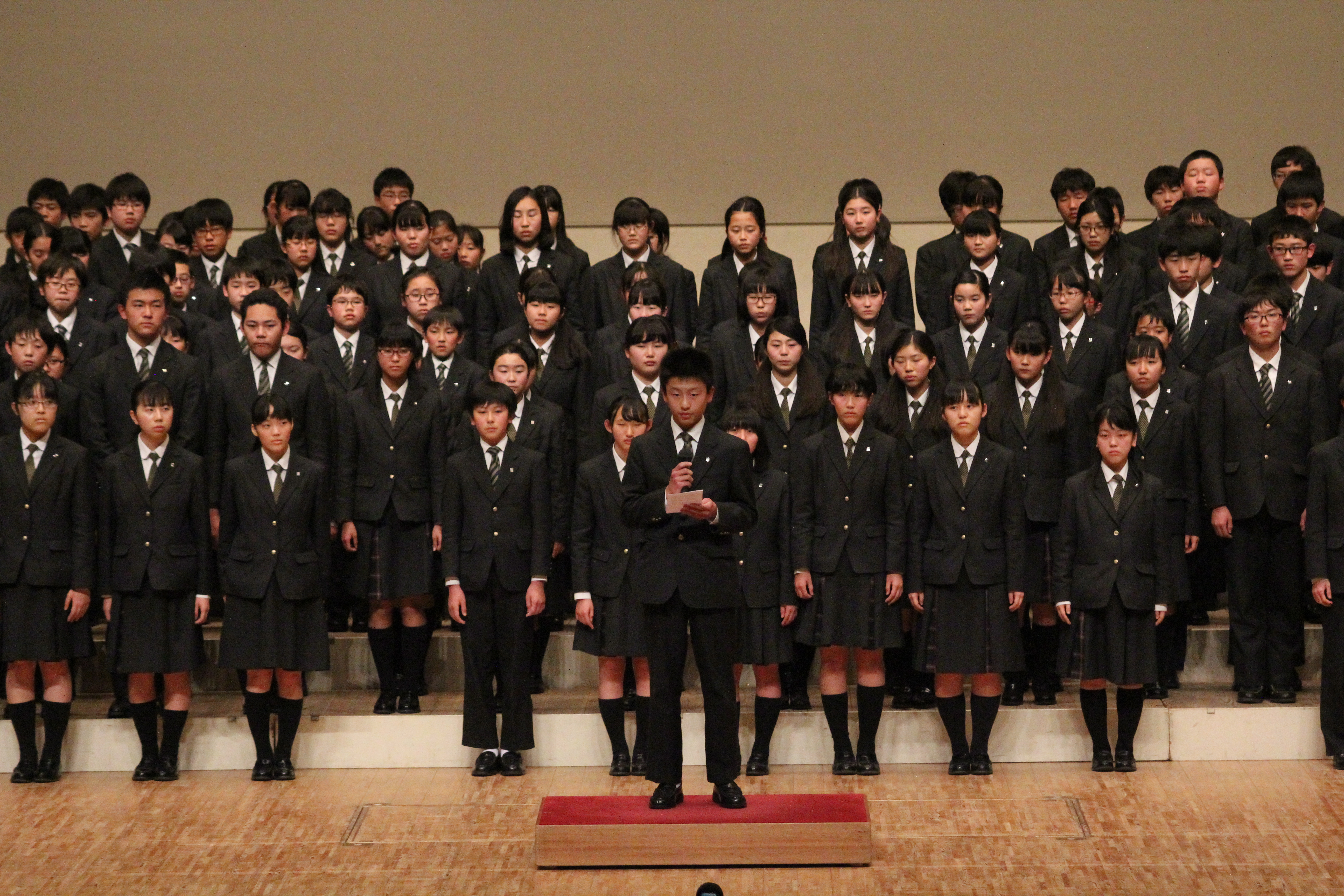 その後全員がステージに上がり、課題曲を全員合唱。最後に前生徒会副会長 遠藤優介君(3年1組)が、両親に対する感謝の気持ちや後輩たちにエールを送る「閉会の言葉」を述べ、今年のコンクールは無事に終了。ある保護者の方からは「2回目とあって昨年よりレベルが上がりましたね。」との声をいただきました。