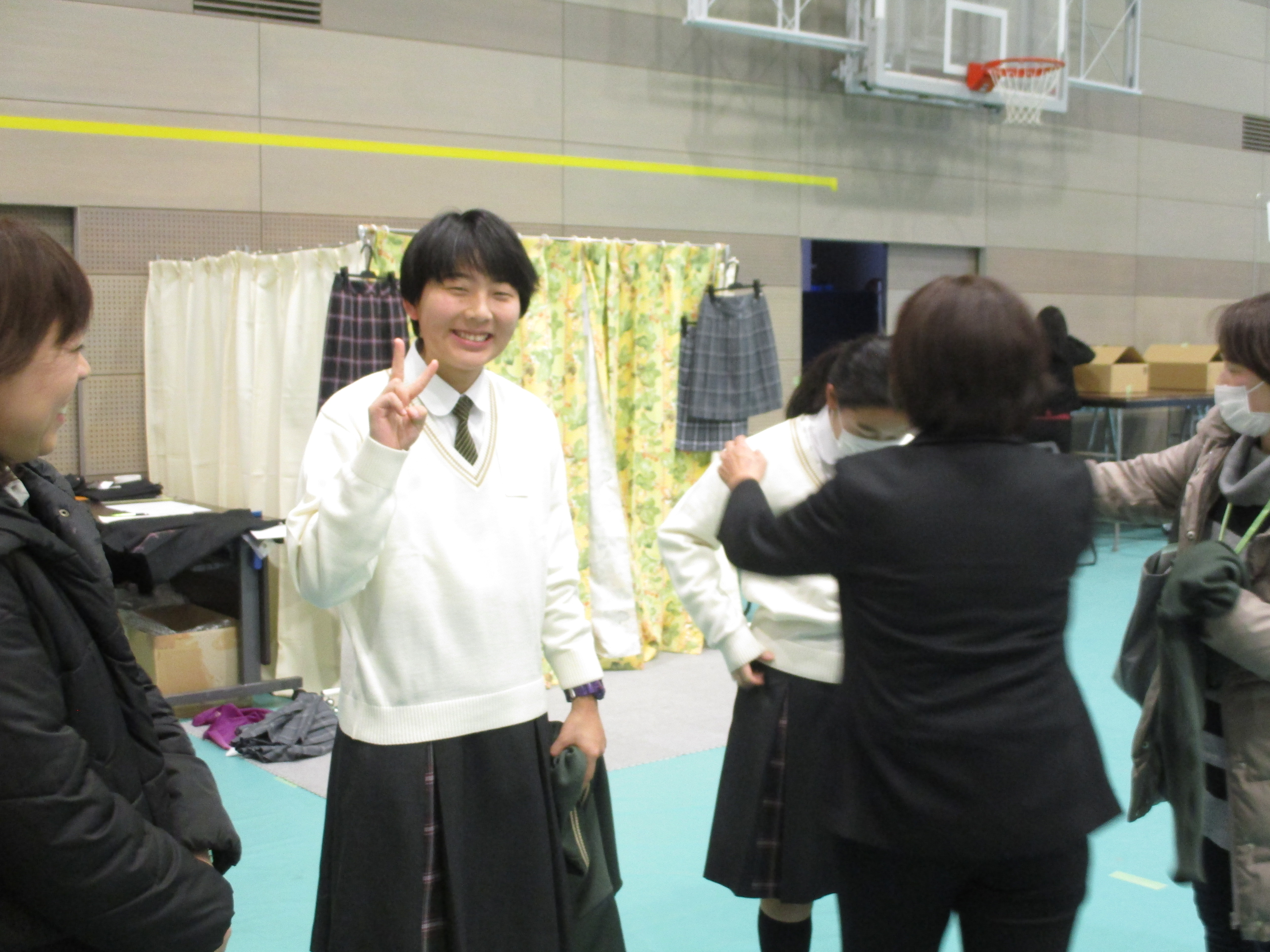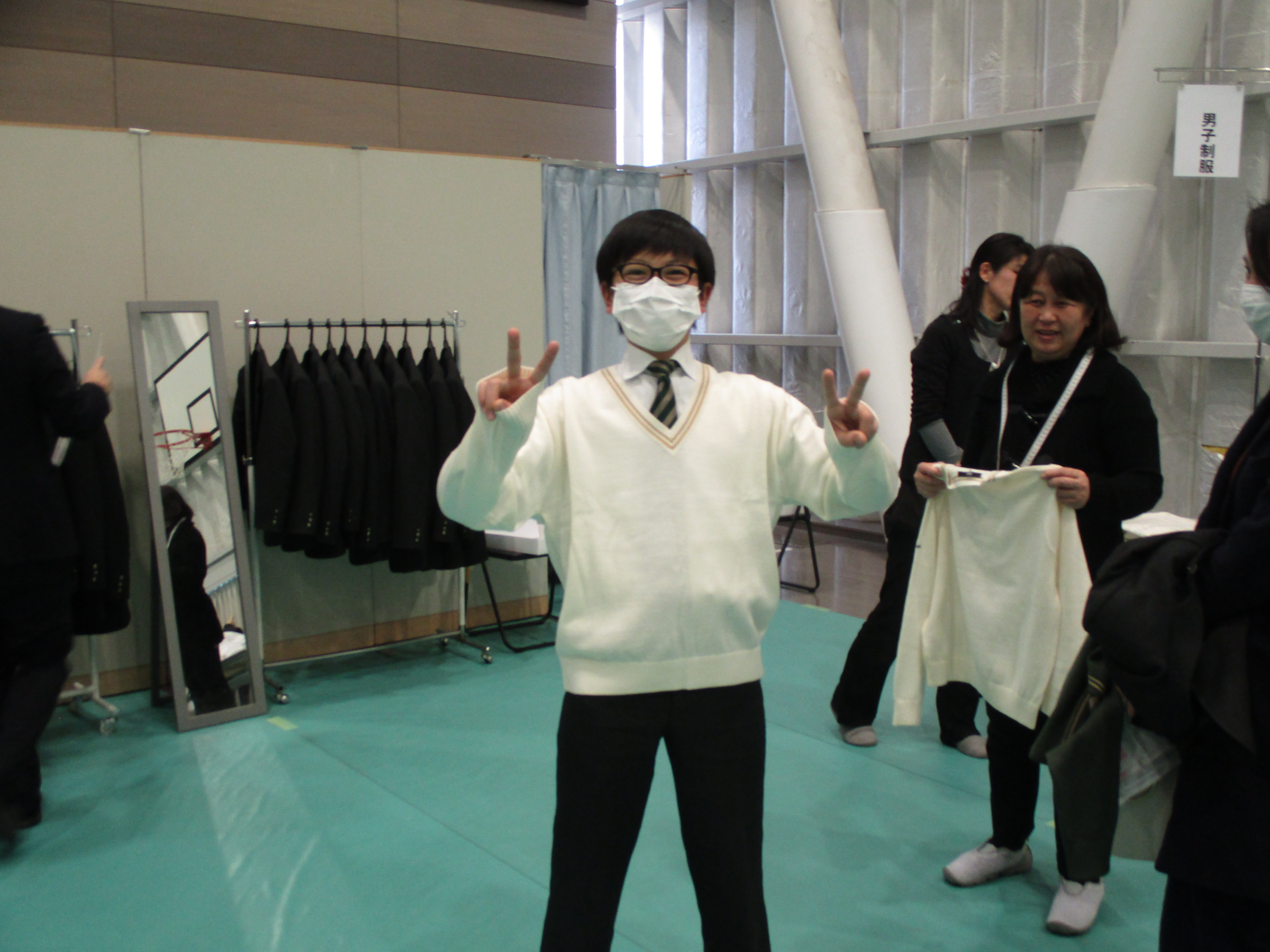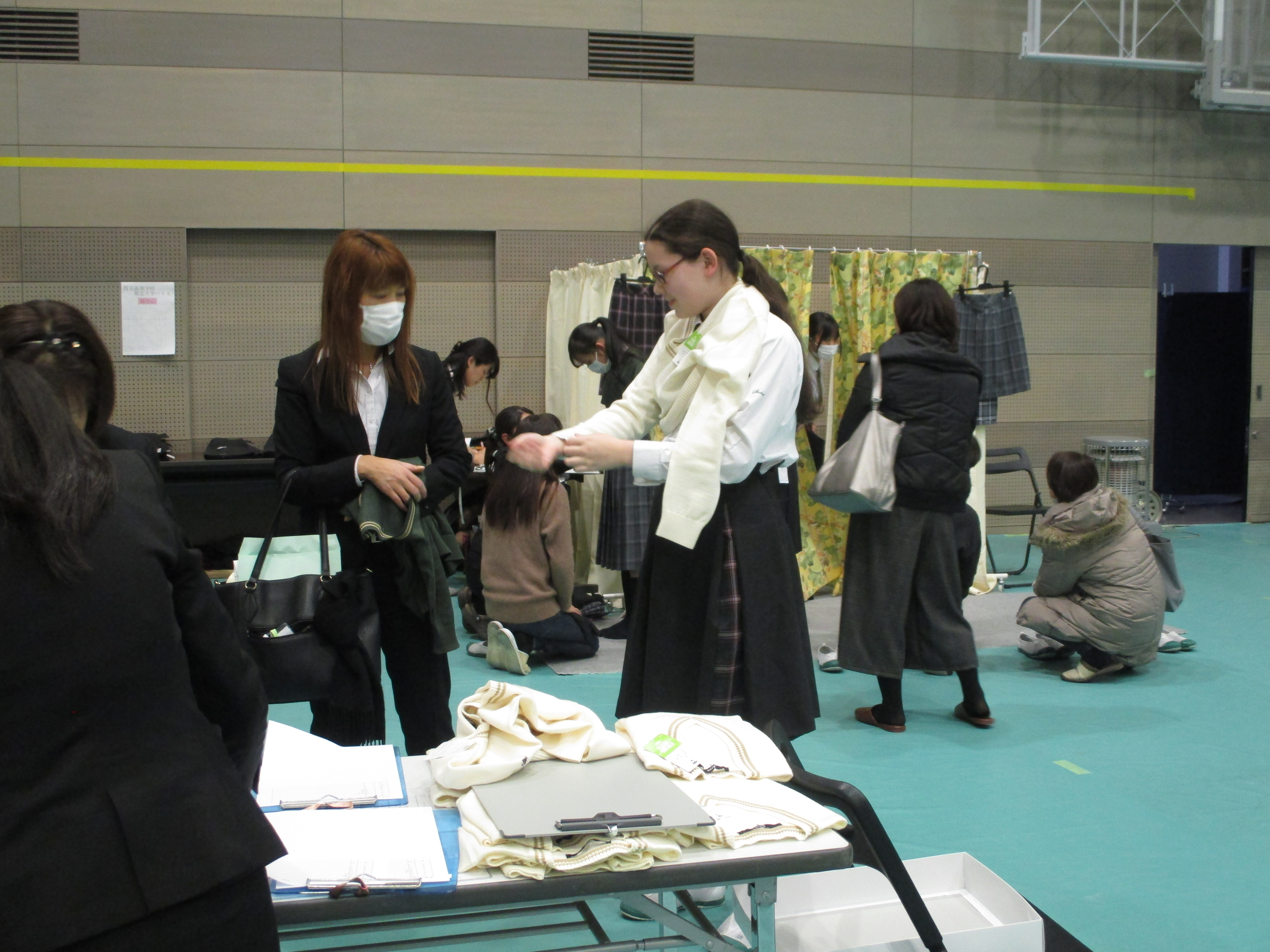 3年生の制服採寸の会が行われました。中学での3年間で身長も体格も大きくなり、一貫校なのでジャケットやスカート、ズボンのデザインは変わらないのですが、大きなサイズを試着していました。また、中学ではグリーンだったセーターはオフホワイトに変わります。オフホワイトのセーターに手を通した姿はグッと大人っぽく見えました。卒業まであと1ヵ月半。自宅に新しい制服が届くのが楽しみですね。