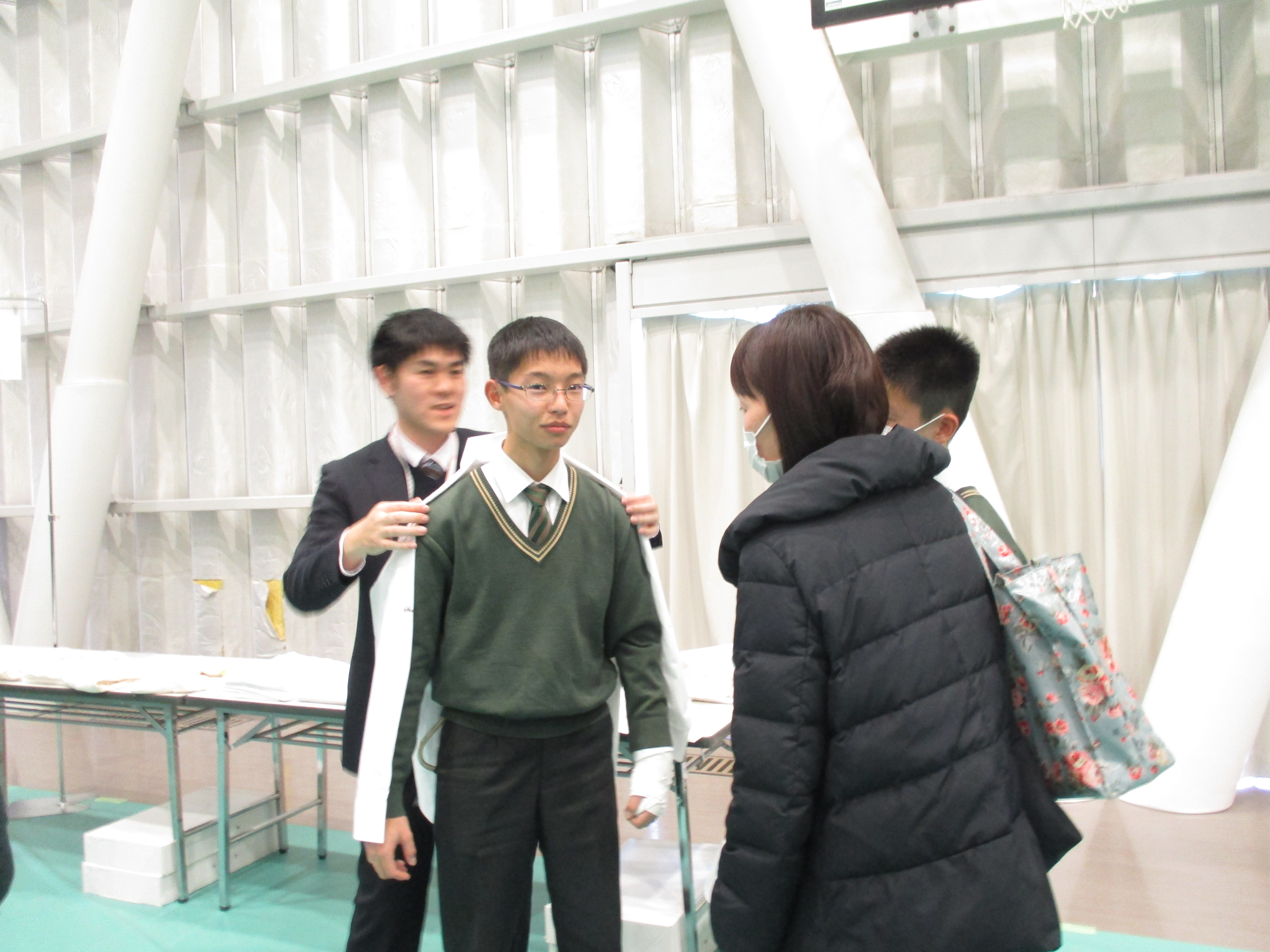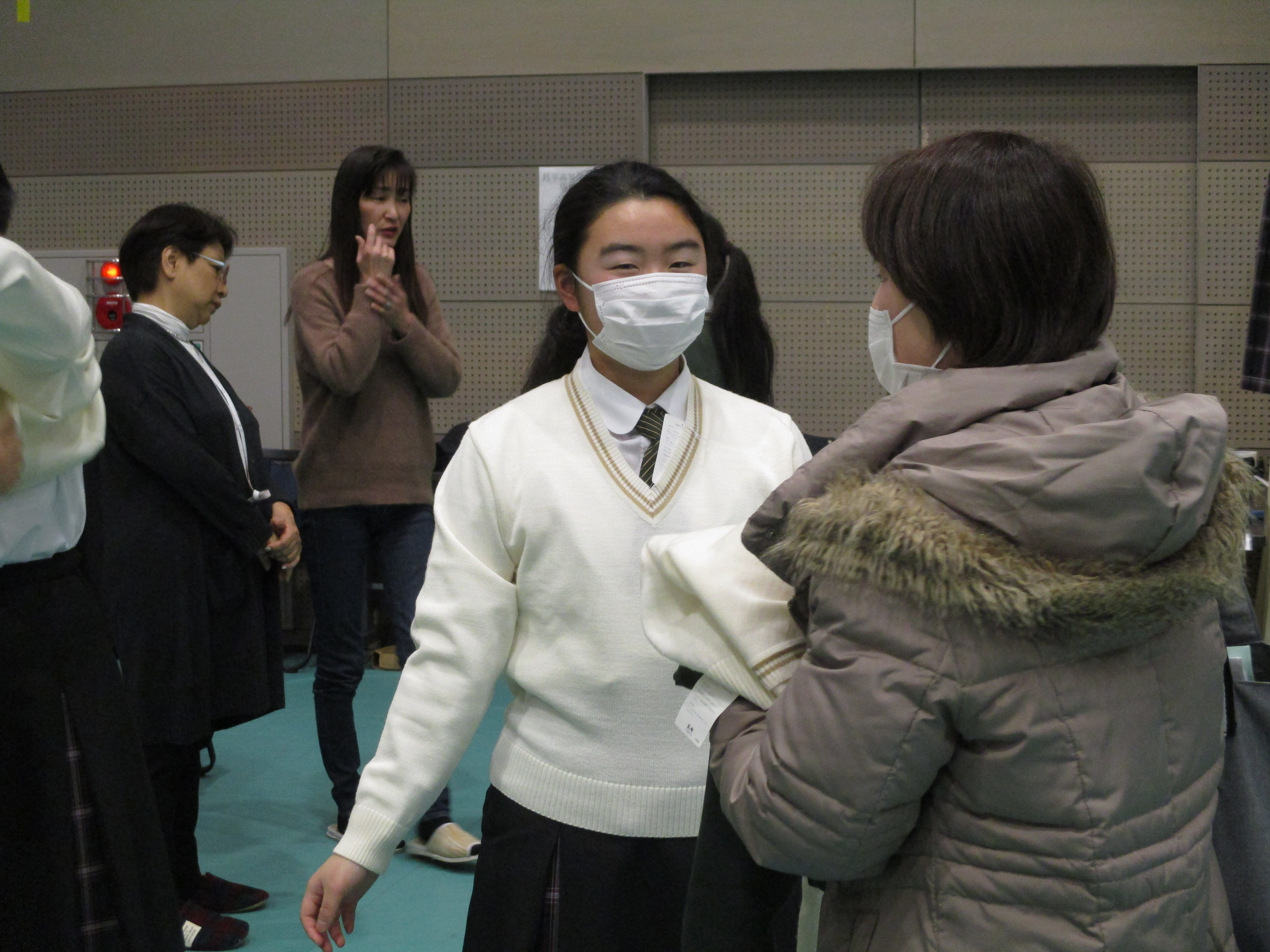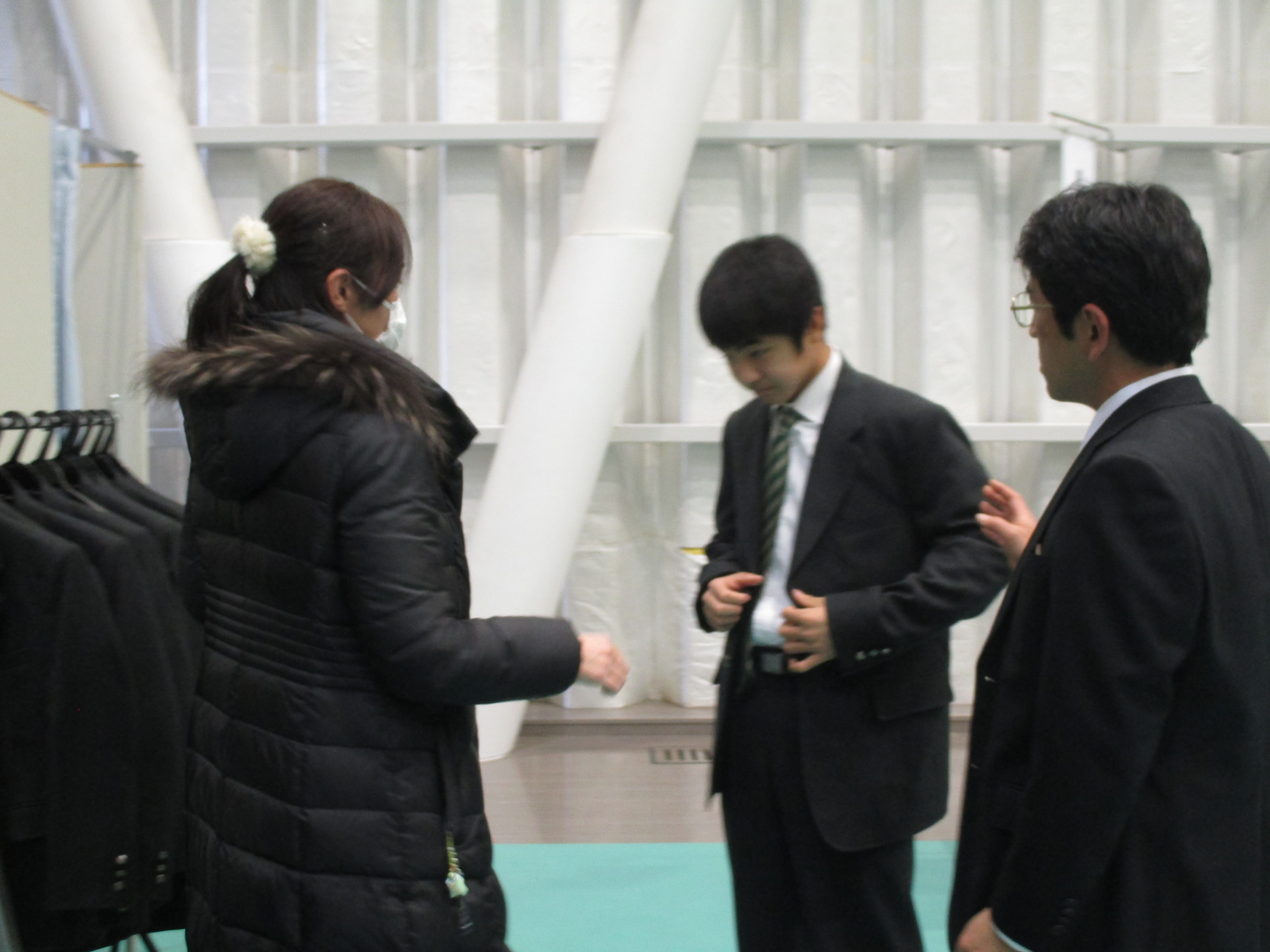 3年生の制服採寸の会が行われました。中学での3年間で身長も体格も大きくなり、一貫校なのでジャケットやスカート、ズボンのデザインは変わらないのですが、大きなサイズを試着していました。また、中学ではグリーンだったセーターはオフホワイトに変わります。オフホワイトのセーターに手を通した姿はグッと大人っぽく見えました。卒業まであと1ヵ月半。自宅に新しい制服が届くのが楽しみですね。