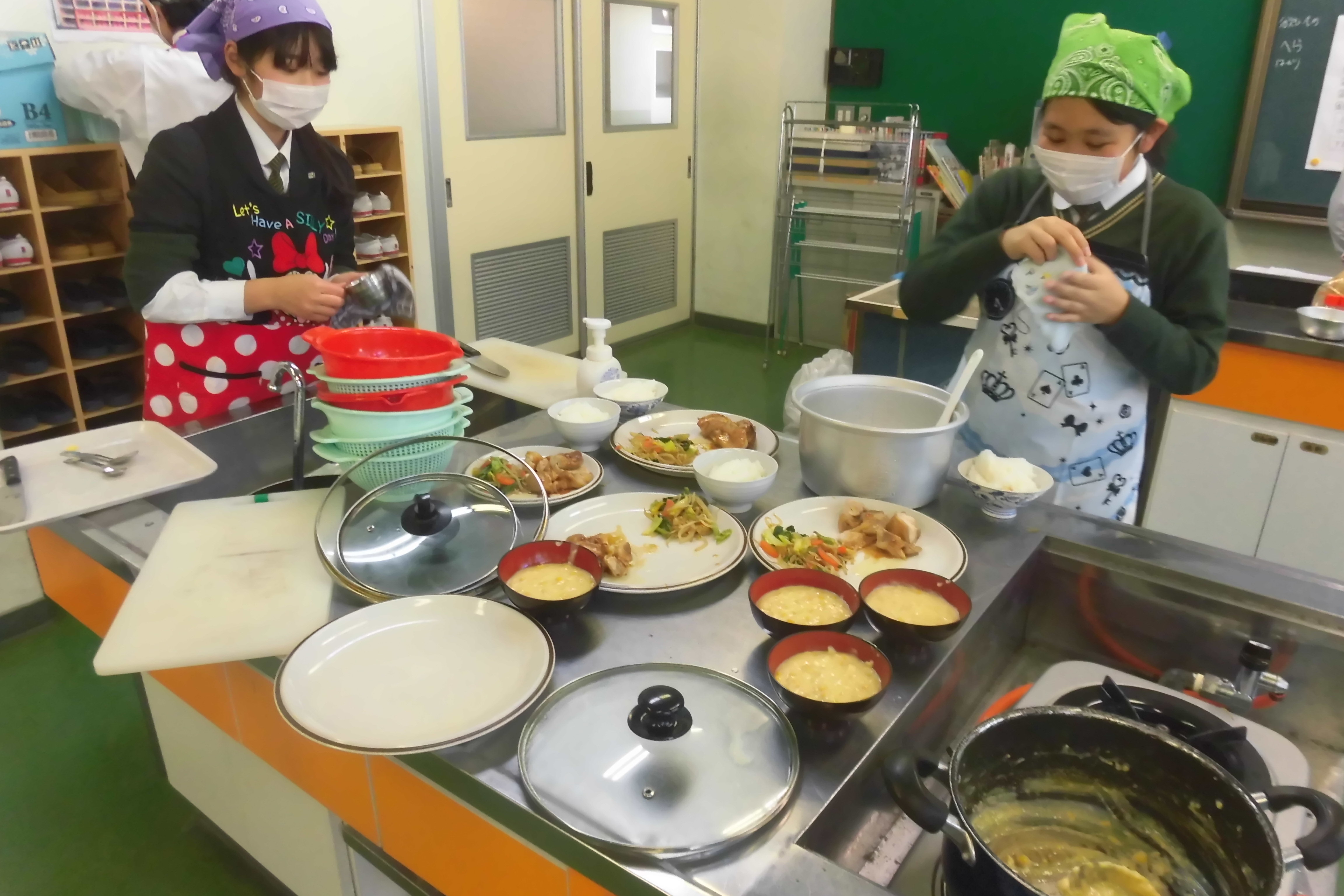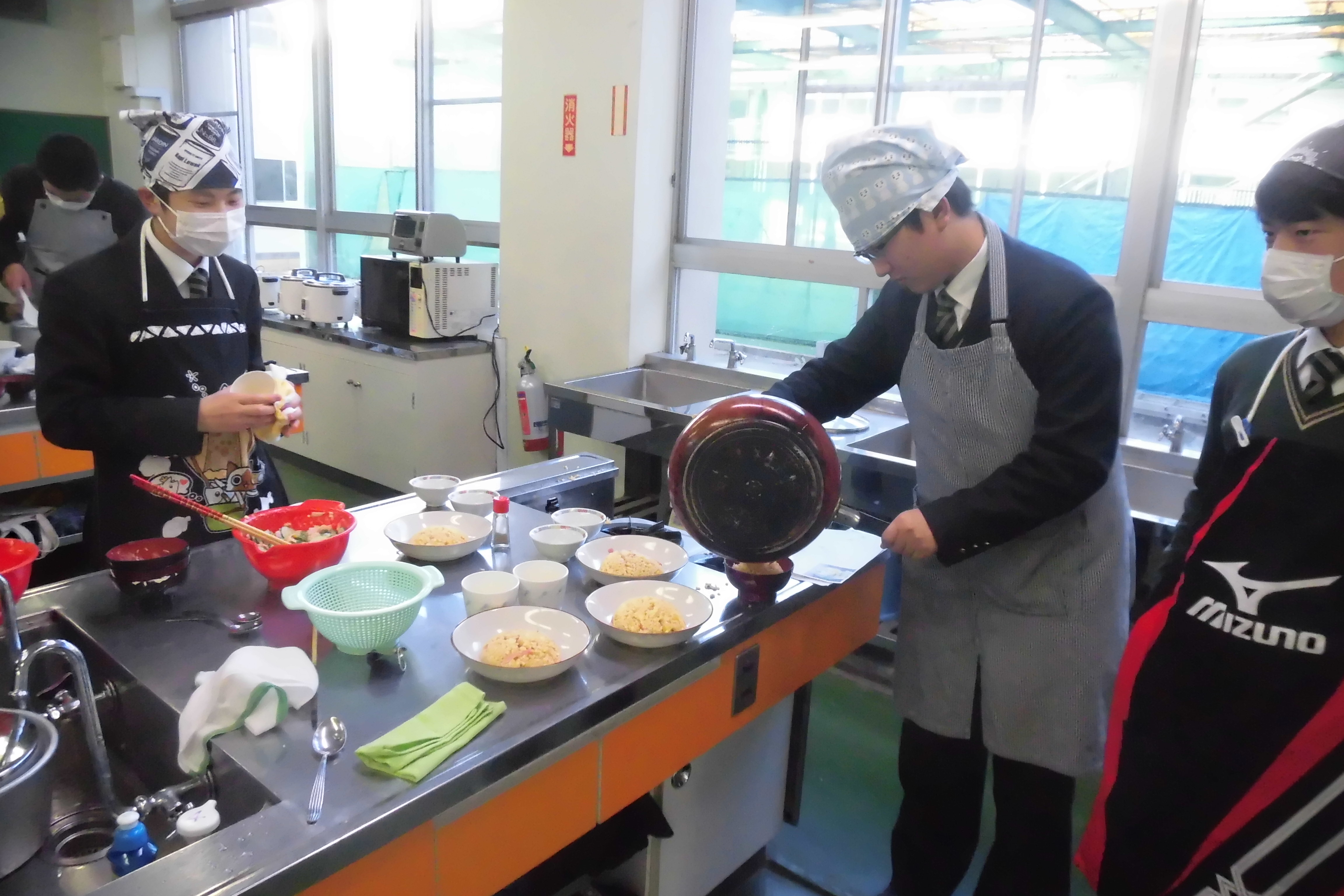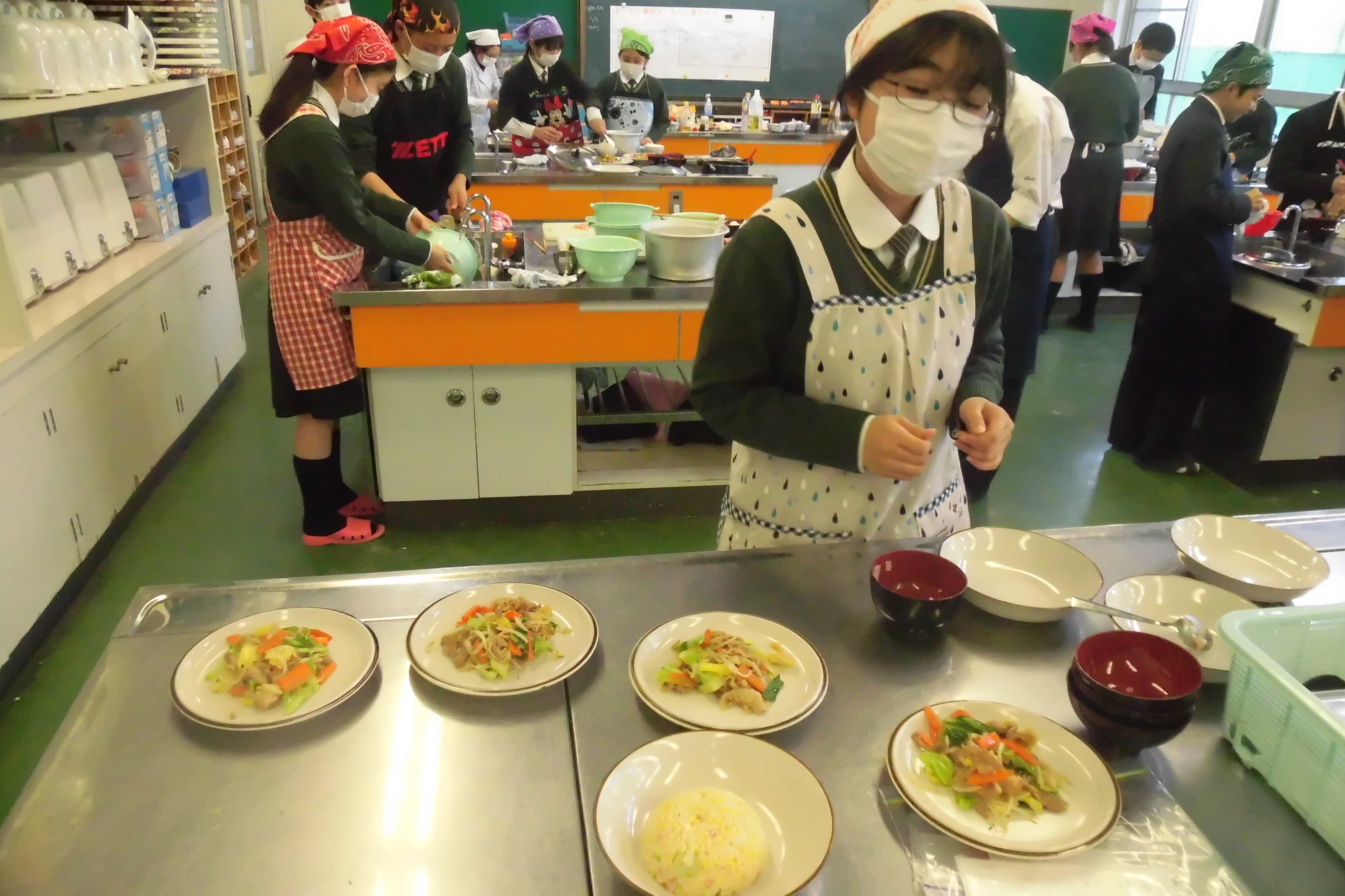 調理実習では決められたものを作るのではなく、さばの味噌煮、ひじきの煮物、生姜焼き、ほうれん草とベーコンのソテー等、自分たちで考えた献立をもとに作りました。「中学生の昼食」としてふさわしく、かつ限られた時間内に調理できるかを考え、調理方法を事前にまとめた上で調理しました。うまく進められた班も進められなかった班もありますが、調理実習のあとは振り返りを行い、レポートにまとめます。