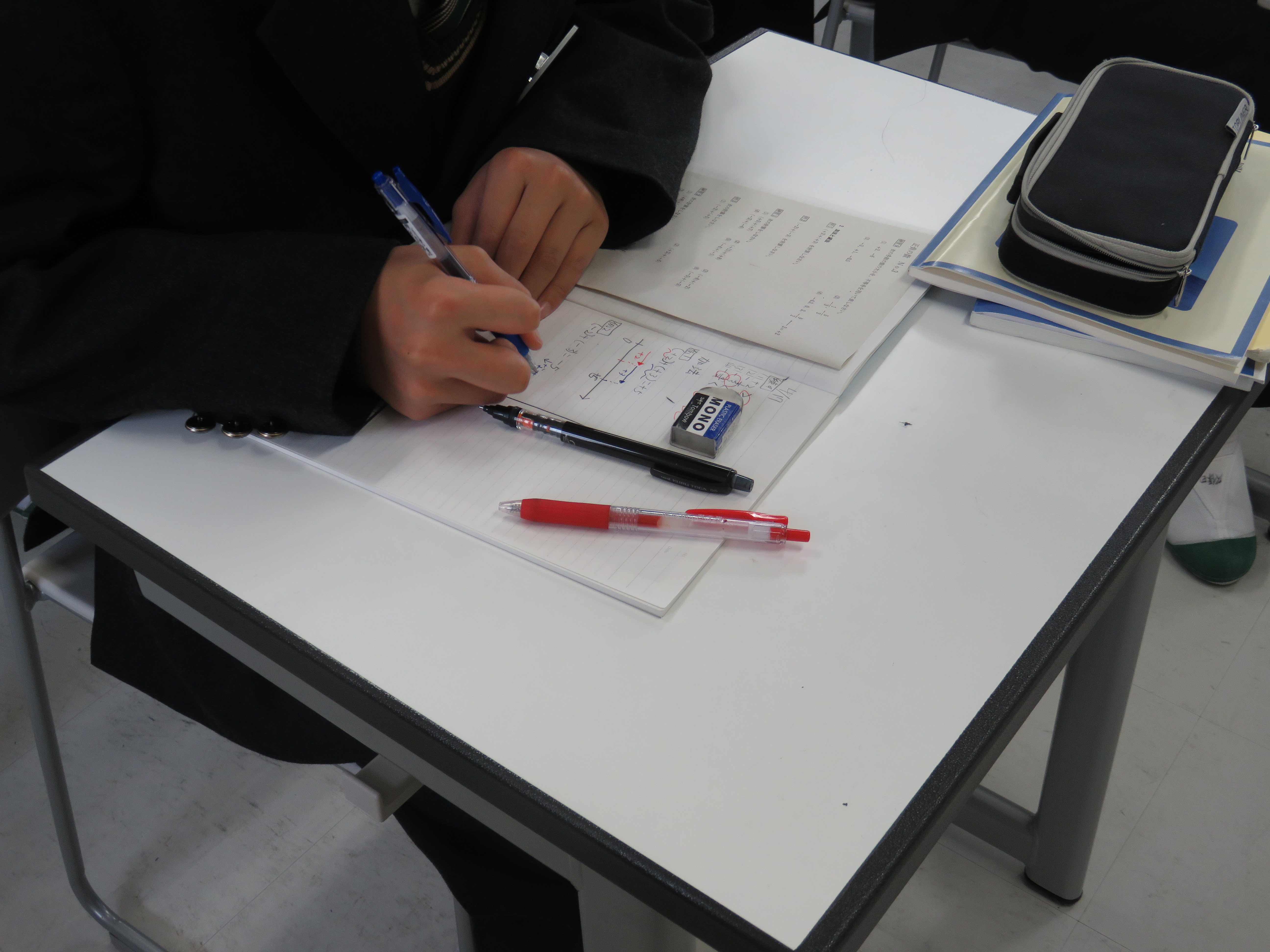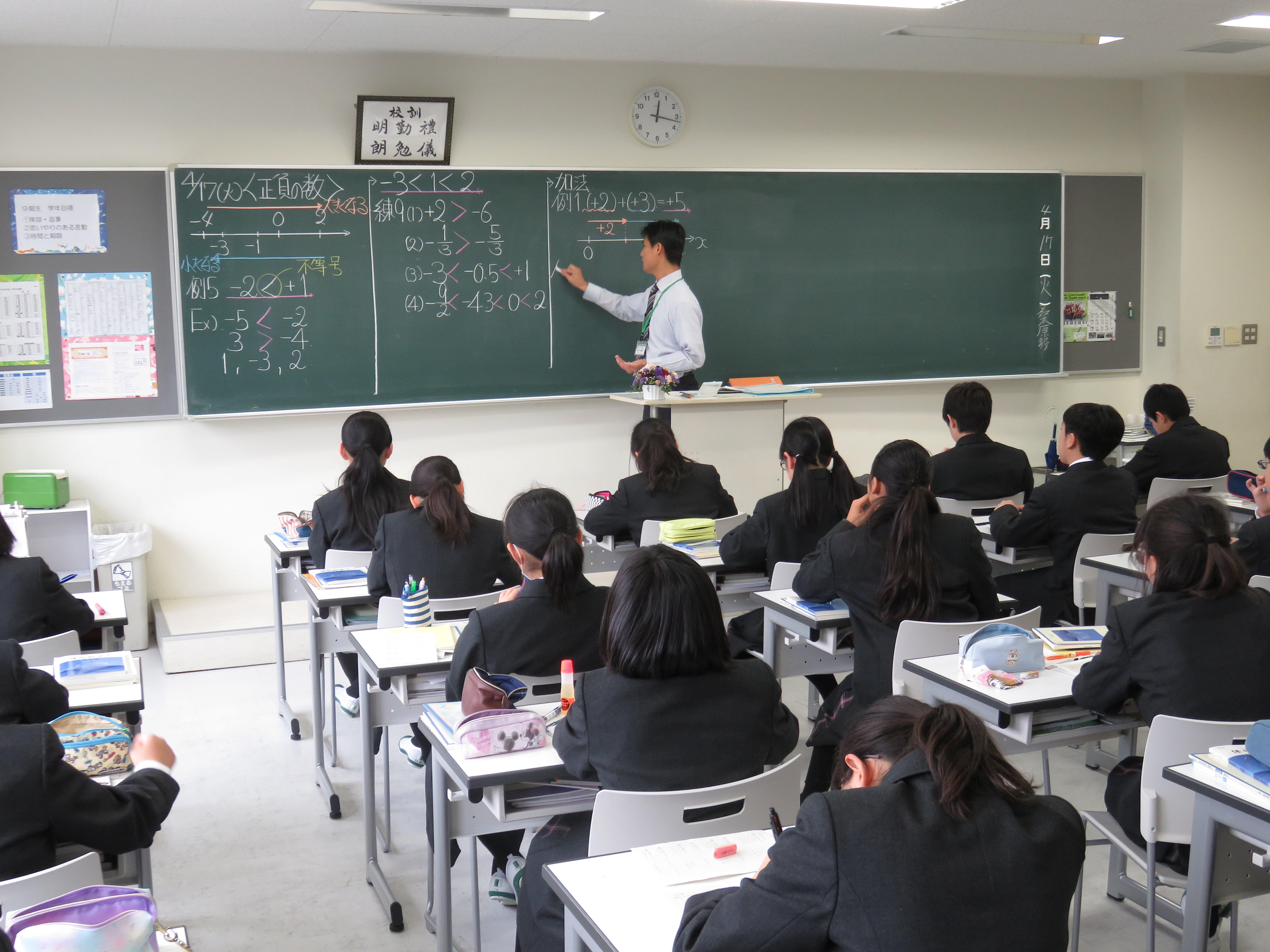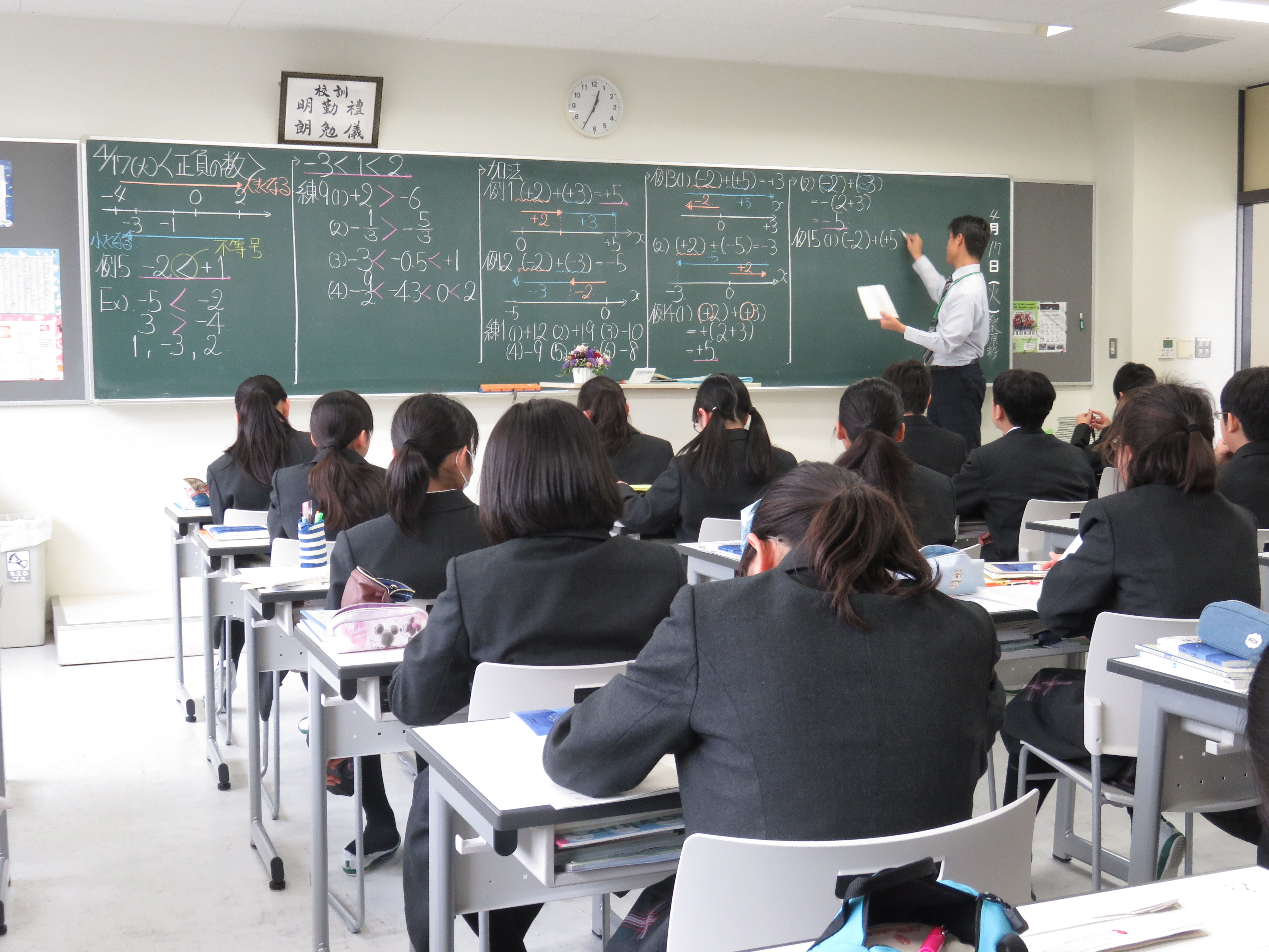 今日は、「数学」の学び始めの「正負の数」です。(+2)+(+3)が、どうして(+5)になるのかを、数直線を使って「算数」と「数学」の考え方の違いを説明しました。