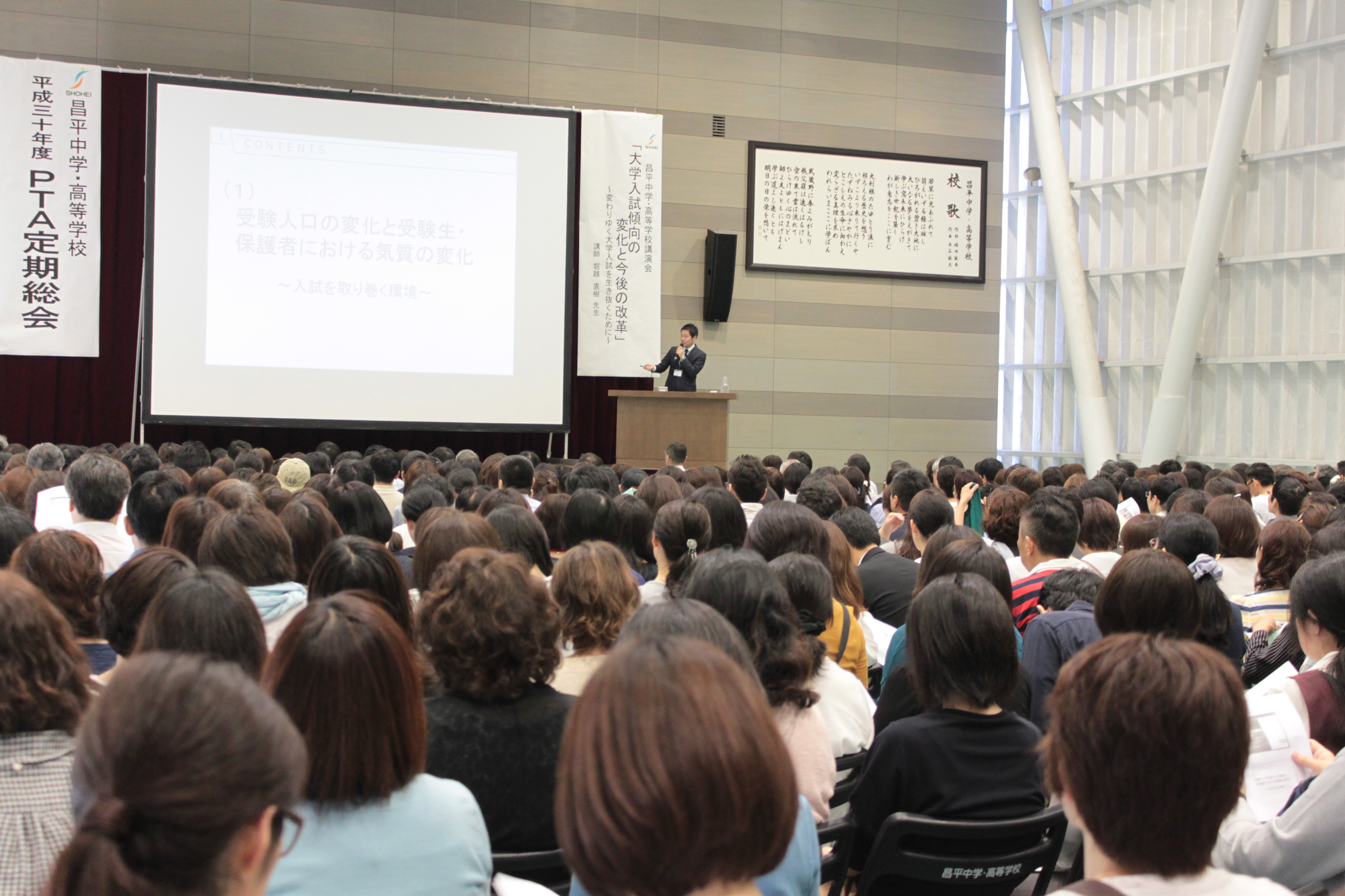 続いて、サブアリーナで本校進路指導部長 堀越直樹による講演会を実施。過去最高の参加者の中、「大学入試傾向の変化と今後の改革~変わりゆく大学入試を生き抜くために~」と題し、2020年から開始される新しい大学入試の改革点とそれに向けての対応、本校がとっていく対策等が話されました。保護者の皆さんが熱心に耳を傾けておられる姿が印象的でした。