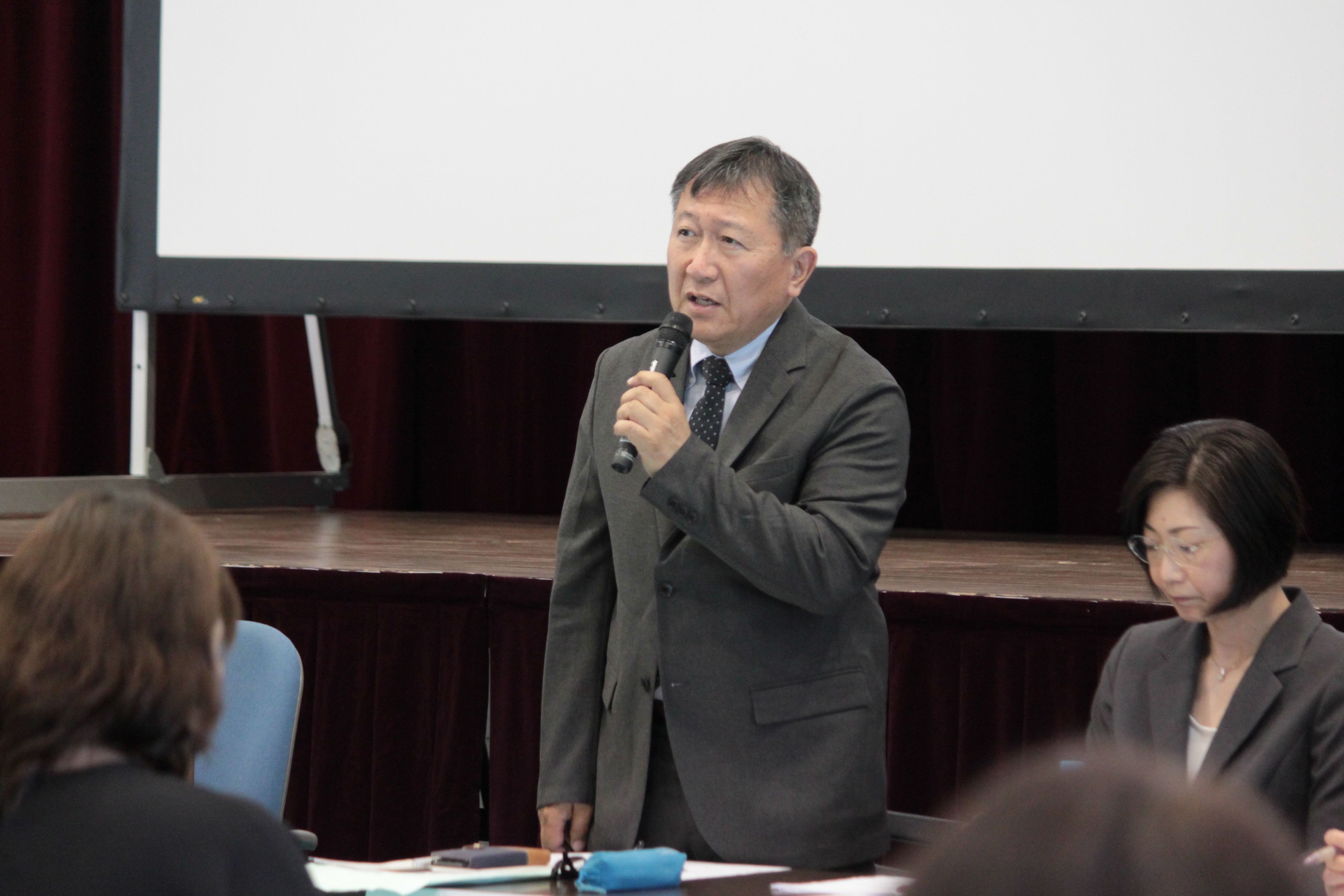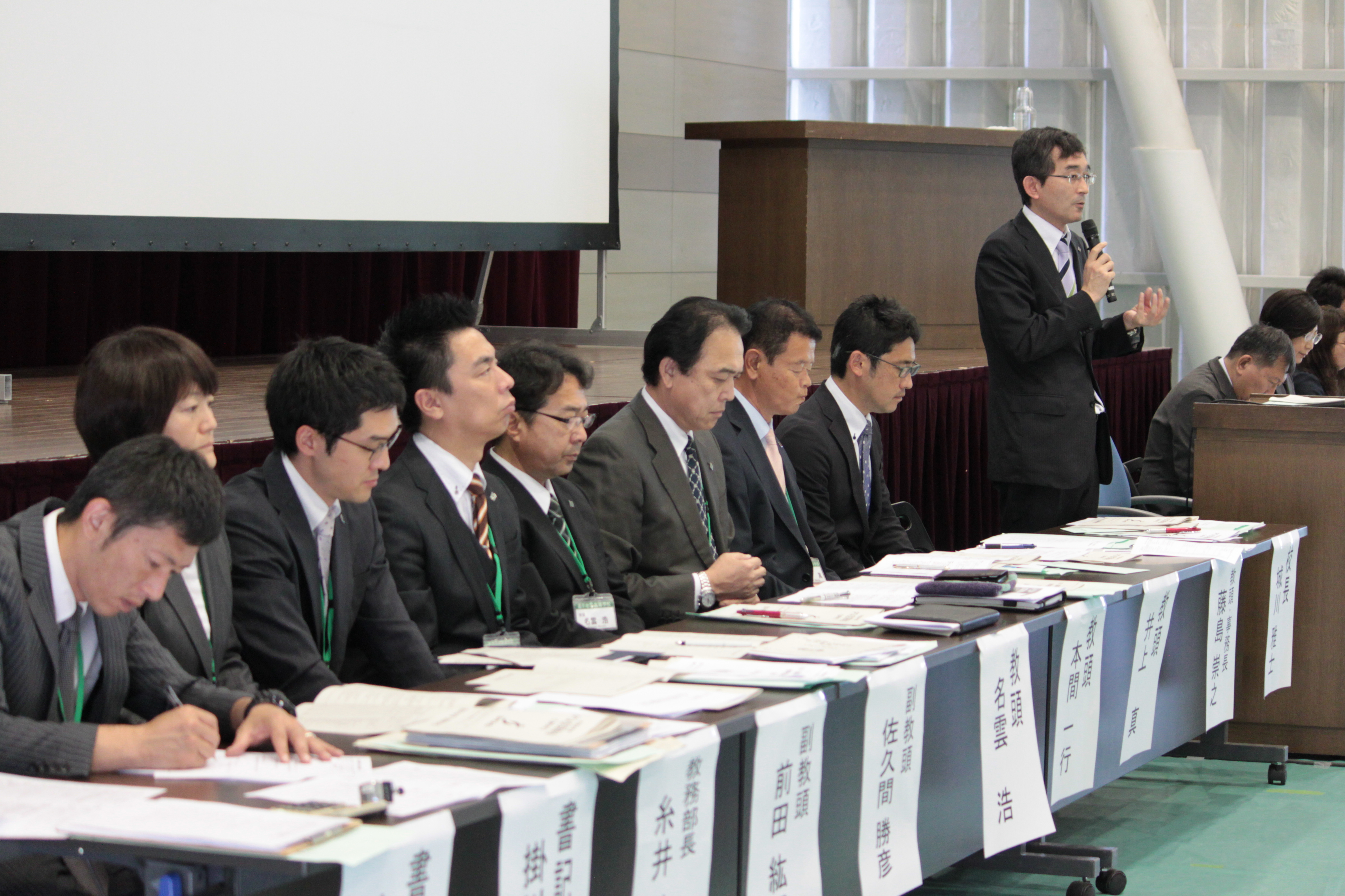 休憩を挟んで、PTA総会の開催。八鍬一生PTA会長の挨拶の後、平成29年度活動報告・決算報告、30年度役員選出、活動計画・予算等の審議、新役員の挨拶、旧役員への感謝状贈呈等が滞りなく進み、会は無事終了となりました。引き続き中学校ではIB教育推進後援会総会を開催。こちらもつつがなく審議が承認されました。