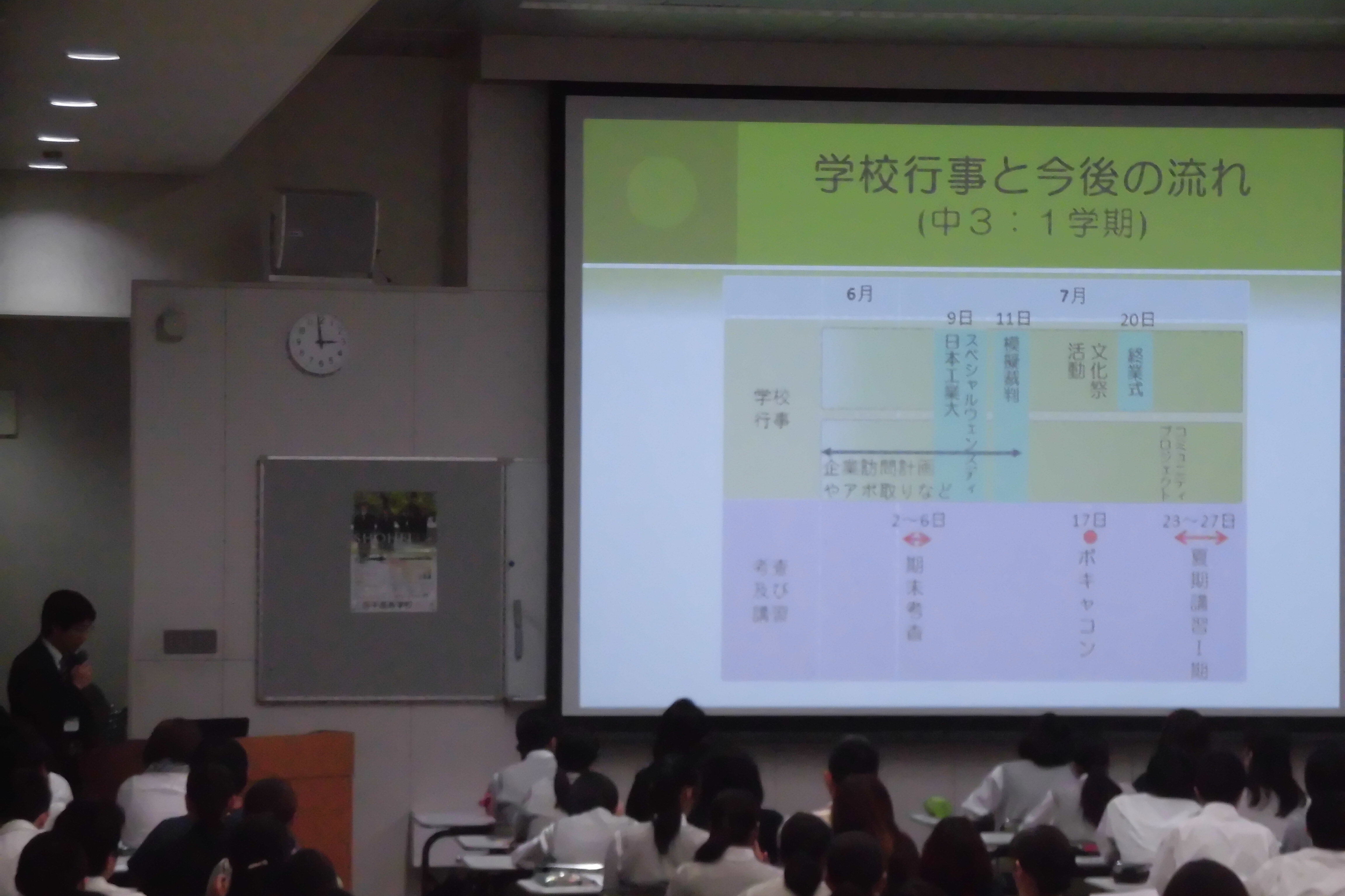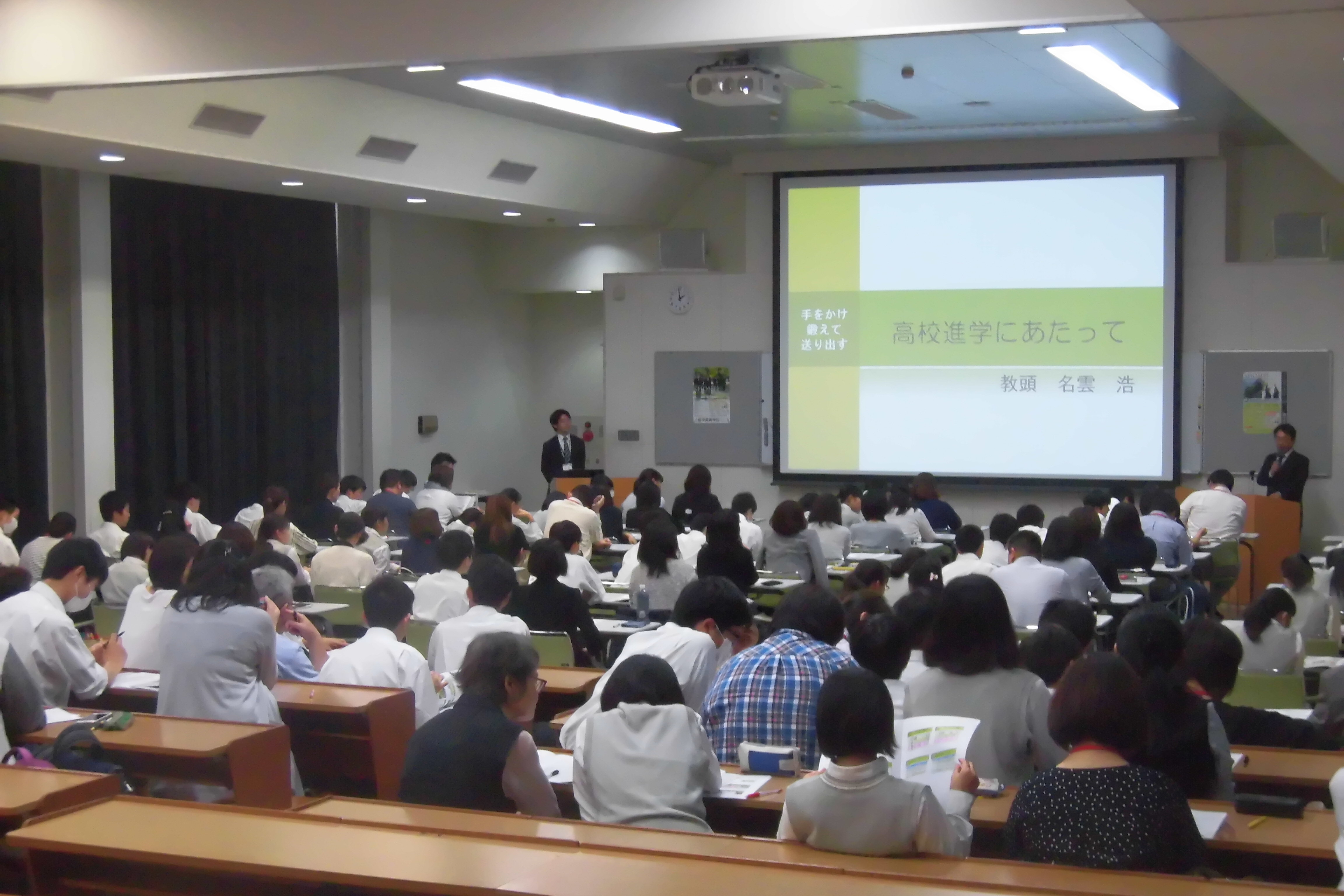 3年生の生徒と保護者が出席をして、高校への進学説明会が行われました。前田副教頭から来年度開設予定のIBコースに関する説明をし、その後に名雲教頭から高校生活での具体的な注意や中学とは異なる点などを話しました。最後に担任の志川よりこれまでの学習の様子と結果、そして今後のさらなる飛躍のための学習方法等の話がありました。振り返れば、保護者の方と生徒が肩を並べて座って話を聞くのは、昌平中学校に合格が決まった後に行われた新入生ガイダンス以来ですね。体も小さく、表情もまだ幼く不安げだったあの時から比べて、顔つきもすっかり大人になった3年生の姿に頼もしさを感じました。3月までの残りの中学校生活でしっかりと高校への準備をしなくてはなりませんが、この説明会で気持ちもさらに引き締めてまた頑張っていきましょう。