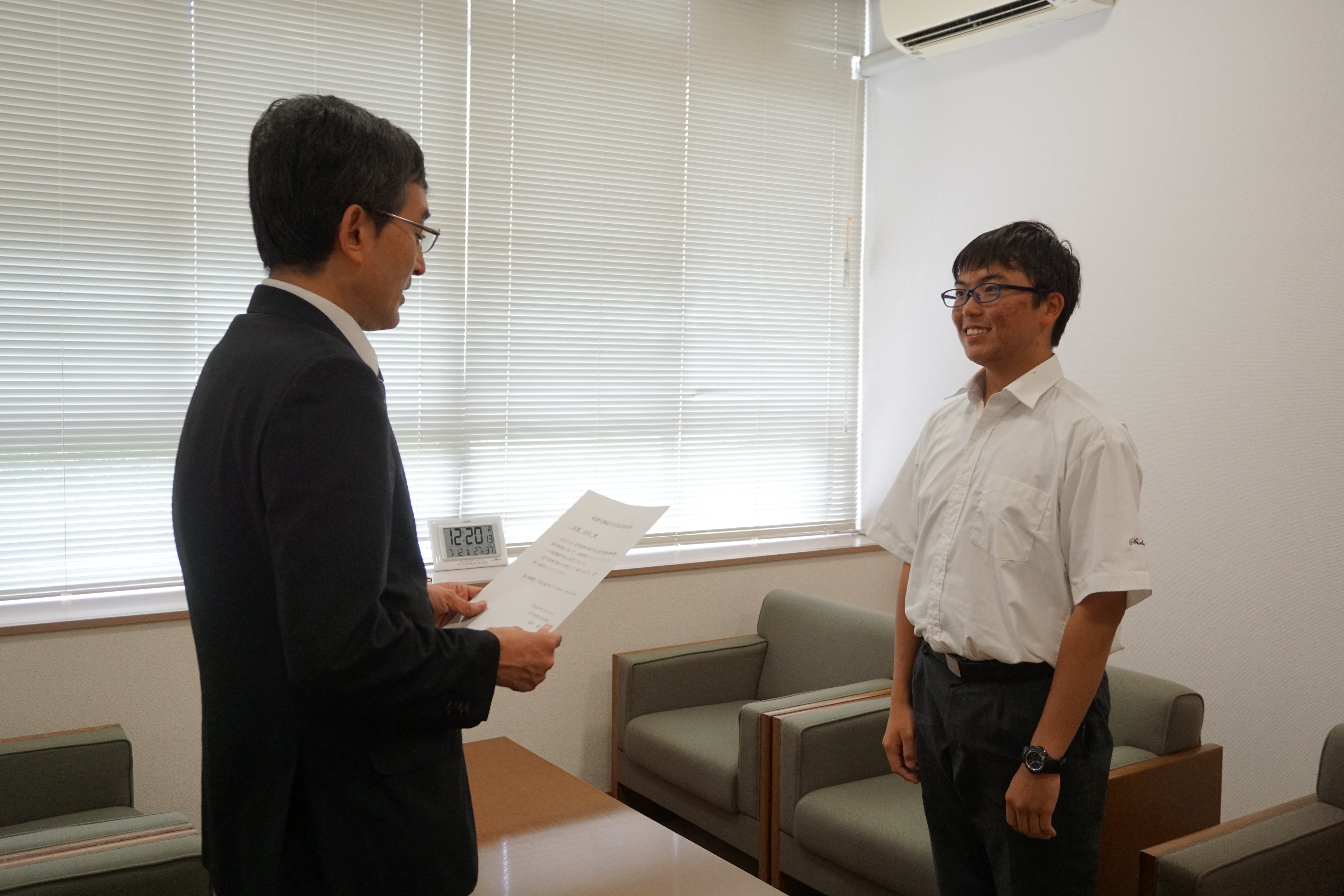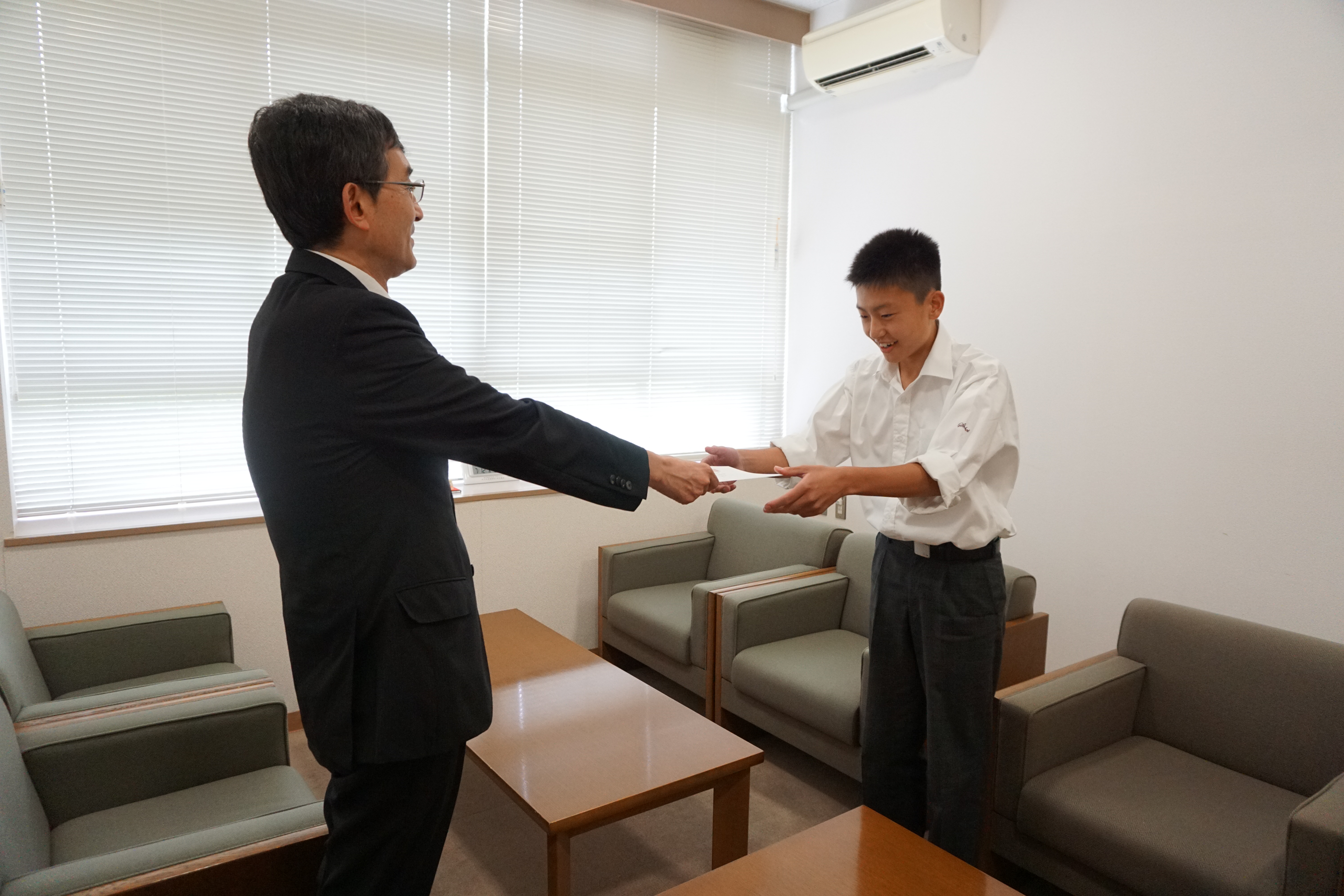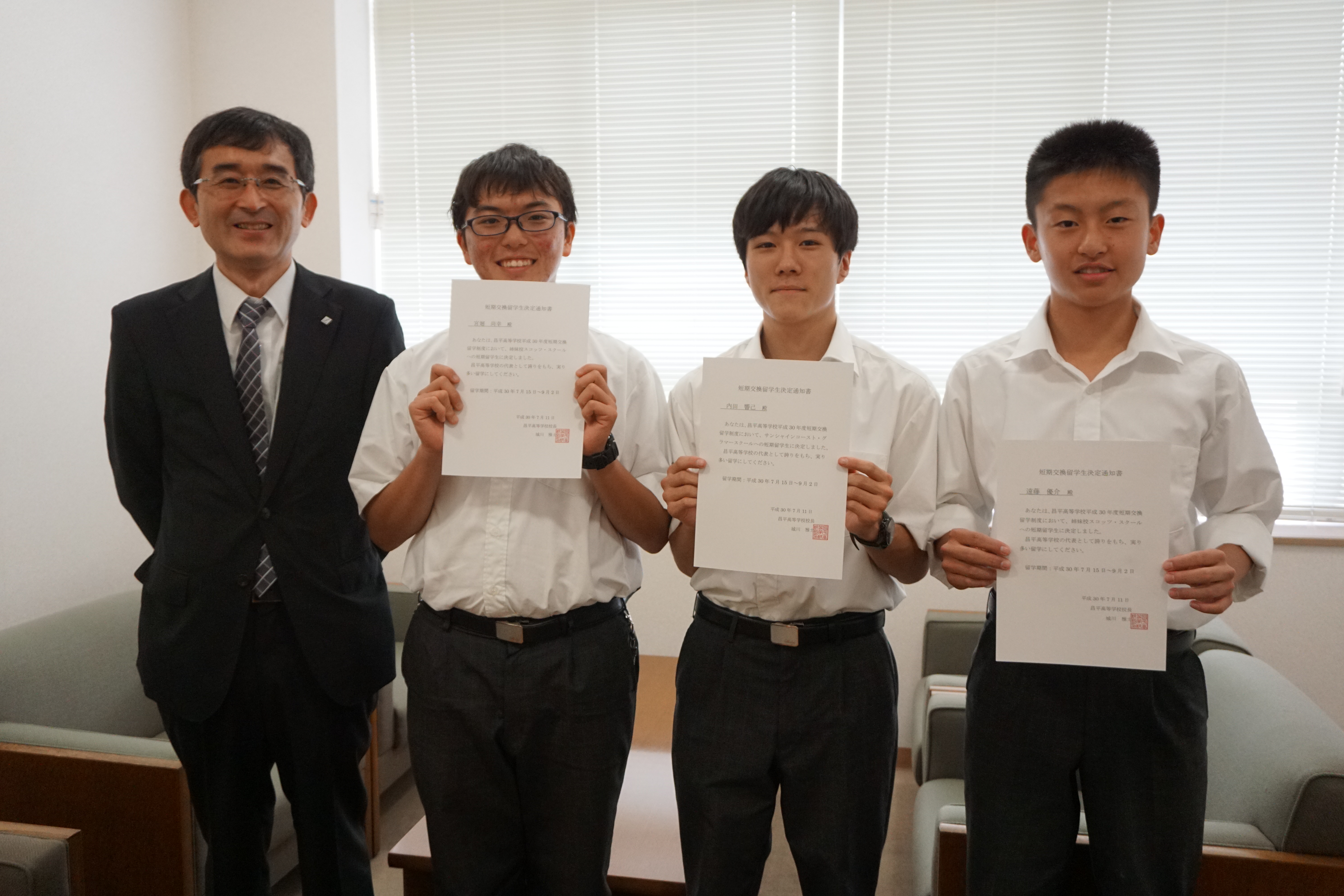 毎年オーストラリアの学校と高校生対象で交換留学を行なっています。今年も一貫生の先輩が2名、英語面接を経て姉妹校スコッツスクールへの留学が決まりました。6期生(高1)の遠藤優介君と宮廻尚幸君です。2人とも中学校のときから英語学習や英語で様々なことを伝えることに積極的に取り組んでいました。中学で培った英語力が約1ヵ月半という留学期間を充実したものにしてくれるでしょう。すぐそばに目標となる先輩方がいることは頼もしいですね。2人は留学期間中、ホームステイをしながら学校に通います。写真は認定式で校長先生から留学許可証と激励の言葉をいただいている様子です。