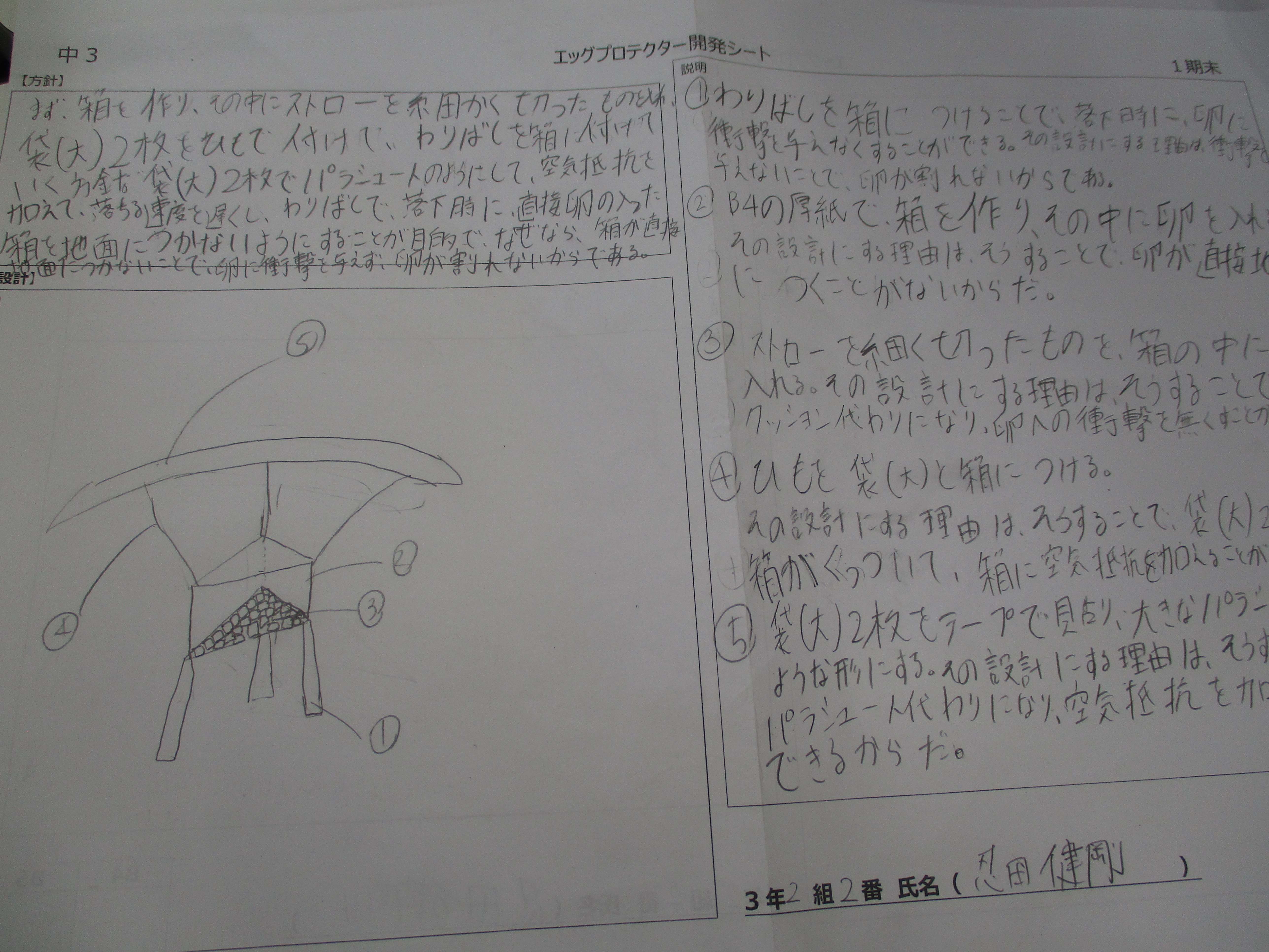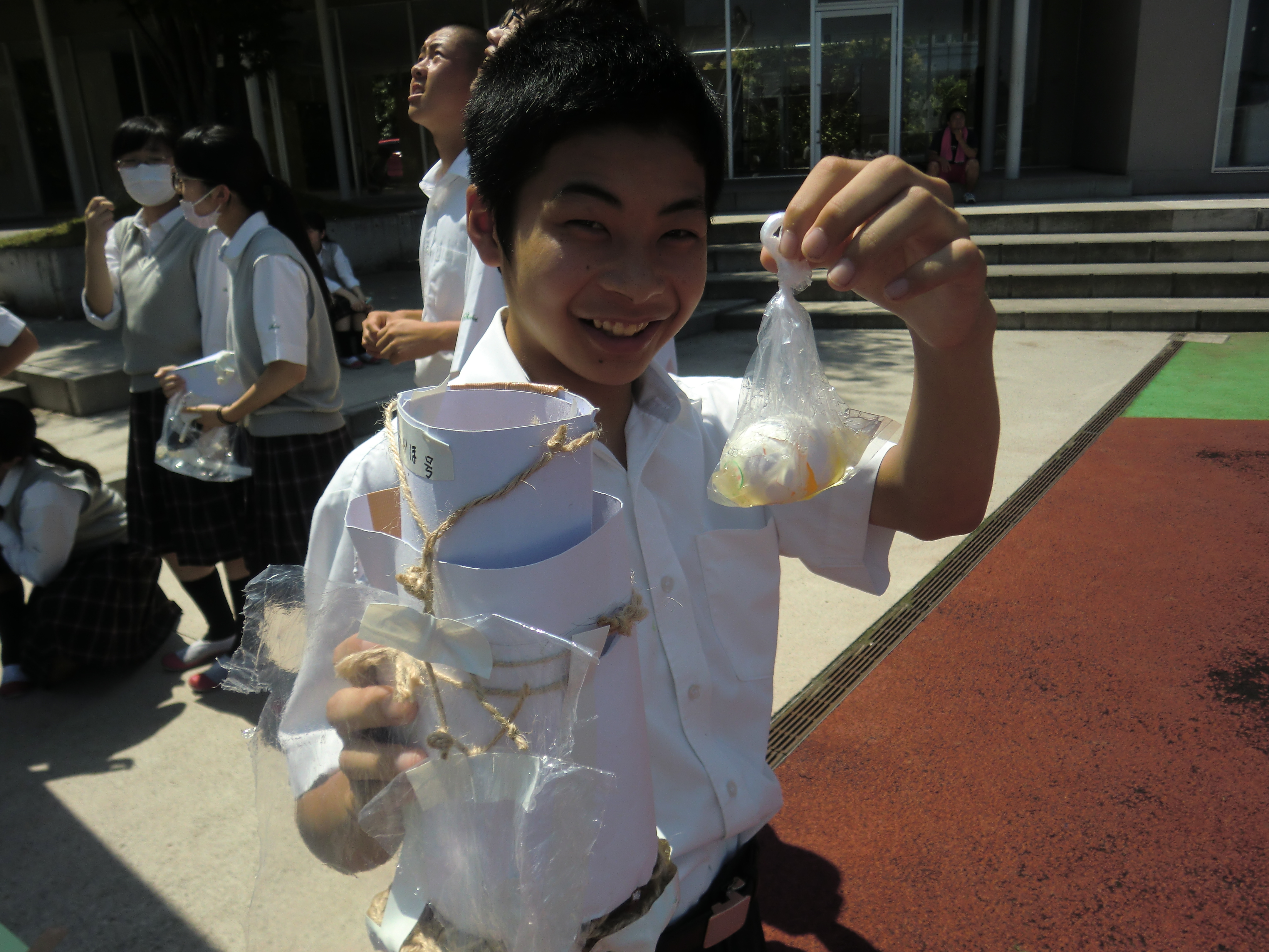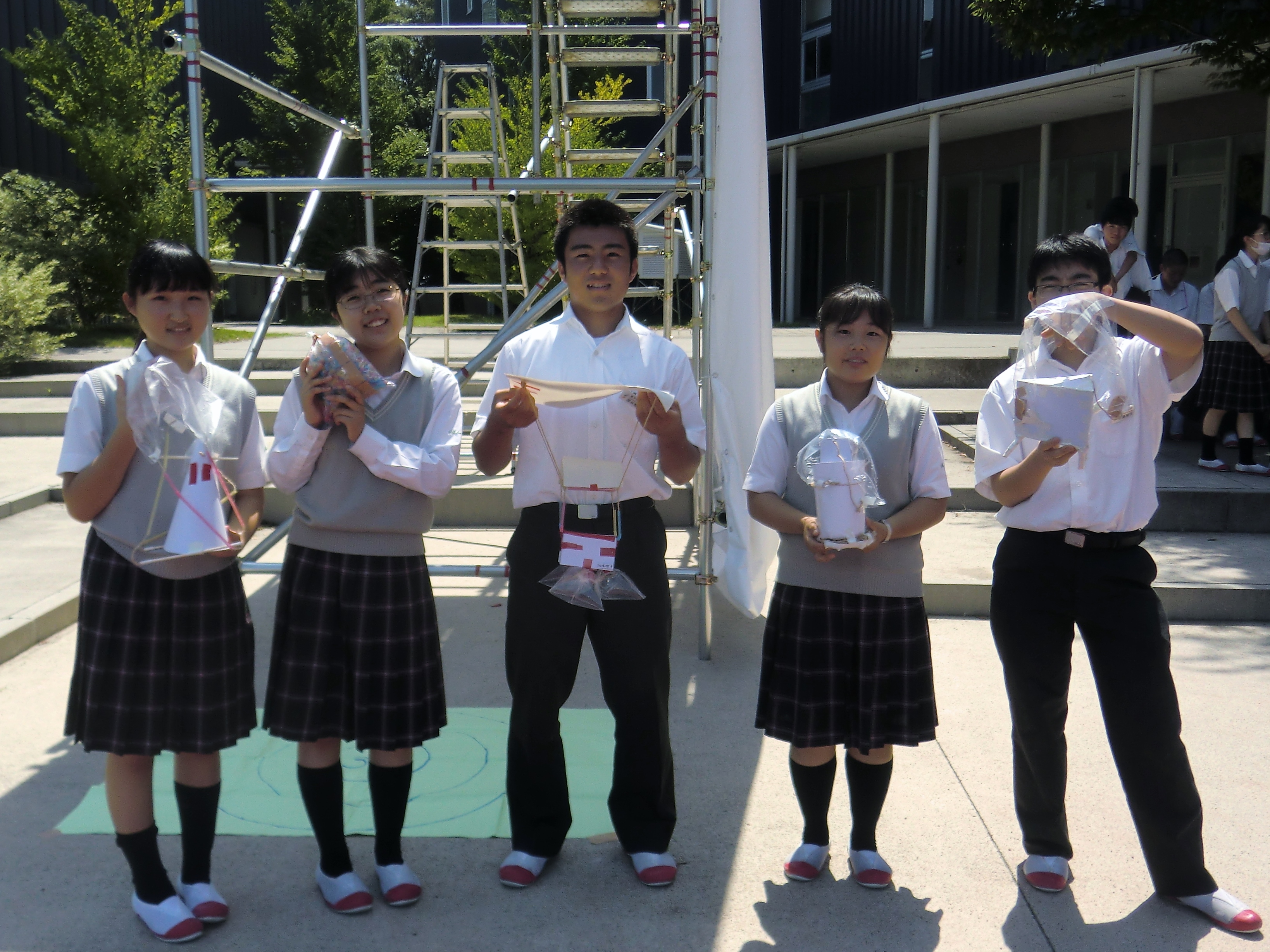 中学3年生は,物理の授業で落下運動について学んでいます。今日は、これまで勉強してきたことの集大成として、エッグドロップコンテストを行いました。エッグドロップコンテストとは、卵を保護するプロテクターを作成し、高所から落下させる競技で、世界中で親しまれている理科実験です。今回のコンテストでは、軽量性・正確性・安全性の3点を得点化し競い合いました。軽いプロテクターほど点数が高く、落下地点に書かれた的の中心近くに落下させるほど高得点になります。ただし、卵が割れたりヒビが入ってしまった班は失格になります。生徒たちはグループで議論し、様々なエッグプロテクターを製作してきました。落下速度の軽減するためにパラシュートを取り付ける班や、衝撃の吸収のために、紙でクッションを作る班など、創意工夫に満ちた様々なエッグプロテクターが出来上がりました。パラシュートが計画通りに開いて卵を無事に守れた班があった一方、空中でプロテクターが傾いてしまい、落下の衝撃から卵を守れず悔しい想いをした班もありました。これから生徒はコンテストの結果を振り返り、改善策を考えます。