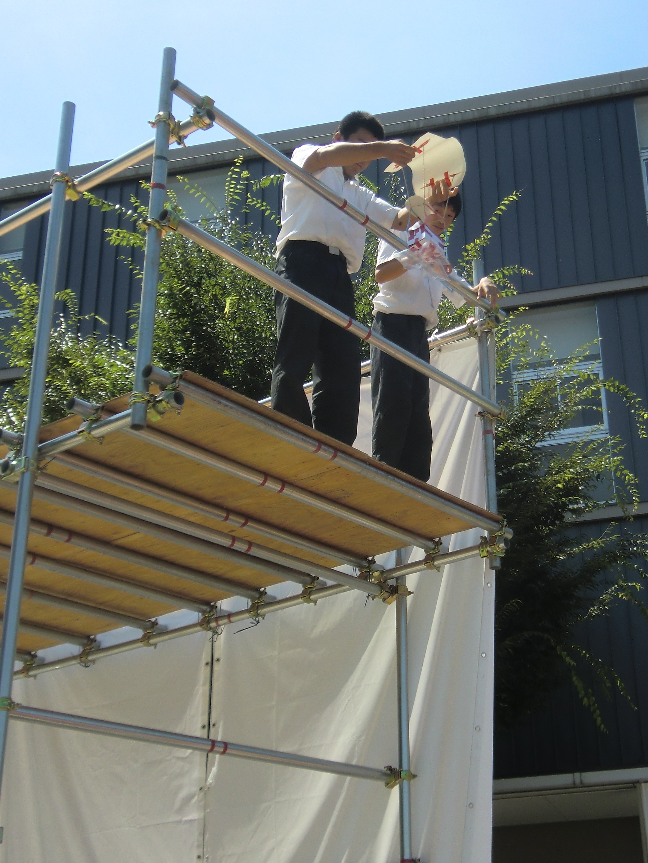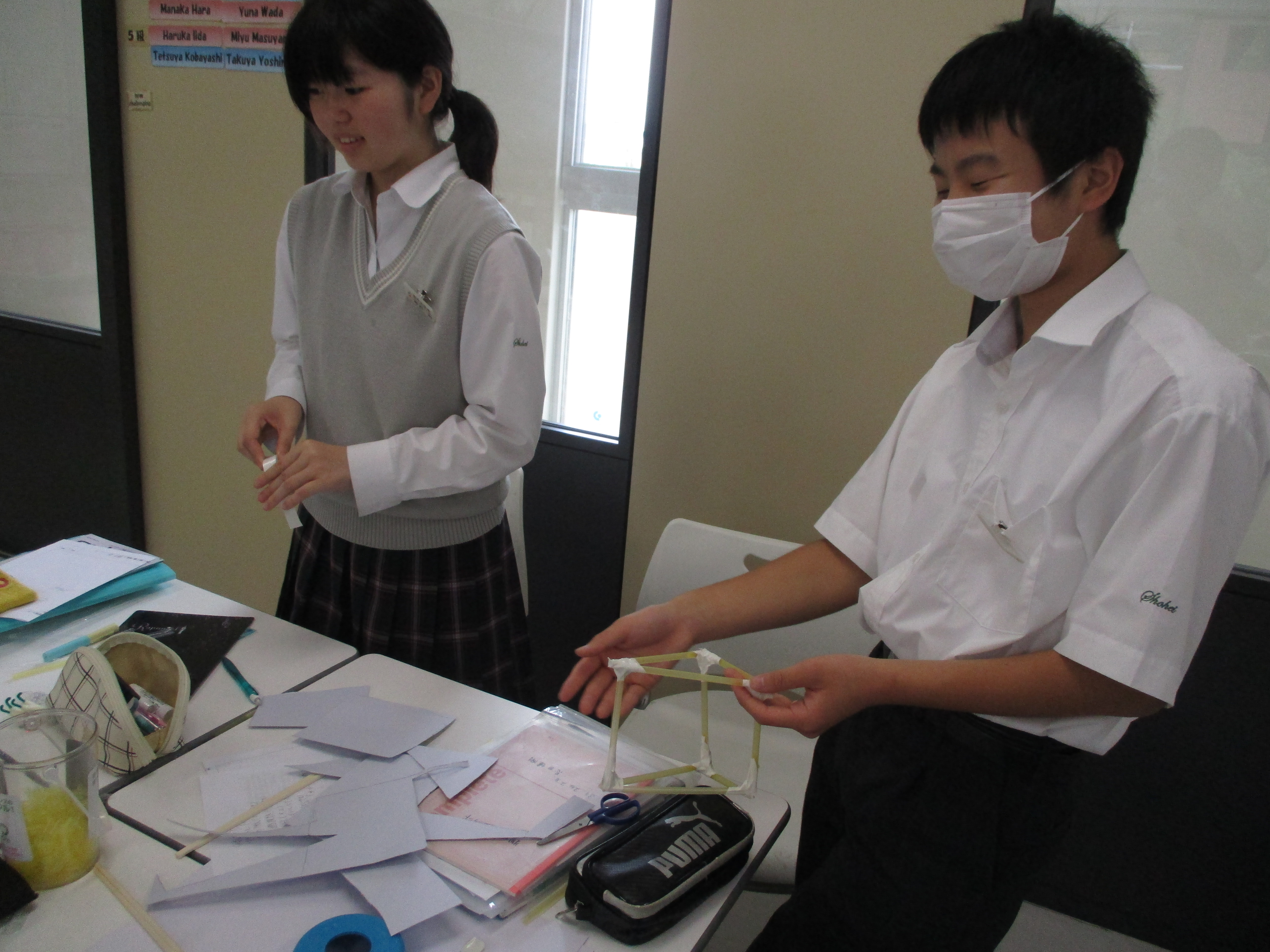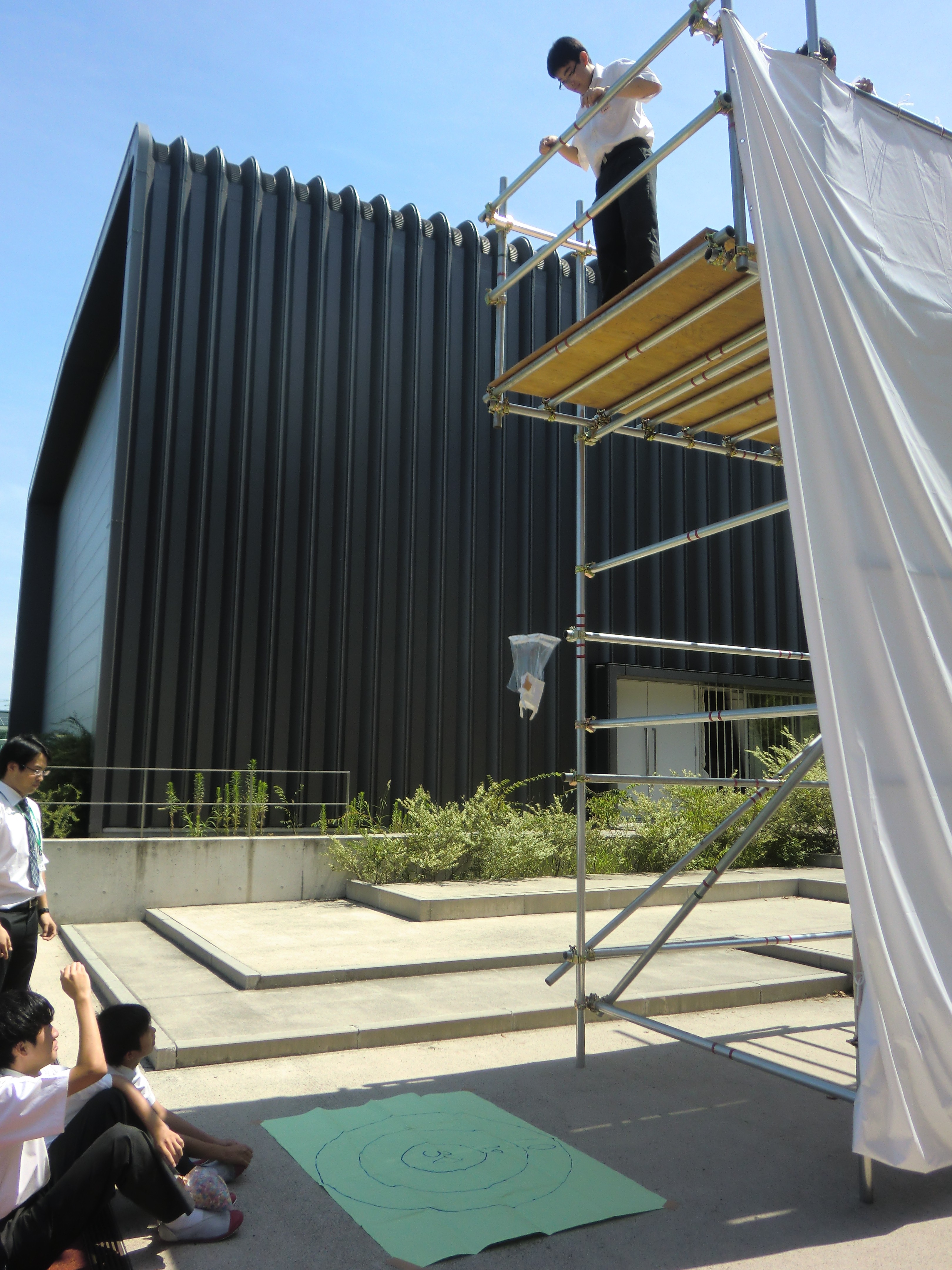 中学3年生は,物理の授業で落下運動について学んでいます。今日は、これまで勉強してきたことの集大成として、エッグドロップコンテストを行いました。エッグドロップコンテストとは、卵を保護するプロテクターを作成し、高所から落下させる競技で、世界中で親しまれている理科実験です。今回のコンテストでは、軽量性・正確性・安全性の3点を得点化し競い合いました。軽いプロテクターほど点数が高く、落下地点に書かれた的の中心近くに落下させるほど高得点になります。ただし、卵が割れたりヒビが入ってしまった班は失格になります。生徒たちはグループで議論し、様々なエッグプロテクターを製作してきました。落下速度の軽減するためにパラシュートを取り付ける班や、衝撃の吸収のために、紙でクッションを作る班など、創意工夫に満ちた様々なエッグプロテクターが出来上がりました。パラシュートが計画通りに開いて卵を無事に守れた班があった一方、空中でプロテクターが傾いてしまい、落下の衝撃から卵を守れず悔しい想いをした班もありました。これから生徒はコンテストの結果を振り返り、改善策を考えます。