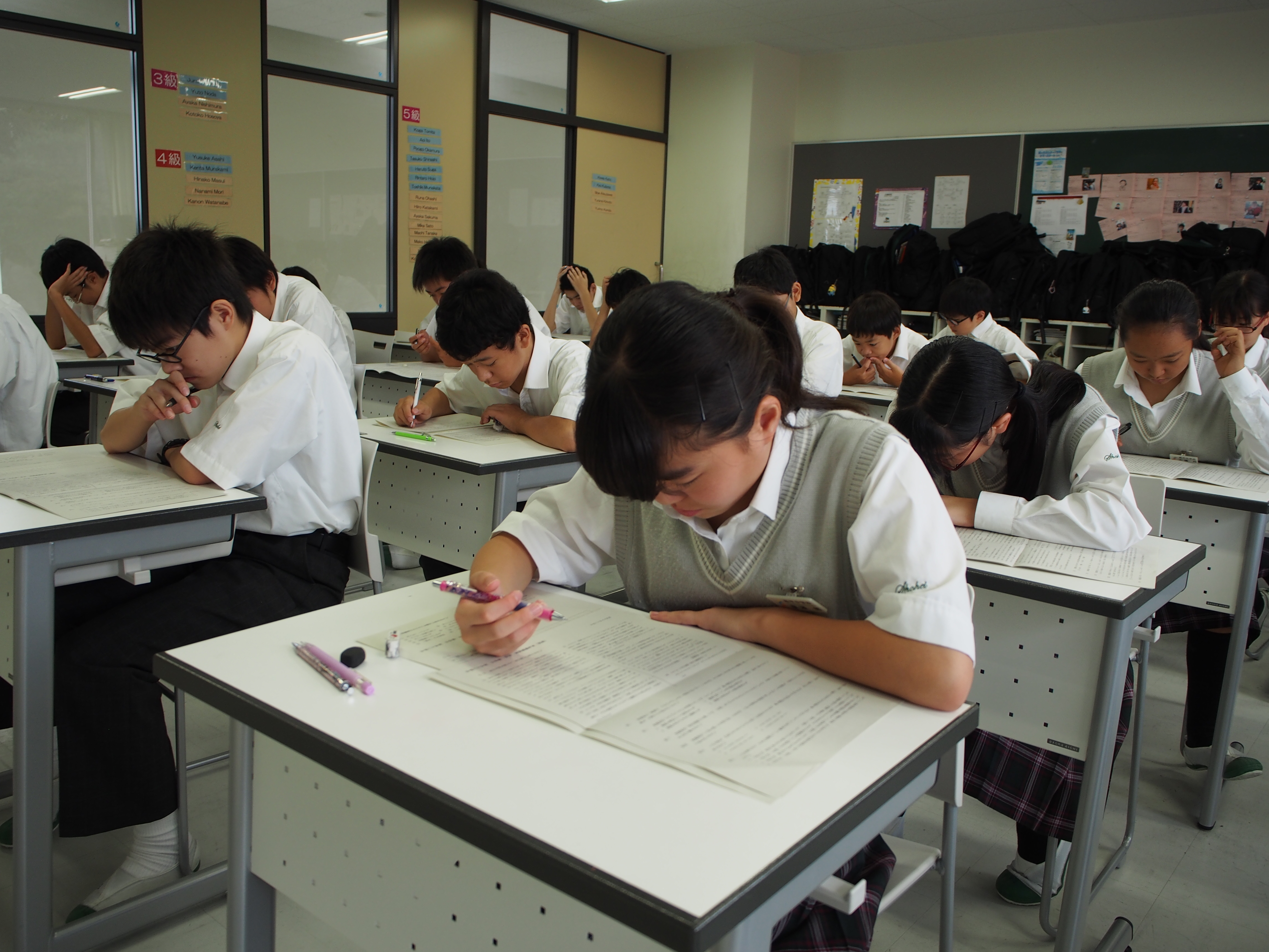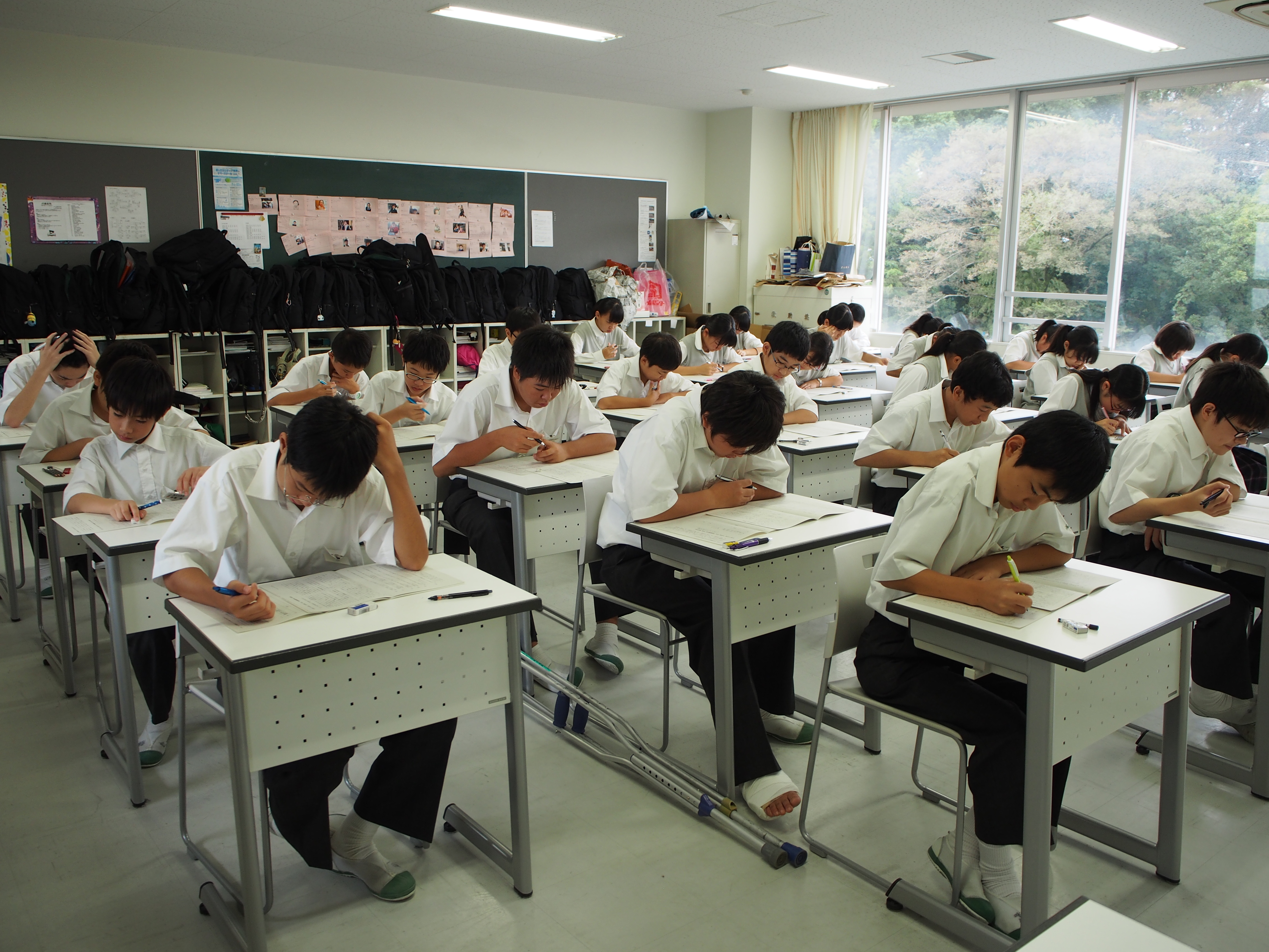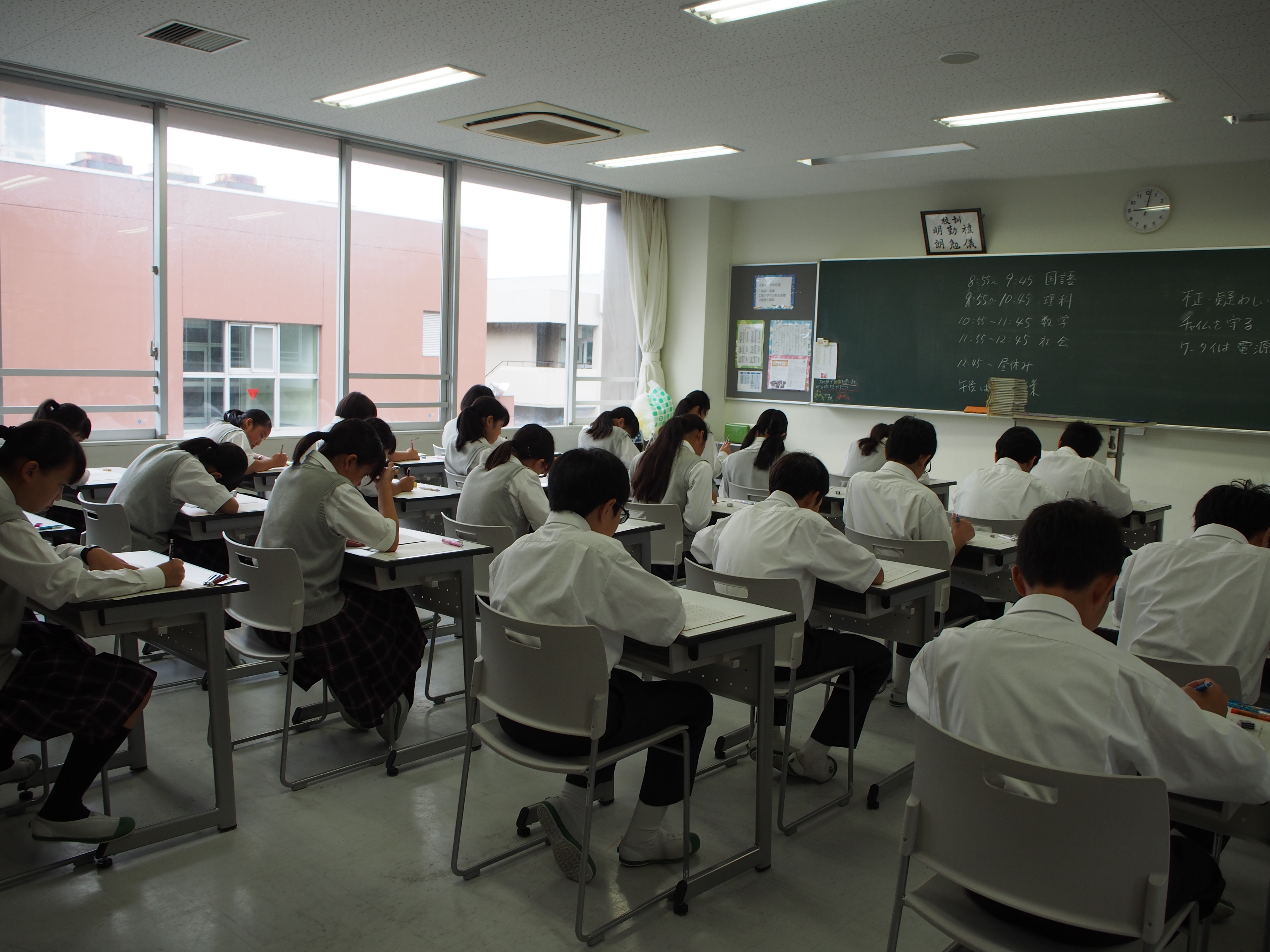 先日の英語の課題考査に引き続き、本日中学校では国語、数学、理科、社会の夏期課題考査が行われました。今回の考査は各教科、1学期の学習内容や夏期課題を中心に出題されています。どの生徒も制限時間ぎりぎりまで真剣に問題と向き合っていました。課題を提出したら終わり、考査を受けたら終わりではなく、帰宅後も隅々まで振り返りをし、夏期課題をきちんと完結させてほしいと思います。