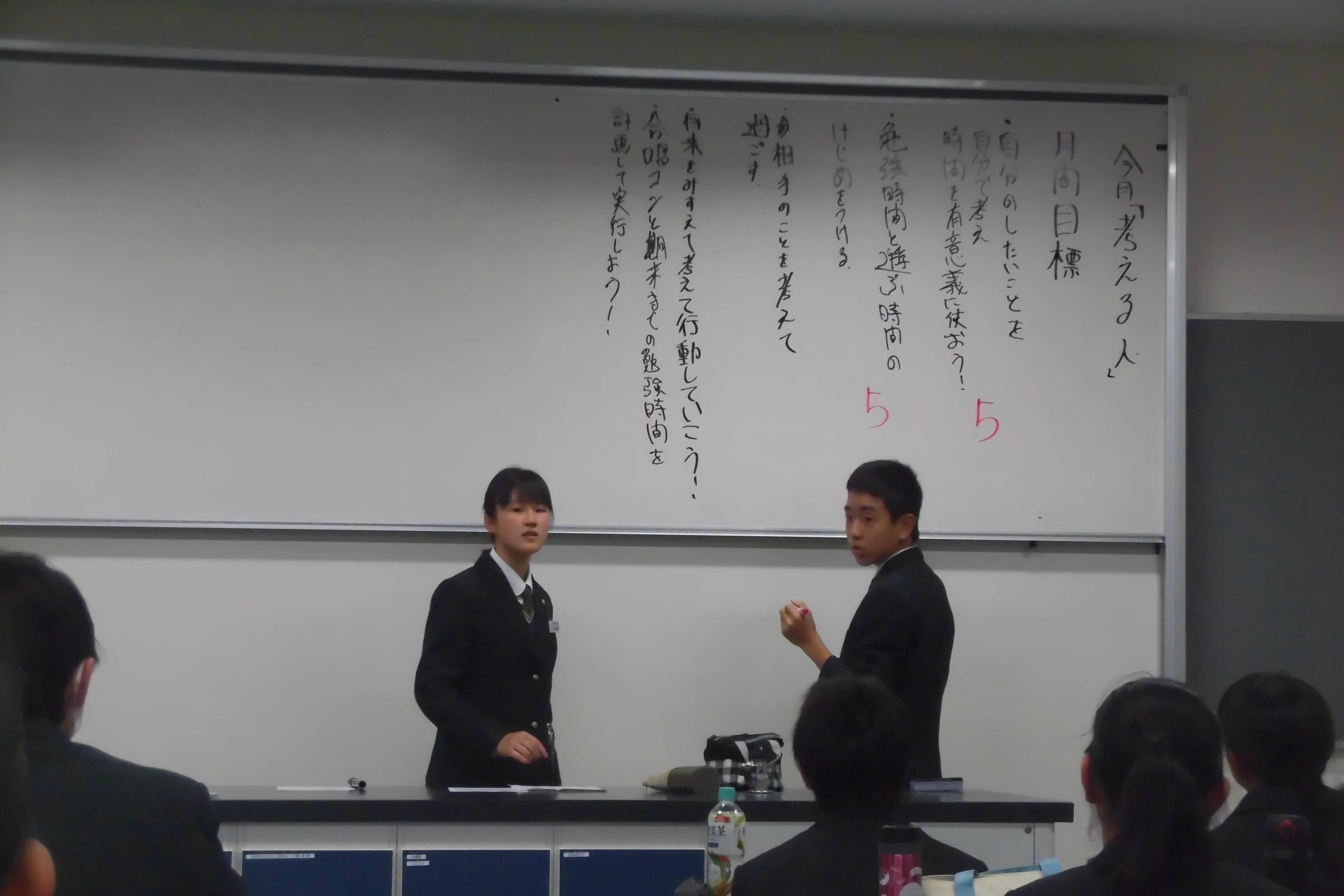 今月のIB学習者像は『考える人』です。11月は中学1年生はブリティッシュヒルズ語学研修,中学2年生はスペシャルウェンズデーが行われます。また,それ以外にも文化の日,埼玉県民の日,勤労感謝の日など祝日が多く,日頃の生活リズムが崩れやすく,先を見据えて予定を立てることが大事になります。そこで,11月の目標は『先を見据え,考えて行動できるようにしよう。』に決まりました。勉強・部活動・習い事・合唱コンクールの練習などありますが,しっかりとした計画を立てて取り組んでいきましょう。