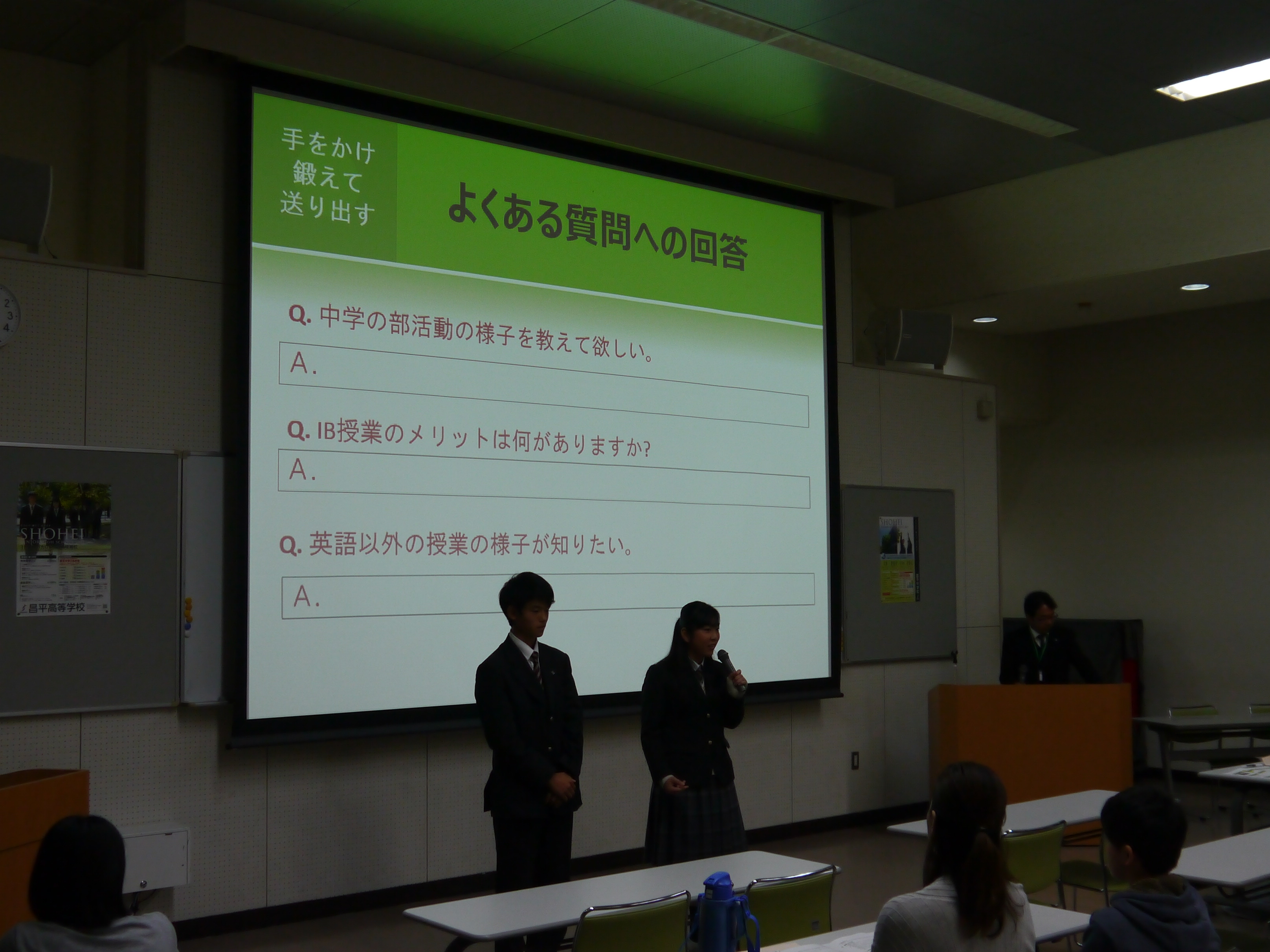 本日は、第9回学校説明会を開催しました。学校説明会では校長をはじめ各責任者より本校の取り組み、入試について説明しました。また、一貫6期生で現高校1年生の在校生2名が登壇し,IBや英語、部活動等についてインタビュー形式で話しました。