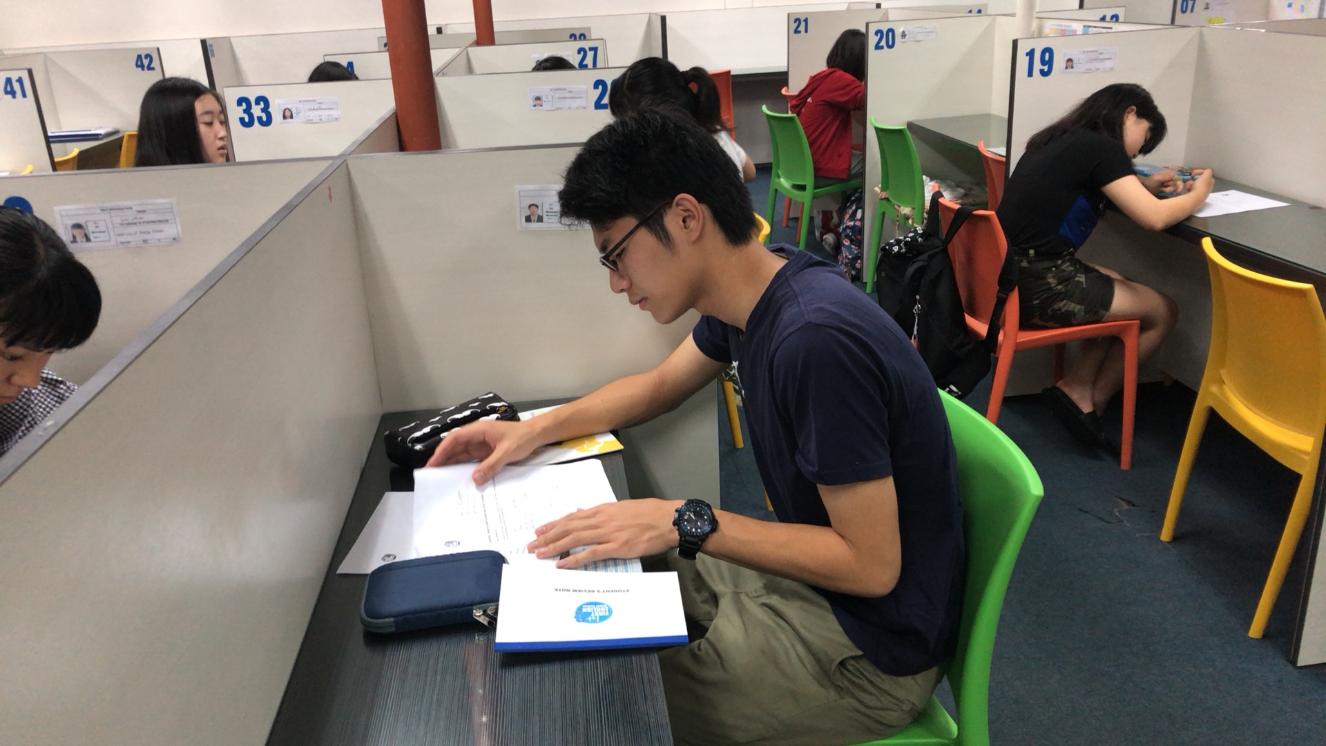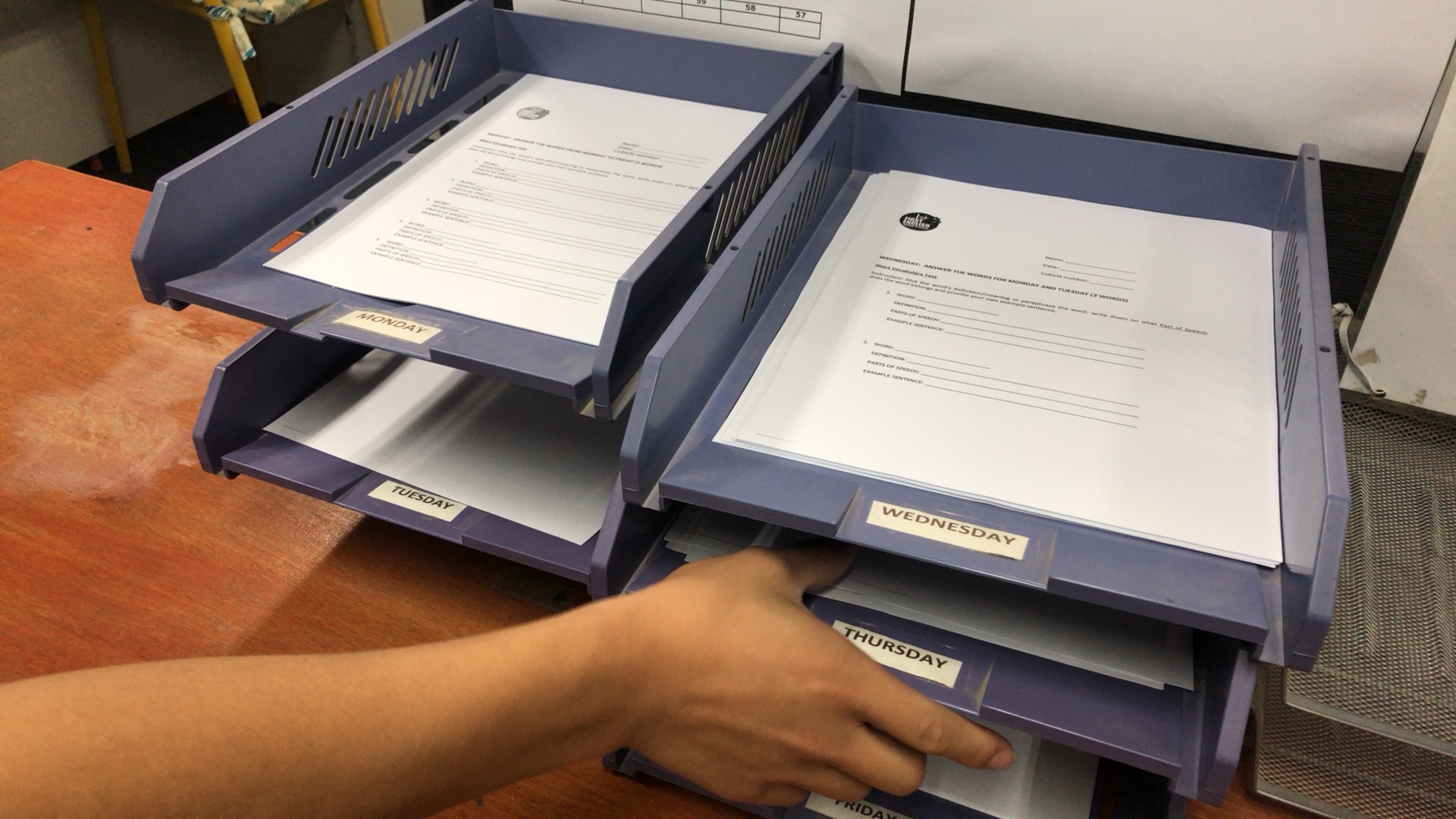 毎日1語が教室の外のボードに張り出されます。月曜は1語、火曜は月・火の2語、水曜は月・火・水の3語、と増えていきます。7:50からの単語テストではその単語のスペルだけでなく、意味、品詞、例文をすべて英語で書かなくてはなりません。パーフェクトに正しく書いた生徒の名前が翌日の朝礼で呼ばれます。昌平生だけではなく社会人や大学生もいる中でも、昌平の高1の生徒2名の名前が2日連続で呼ばれました!先生とのレッスンはもちろん大事ですが、自分で空いている時間を使い勉強する姿勢に感心させられます。