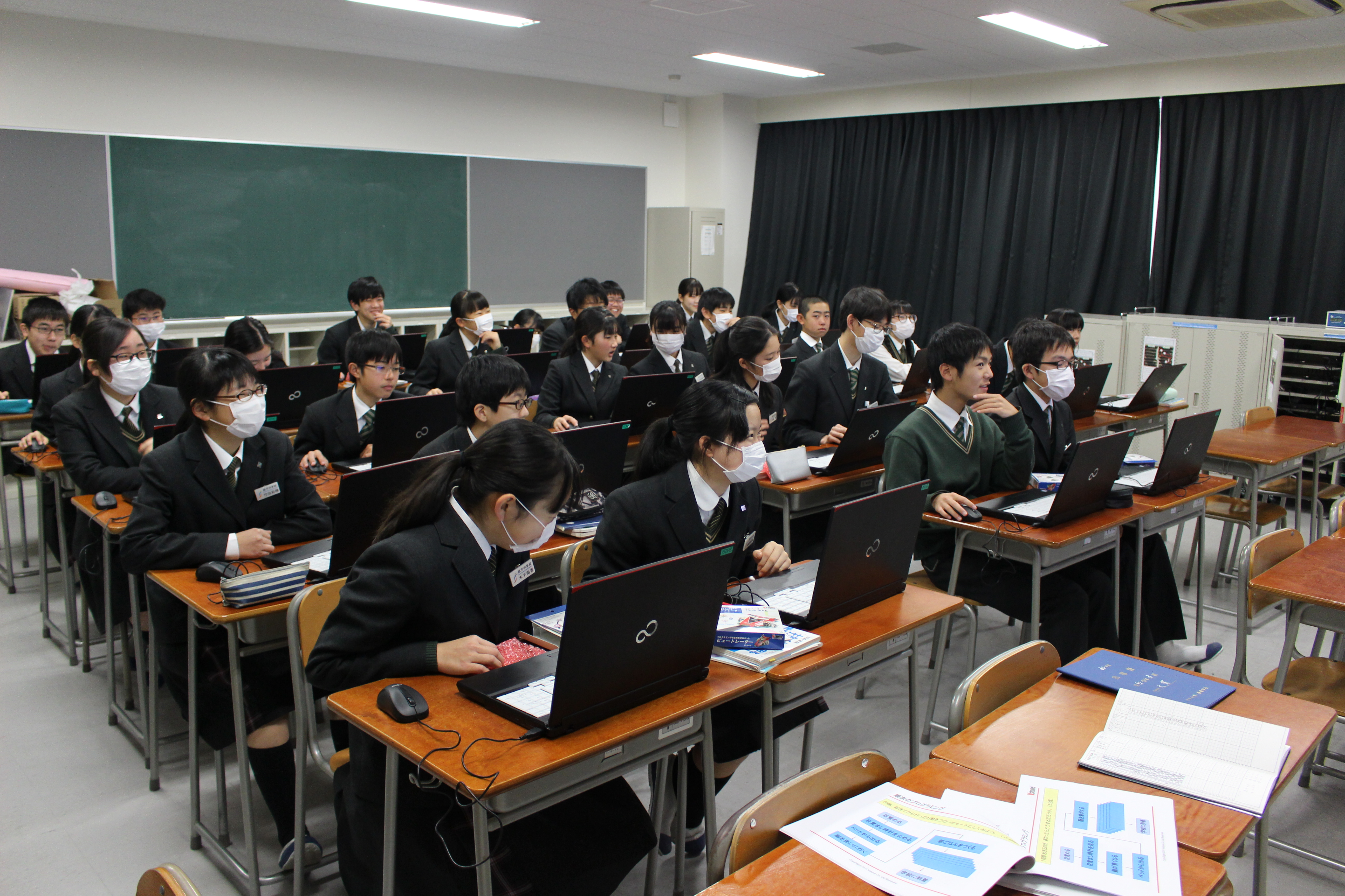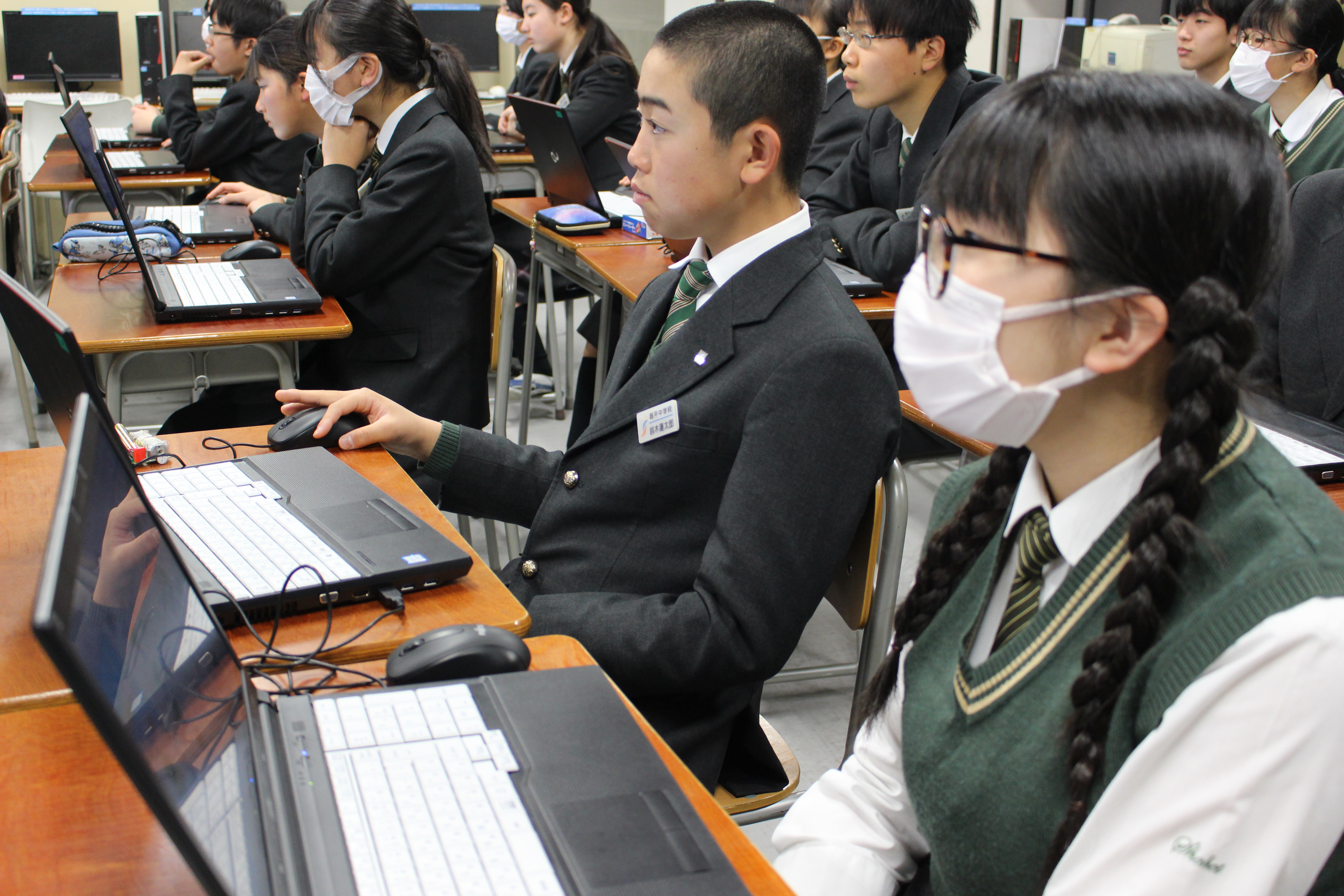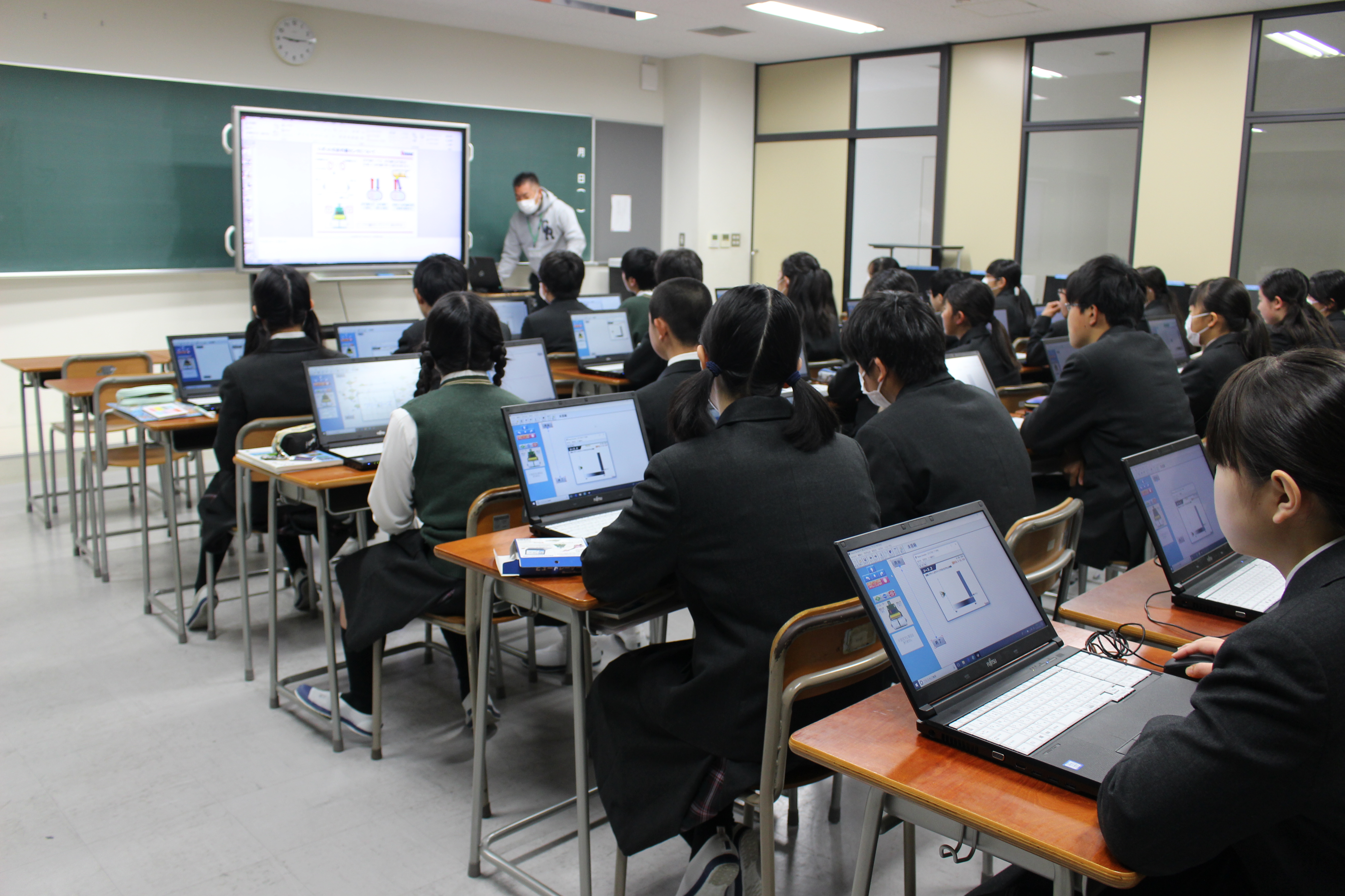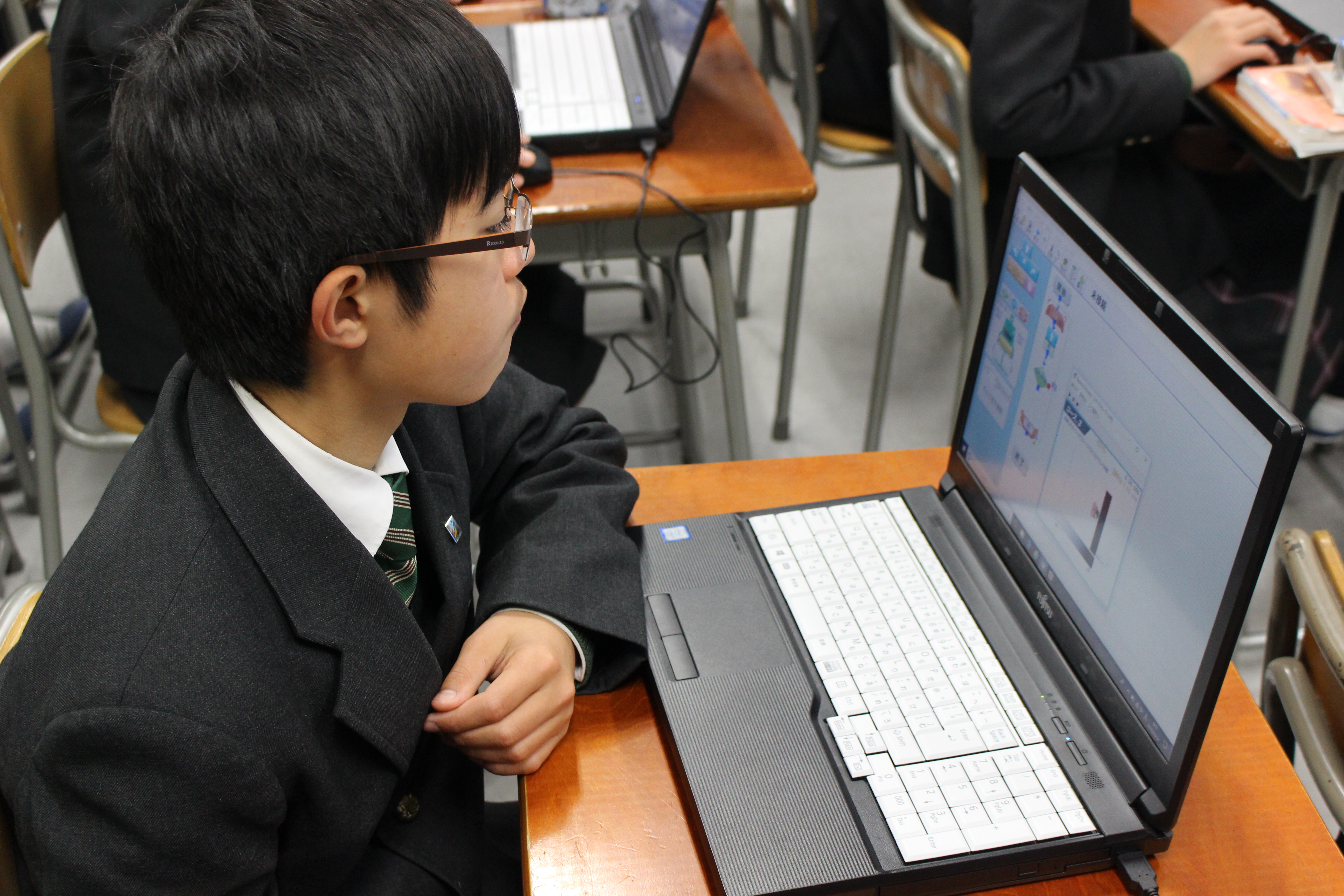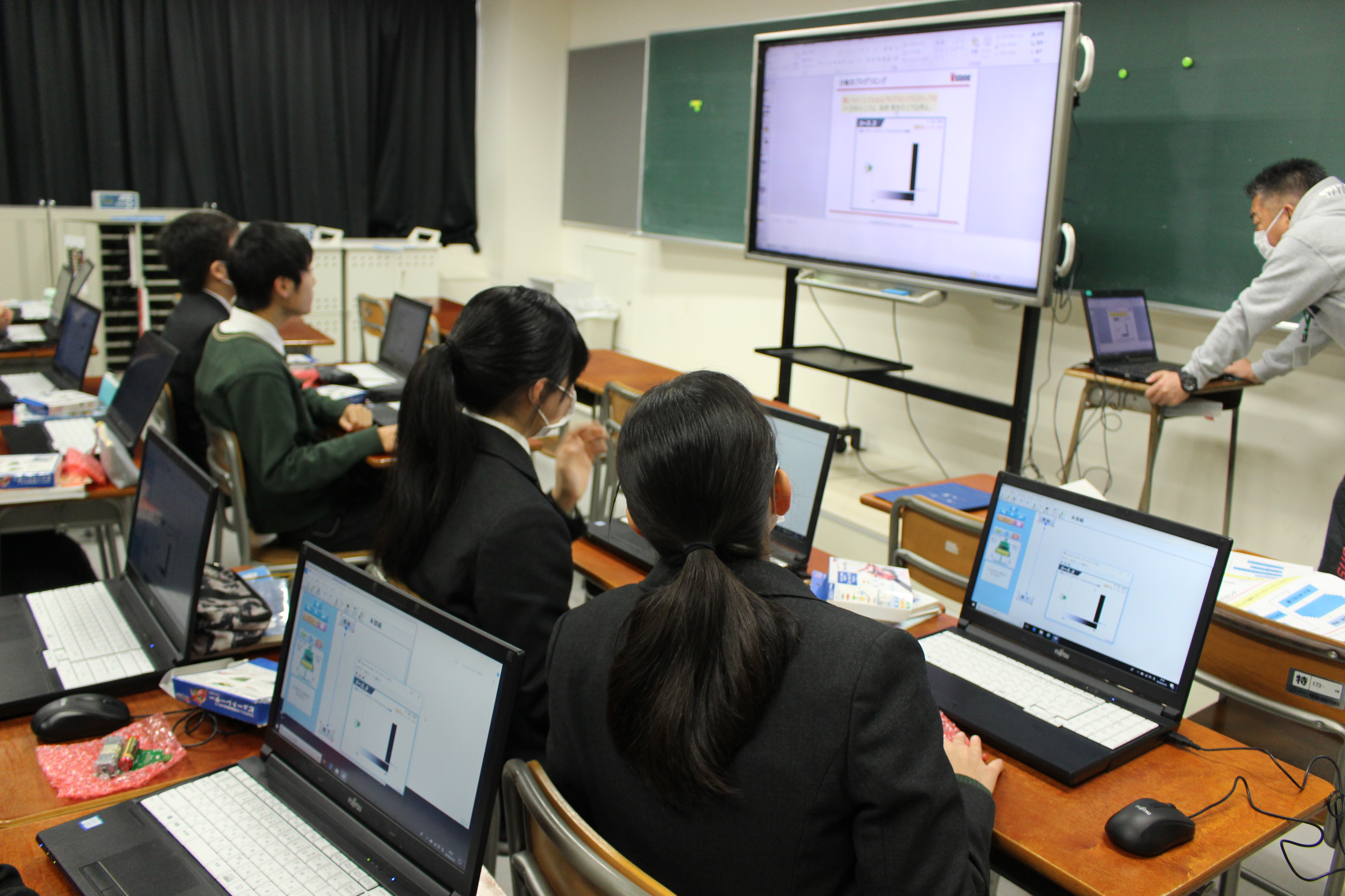 昨今、注目をされているプログラミング教育ですが、本校も力を入れて技術の時間に取り組んでいます。毎時間生徒は楽しそうに取り組んでおります。失敗と成功を繰り返し、試行錯誤しながらプログラミングを完成させています。
