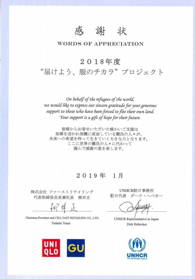 中学2年生は「世界」をテーマにしたプロジェクト学習の一環として、ユニクロ”届けよう、服のチカラ”プロジェクトに参加し、途上国の子どもたちに服を届ける活動を行い、その活動に対し、ユニクロから感謝状が届きました。校内だけでなく、近隣の小学校や幼稚園、保育園の方々、学校説明会に来て下さった方々にも協力をしていただきました。ご協力いただいた皆様、ありがとうございました。