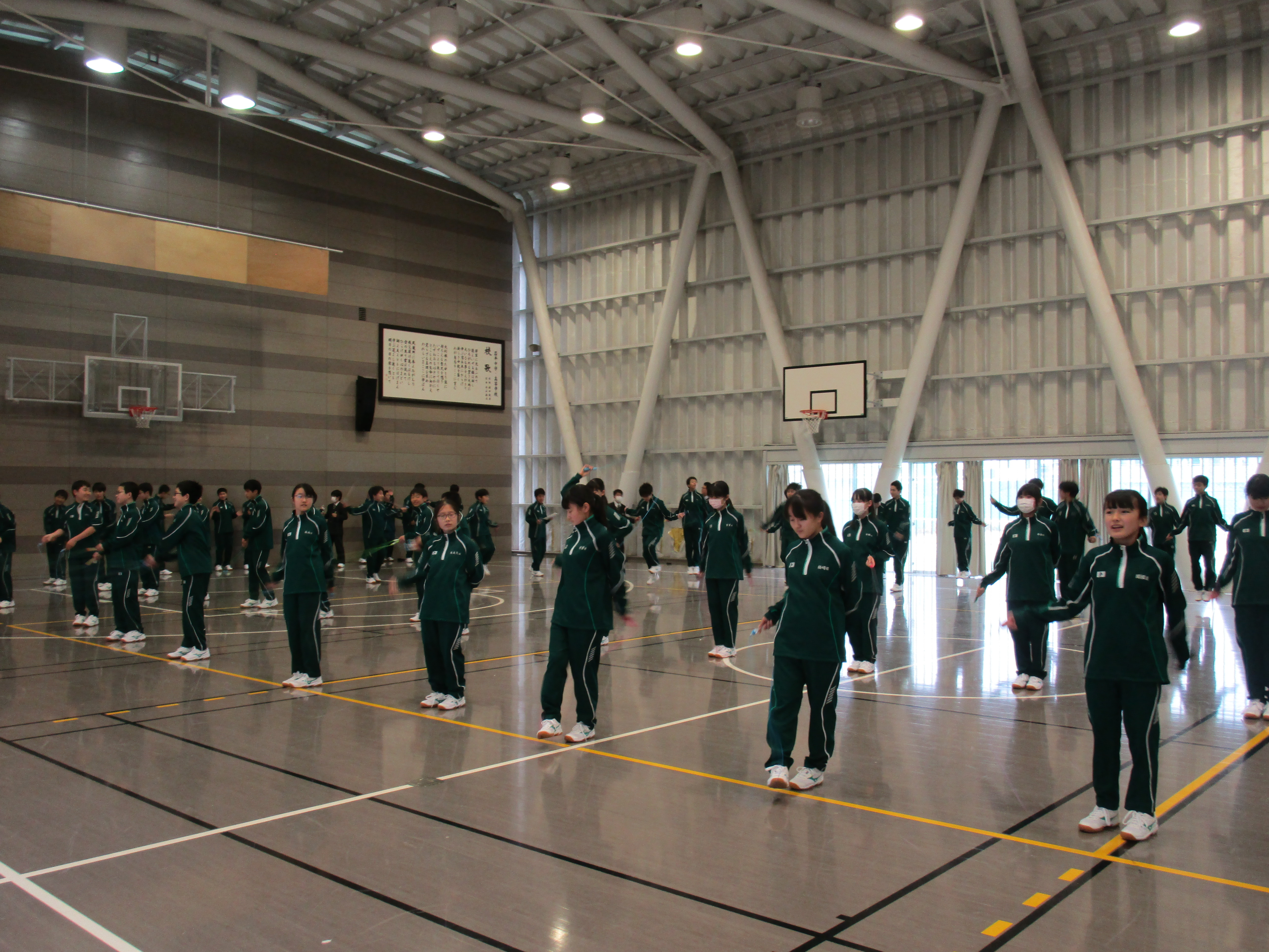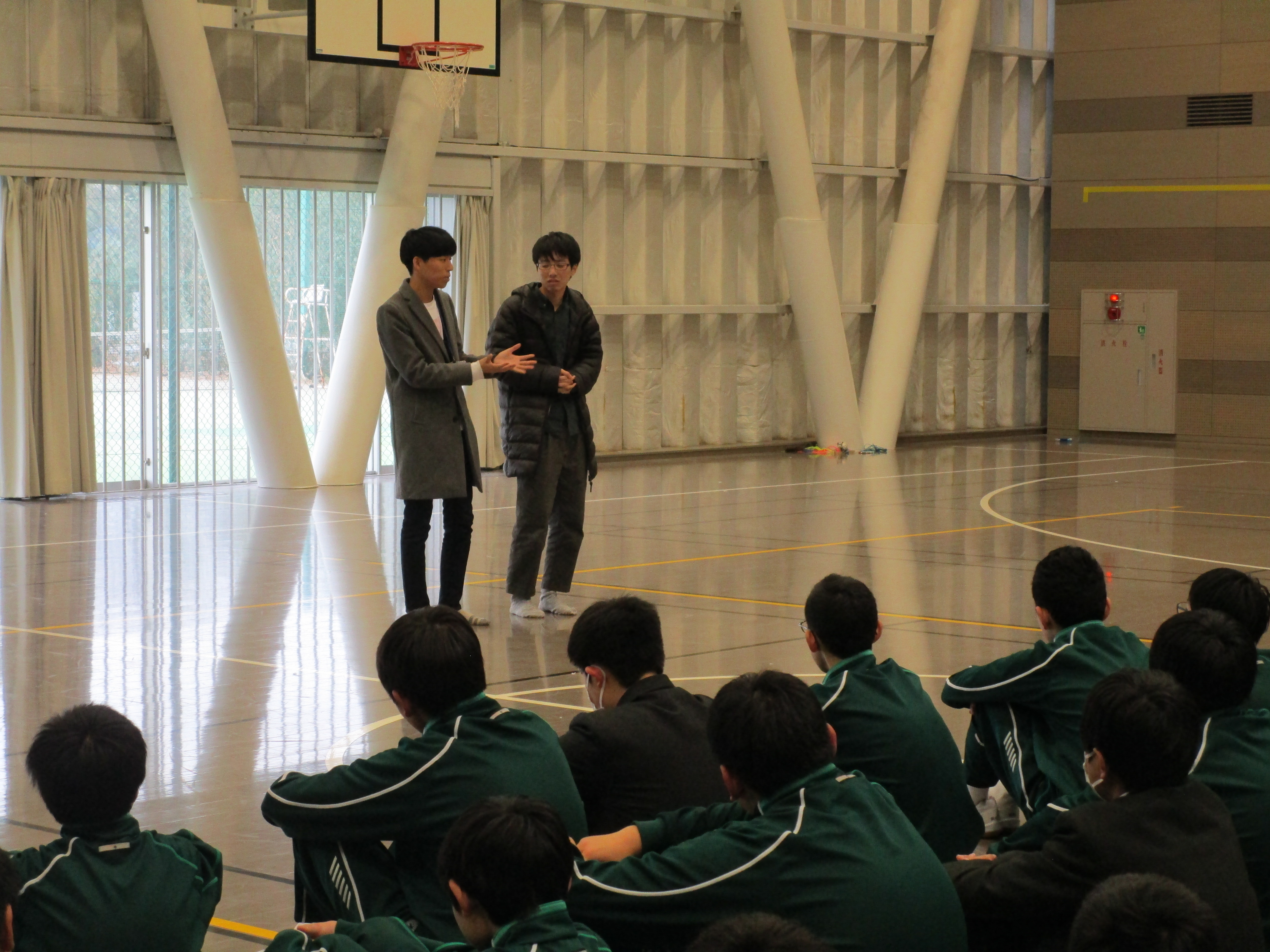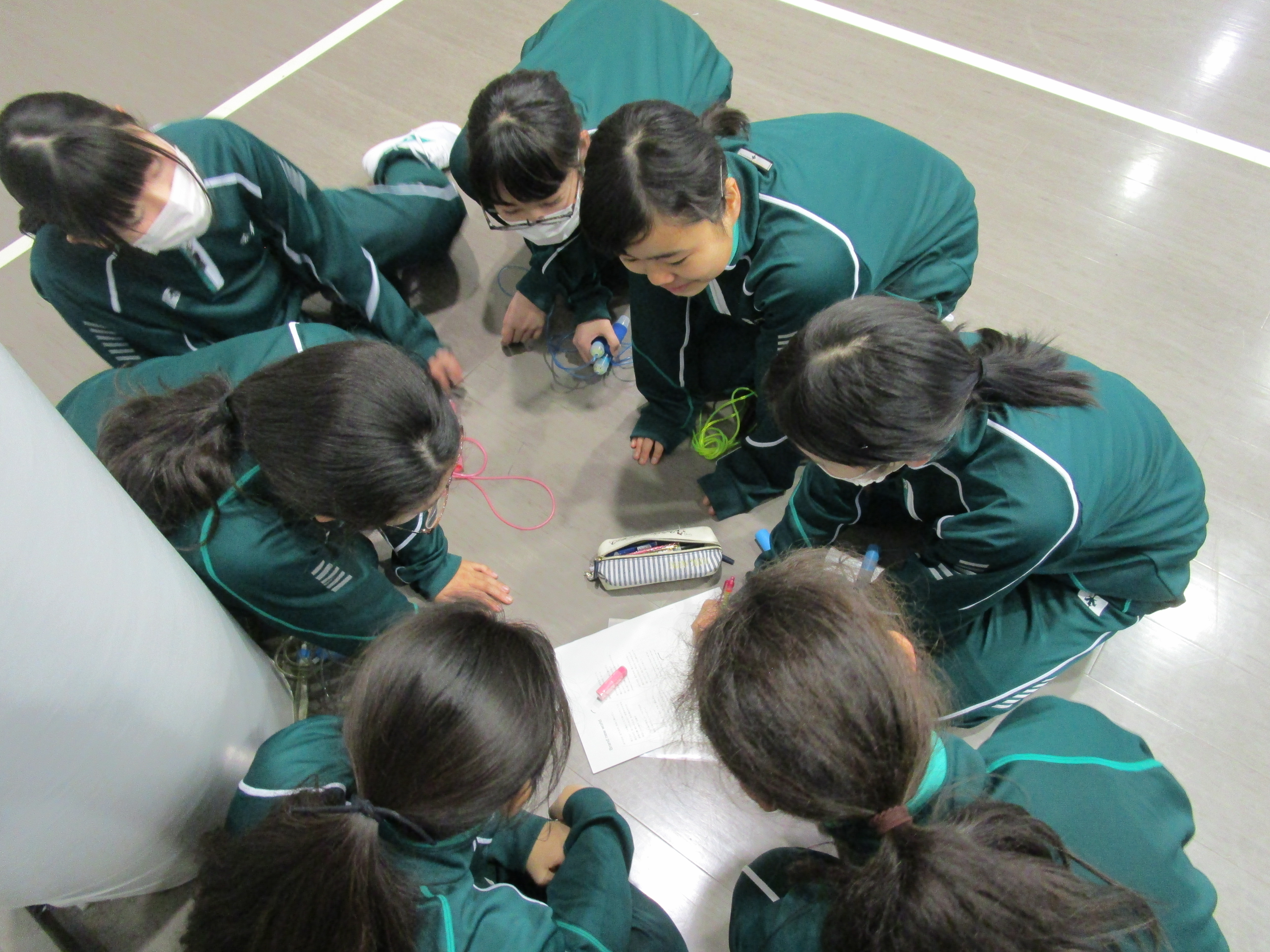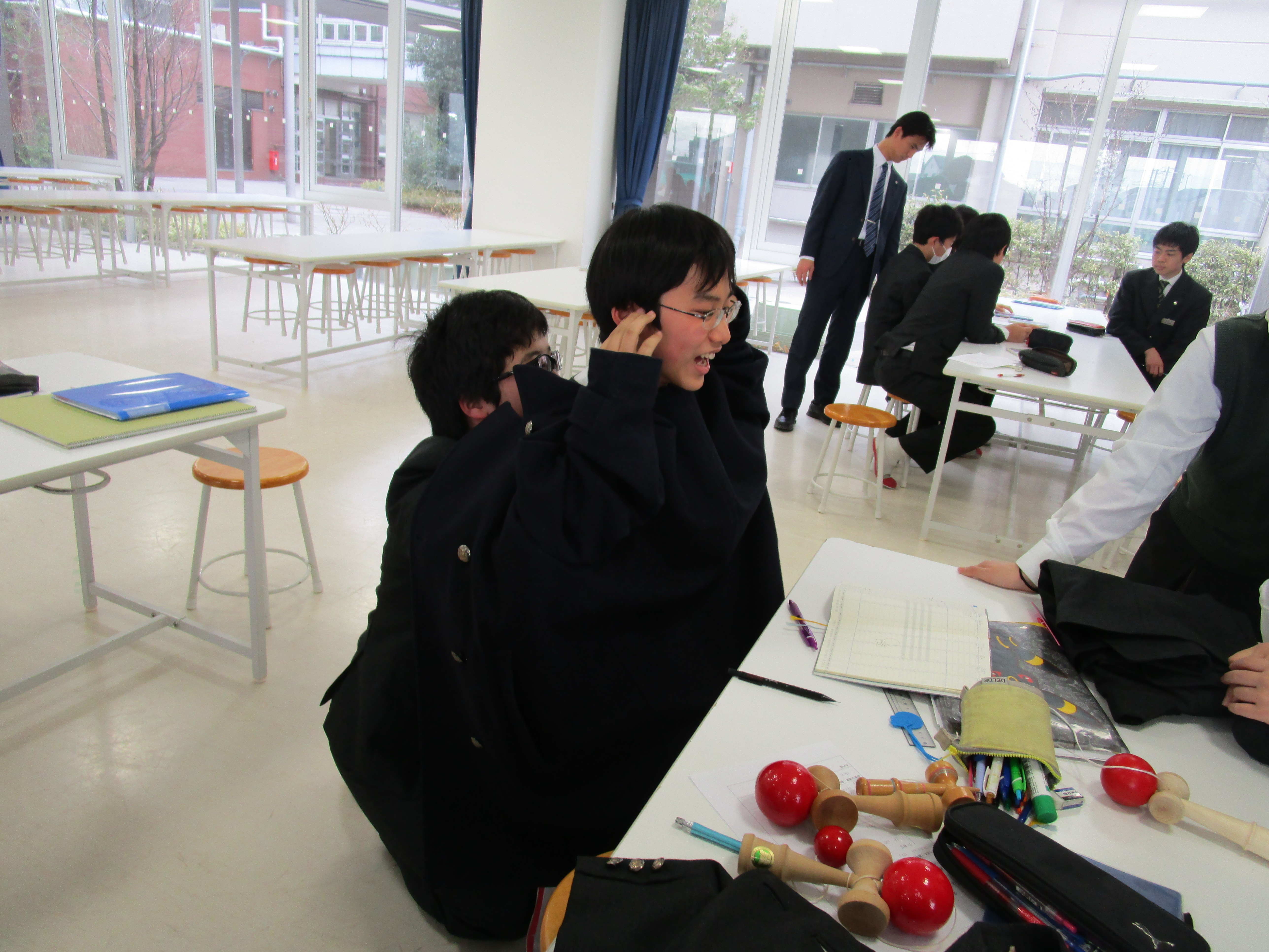 金曜日の6限は中高全クラスがLHR(ロングホームルーム)です。クラスや学年で活動をします。中1は5時間目が体育でリズム縄跳びをしていたので、そのままリズム縄跳びをしました。IB(国際バカロレア)の科目でもある体育の授業は、自分達で調べたり創作したりすることが求められます。縄跳びを音楽に合わせて飛び、自分達でオリジナルの飛び方を考えています。その後は、中高一貫生の3期生である東京大学と横浜市立大学に在籍する先輩が来ていたので、学校生活や勉強のアドバイスをもらいました。中3は3月に修学旅行でニュージーランドを訪れます。現地の学校で交流もするので、その準備をグループで行ないました。折り紙、けん玉、二人羽織などを披露する予定です。