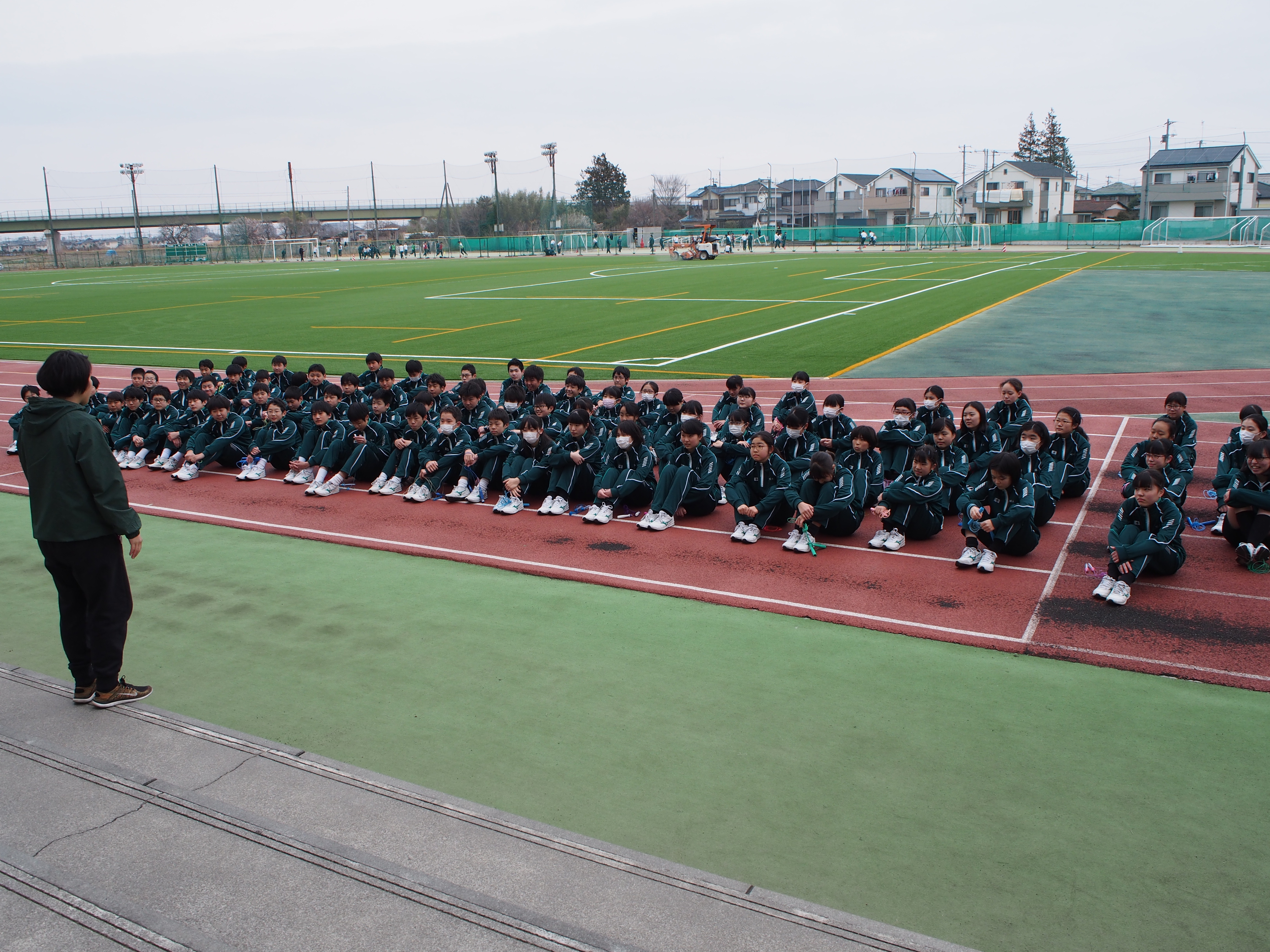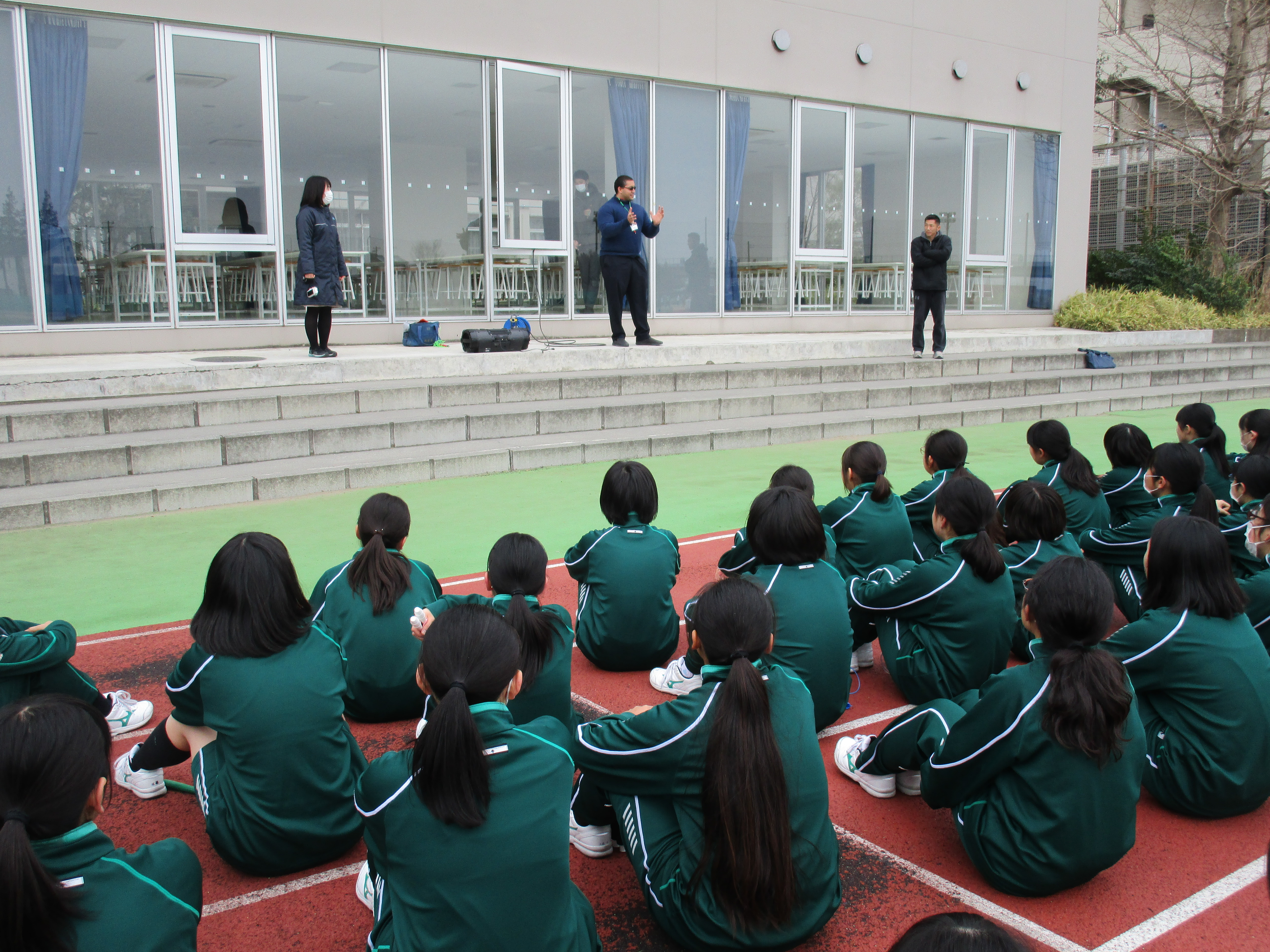 1年生の今日の体育の授業で、リズム縄跳びの発表が行われました。毎朝、朝練をしていたクラスもあり気合は十分!1年生の各担任とネイティブのマリオ先生も見学しました。各クラス男女に分かれ、様々な縄跳びの技とダンスを融合したパフォーマンスは各クラスのカラーがよく出ていました。自分達で振り付けやフォーメーションを考えとてもよい発表になりました。最後にはマリオ先生から英語でコメントを、体育の佐藤先生からはお褒めの言葉をいただき、ここまで全員で頑張ったという充実した表情で授業を終えることができました。
