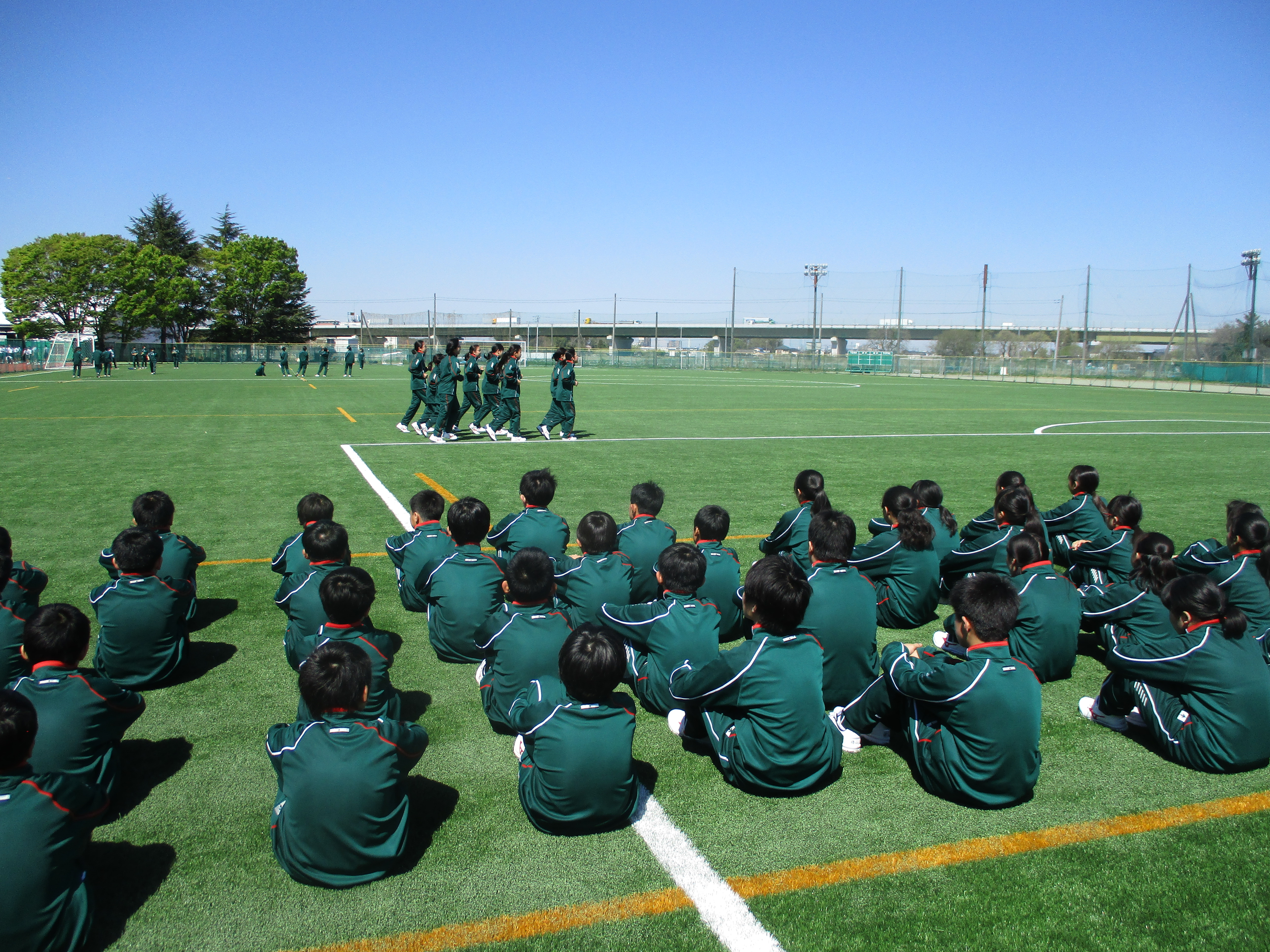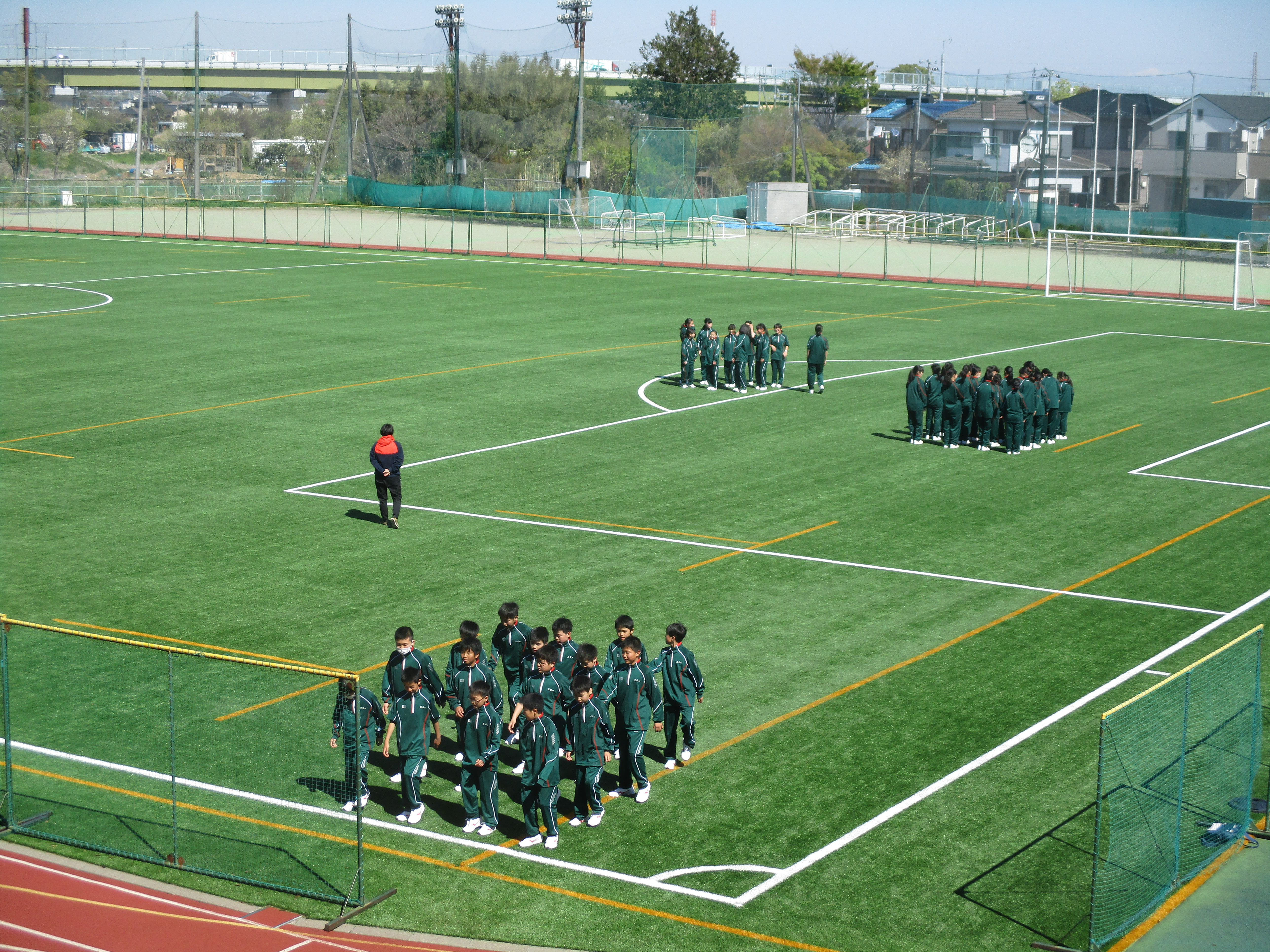 今週から本格的に授業が始まりました。中1の1組と4組は初めての体育です。体育では集団行動の授業が行われています。体育委員の掛け声に従って行動します。本日は1組男・女、4組男・女の4チームにわかれて練習し、最後に発表を行いました。