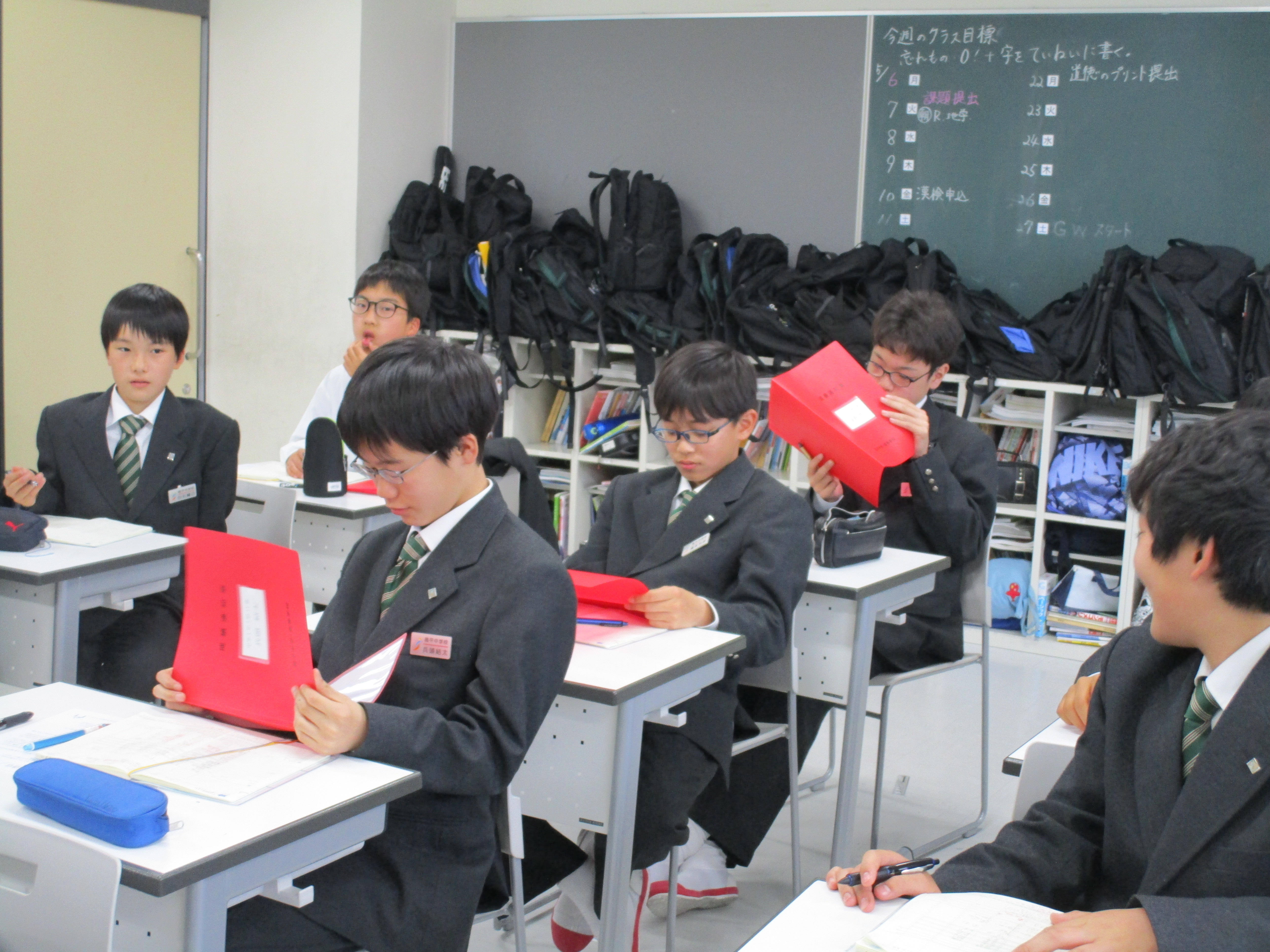 入学後すぐに行なった課題考査の結果が返されました。1年生に小学校での力を試す初めてのテストでしたが学年順位も出ます。成績を受け取る際は先生から今後の勉強方法についての助言もありました。担任の先生からは、順位は出てしまうものだけれど、大切なのは今後どうするかが大切というお言葉もありました。また、10連休に向けて宿題や生活時間の計画を手帳に作成しました。「計画」の大切さを実感し行動にうつせる中学生になりましょう。