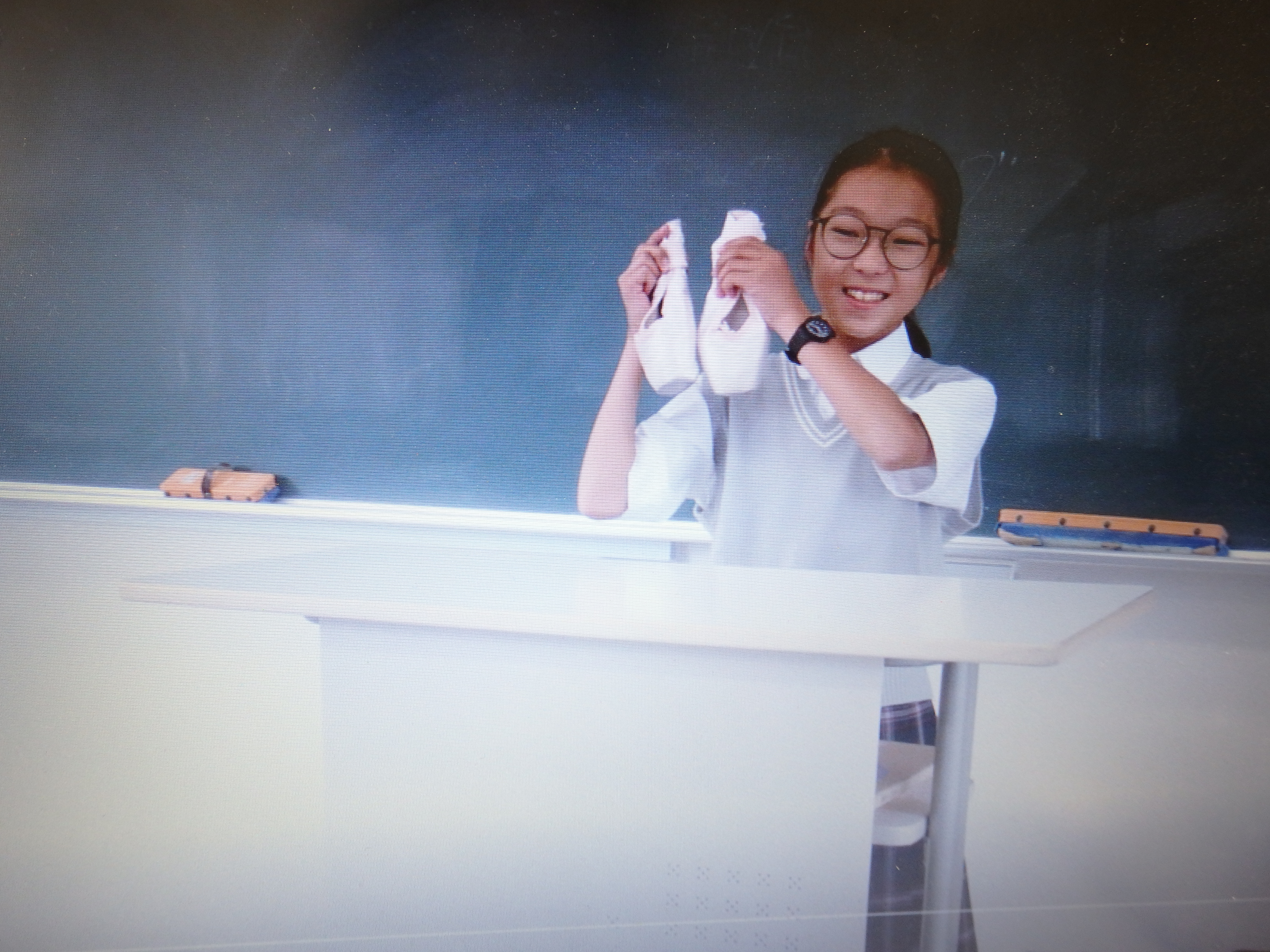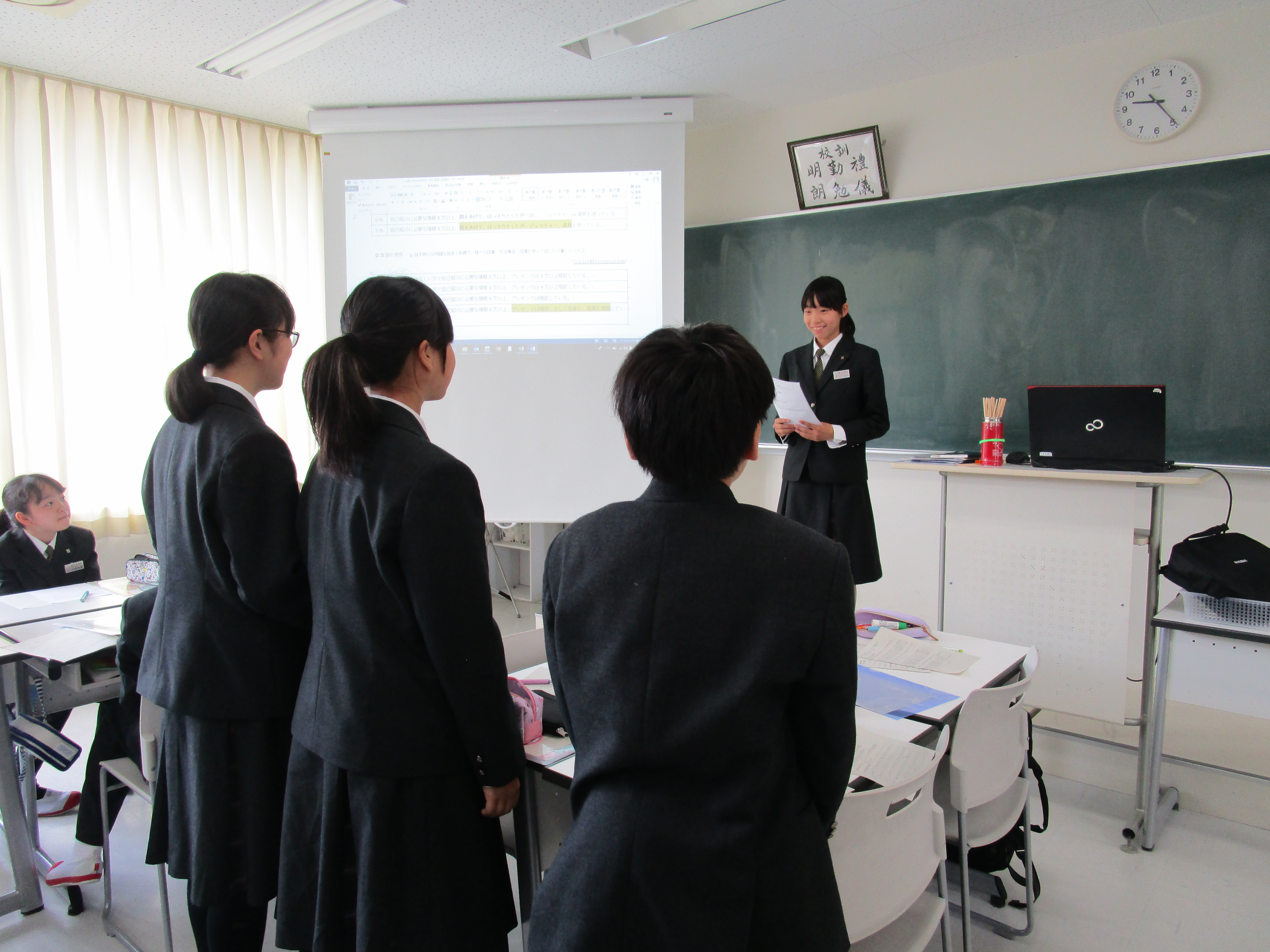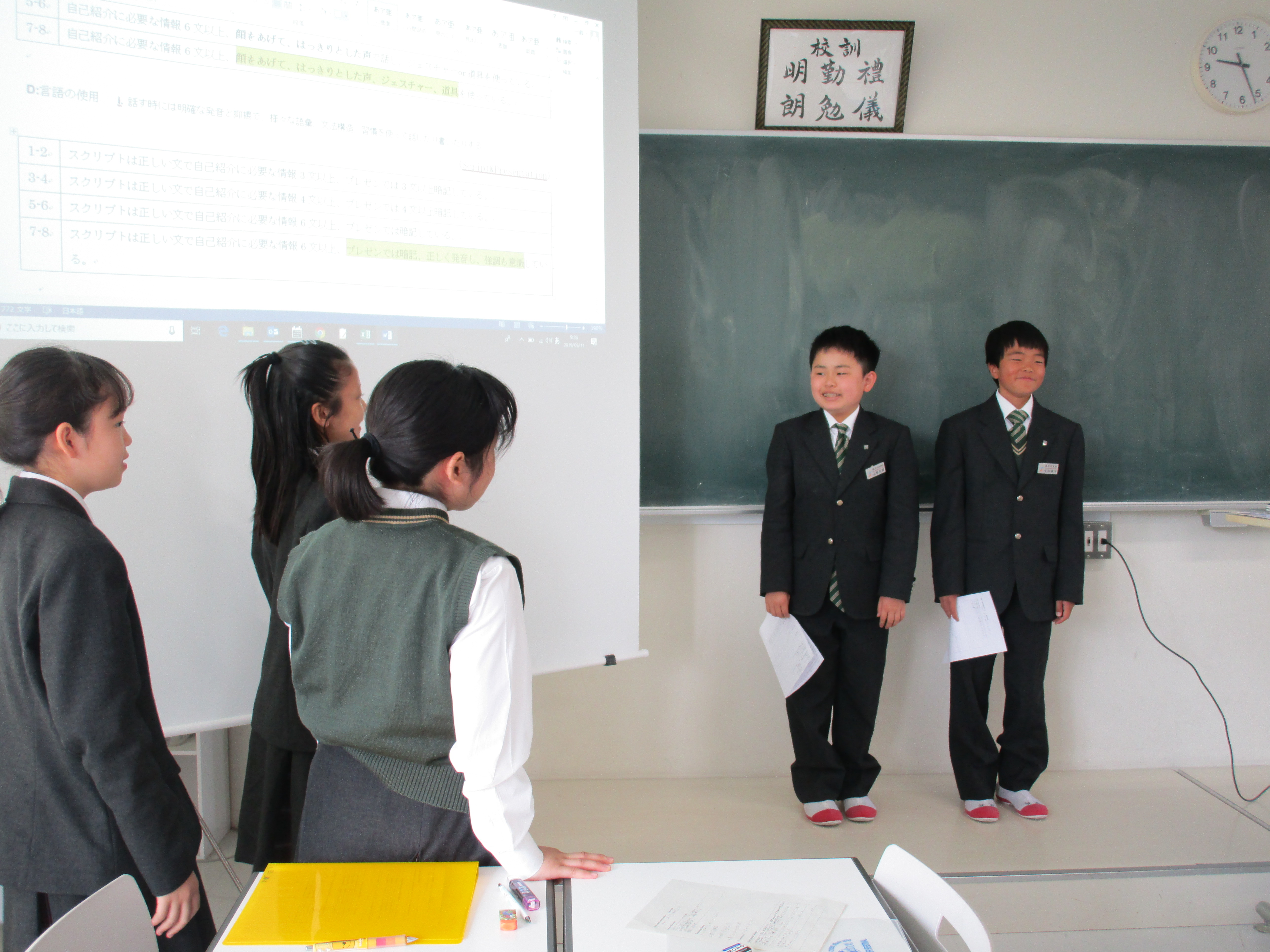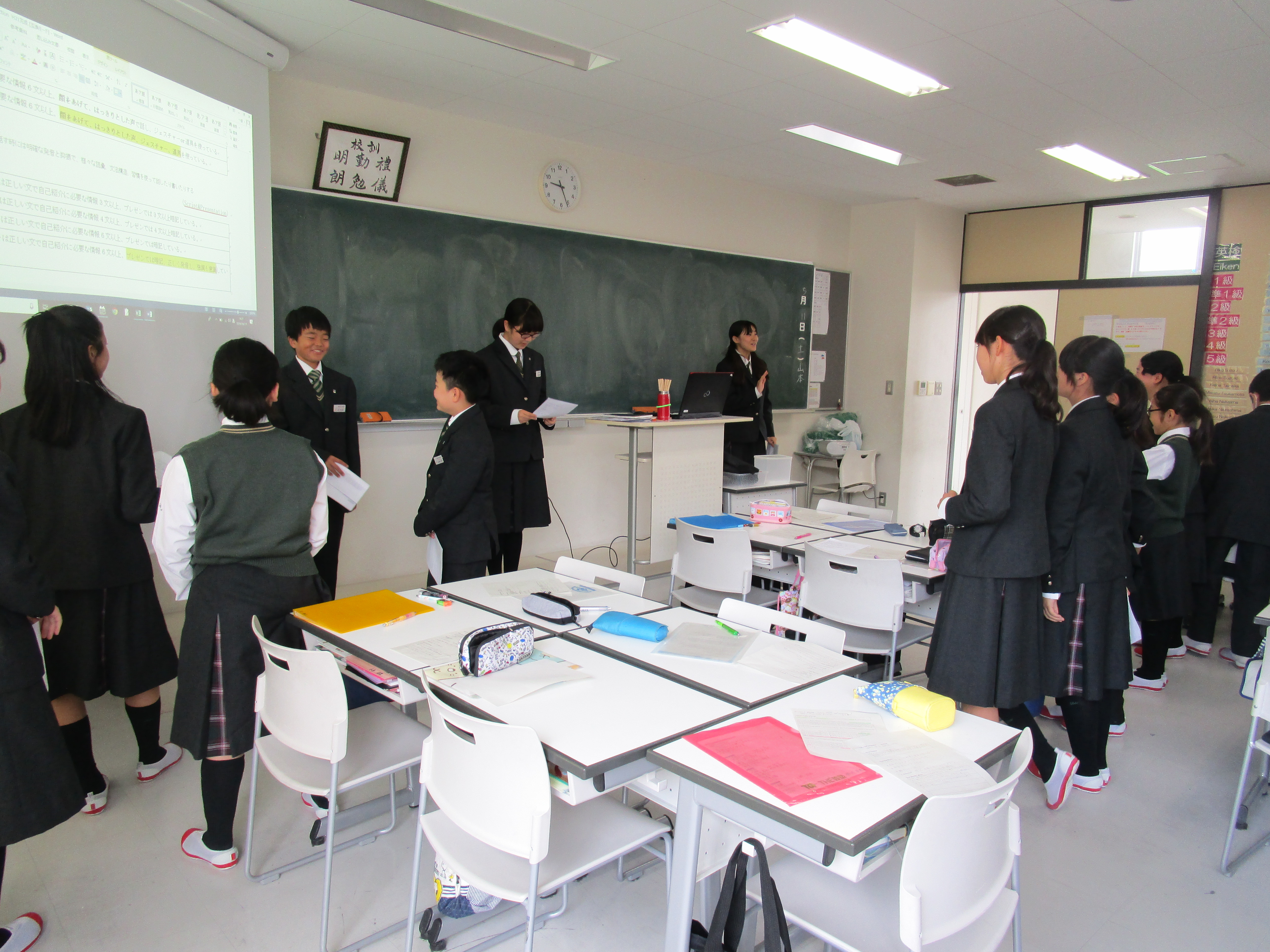 初めて昌平中学校でIBを始めた1年生は、英語で初めてのスピーチを行なっています。IBの授業では、練習方法も自分達で考えます。各班が5つのトレーニングメニューを考え、本番のプレゼンテーションに向けて練習しました。自分のプレゼンテーションが上手なだけではだめ、班の皆のプレゼンテーションをよりよいものにするために、アドバイスもきちんとし合っています。写真を見ると各班がバラバラなことをしています。独自のメニューがたくさんあって練習も飽きずに頑張れます。本番では、初めてとは思えない堂々とした発表をしました。
