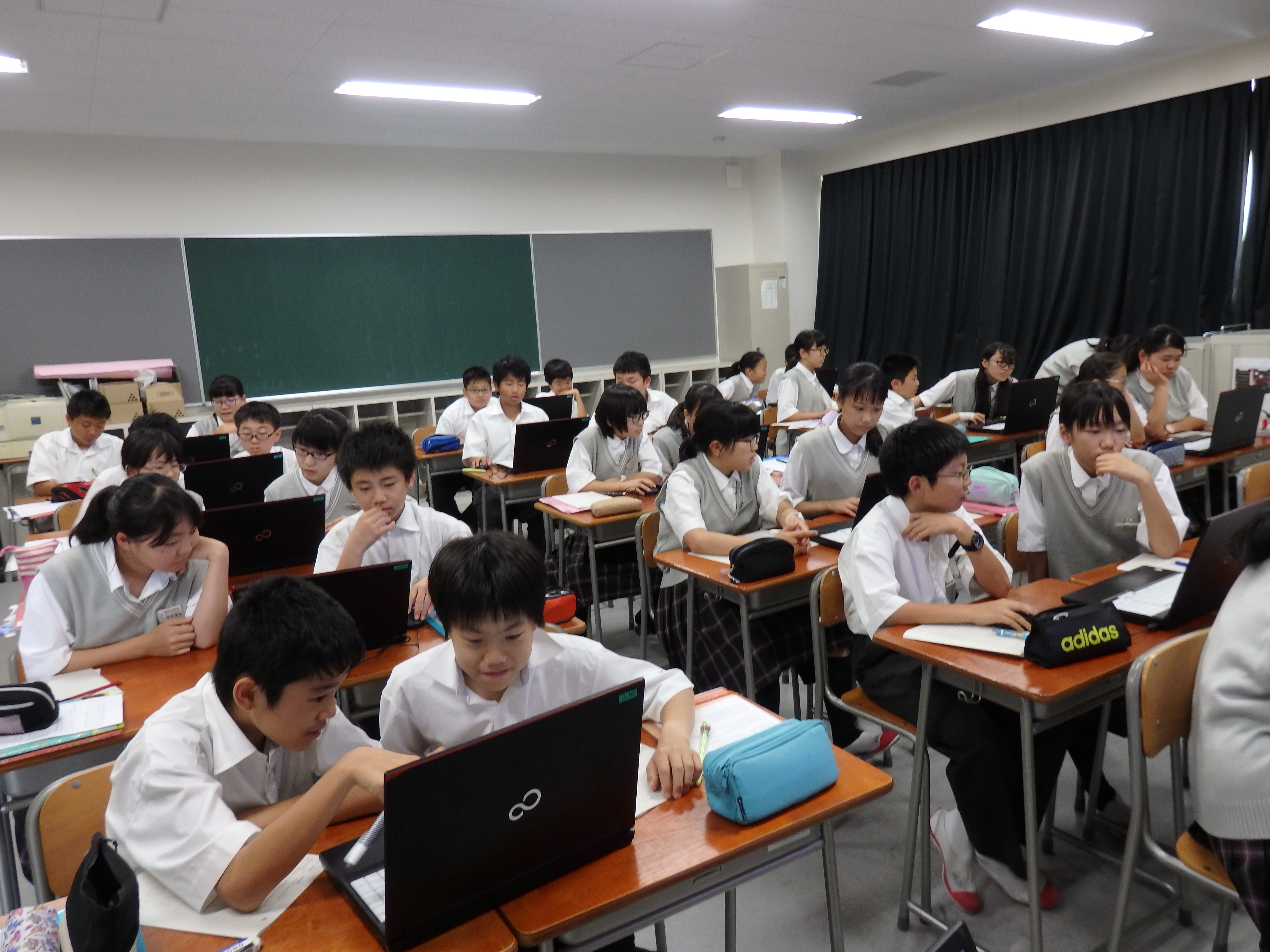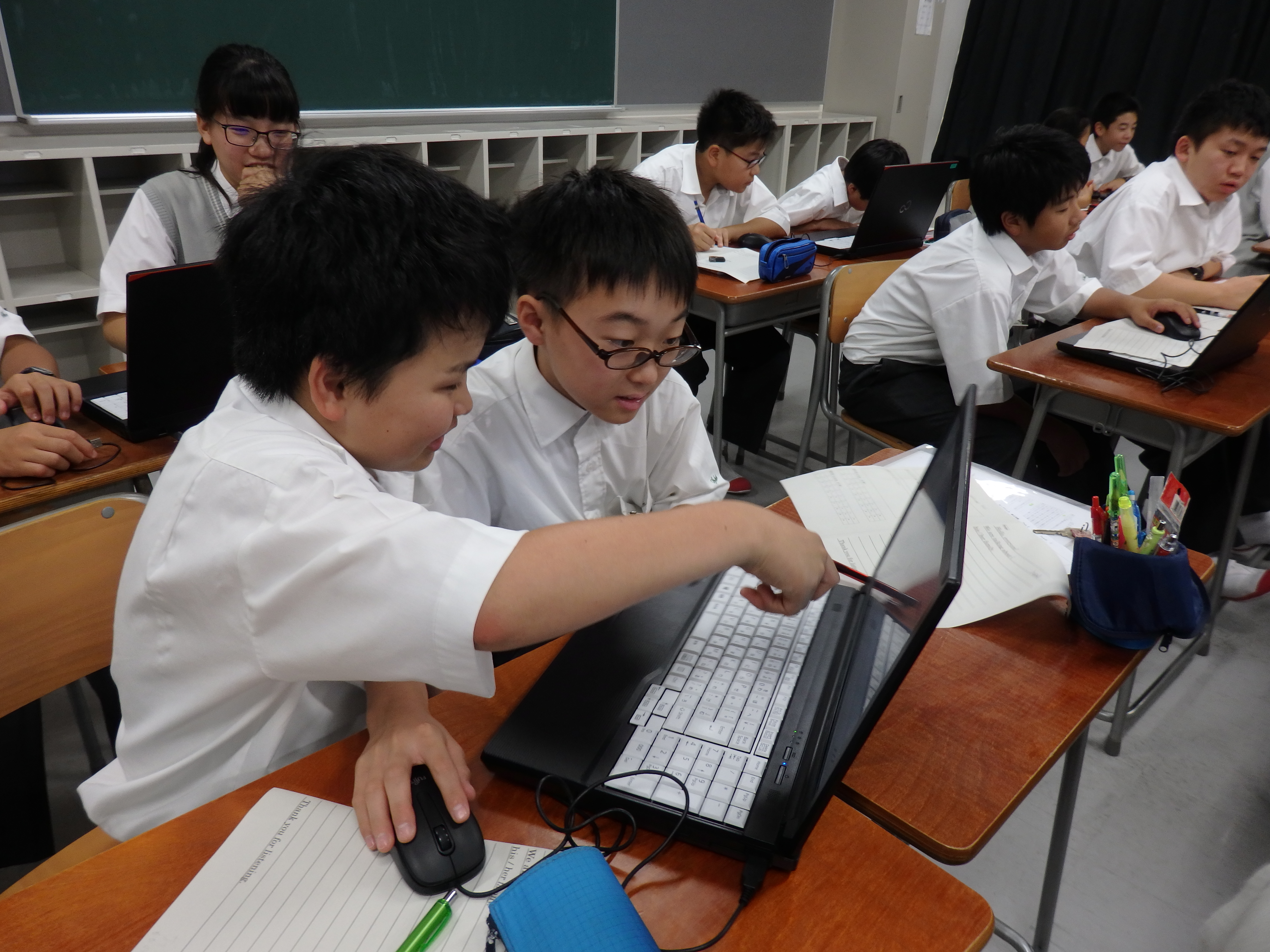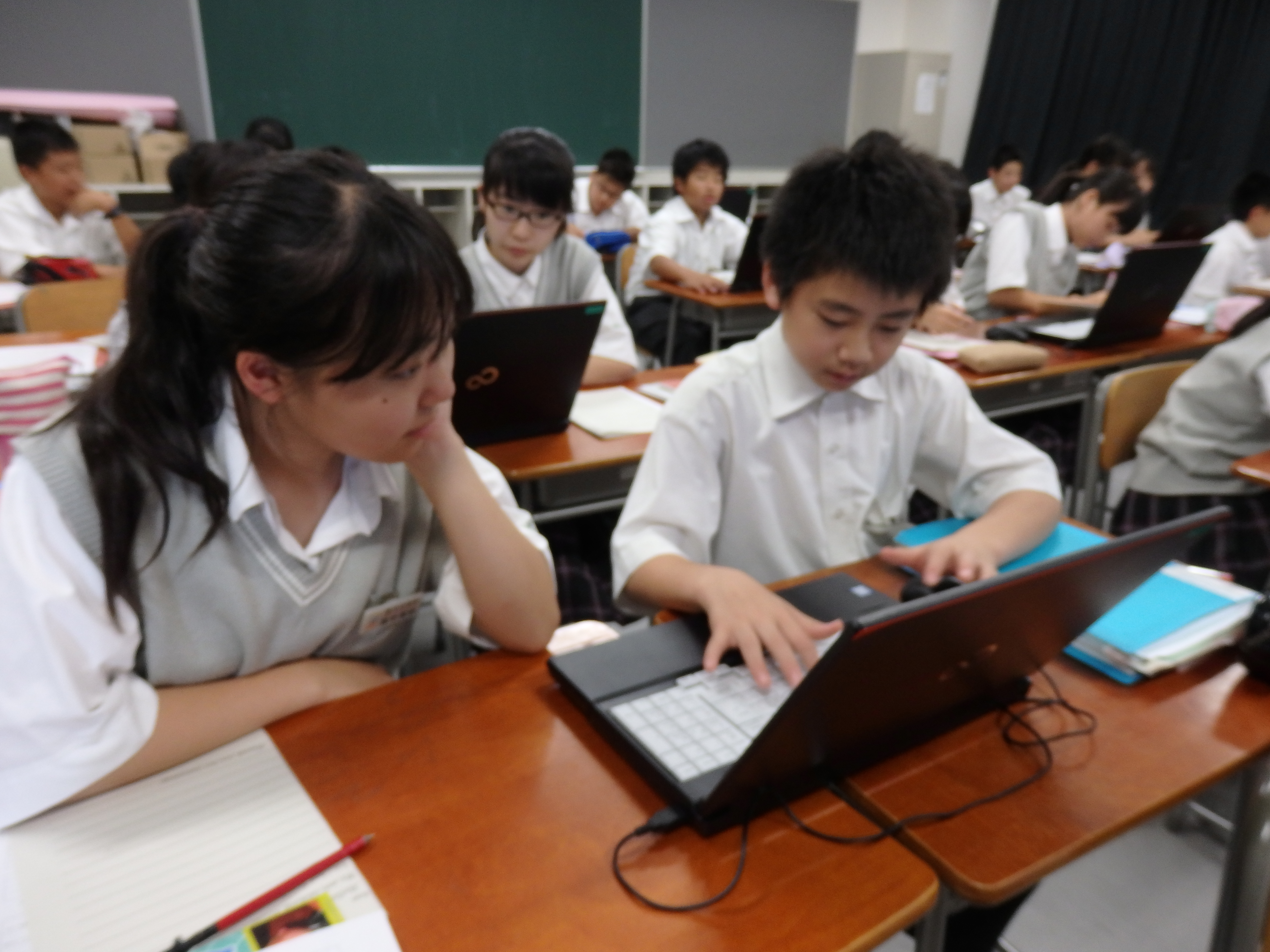 昌平中学・高等学校ではクラスの生徒全員が一度に使えるパソコンを備えた教室がいくつかあります。中学生が主に利用しているのがPC(パソコン)室です。今日は1年生が英語のIB(国際バカロレア)の授業でノート型パソコンを使いました。歴史上の人物のその家族についての調べ学習をするためにペアでパソコンを使いました。いろんなことを話し合いながら、良いプレゼンテーションにつながるように調べていました。今後はプレゼンテーションでパワーポイントも使う予定になっています。昌平を巣立った後も役に立つスキルが身に着くような授業を展開しています。