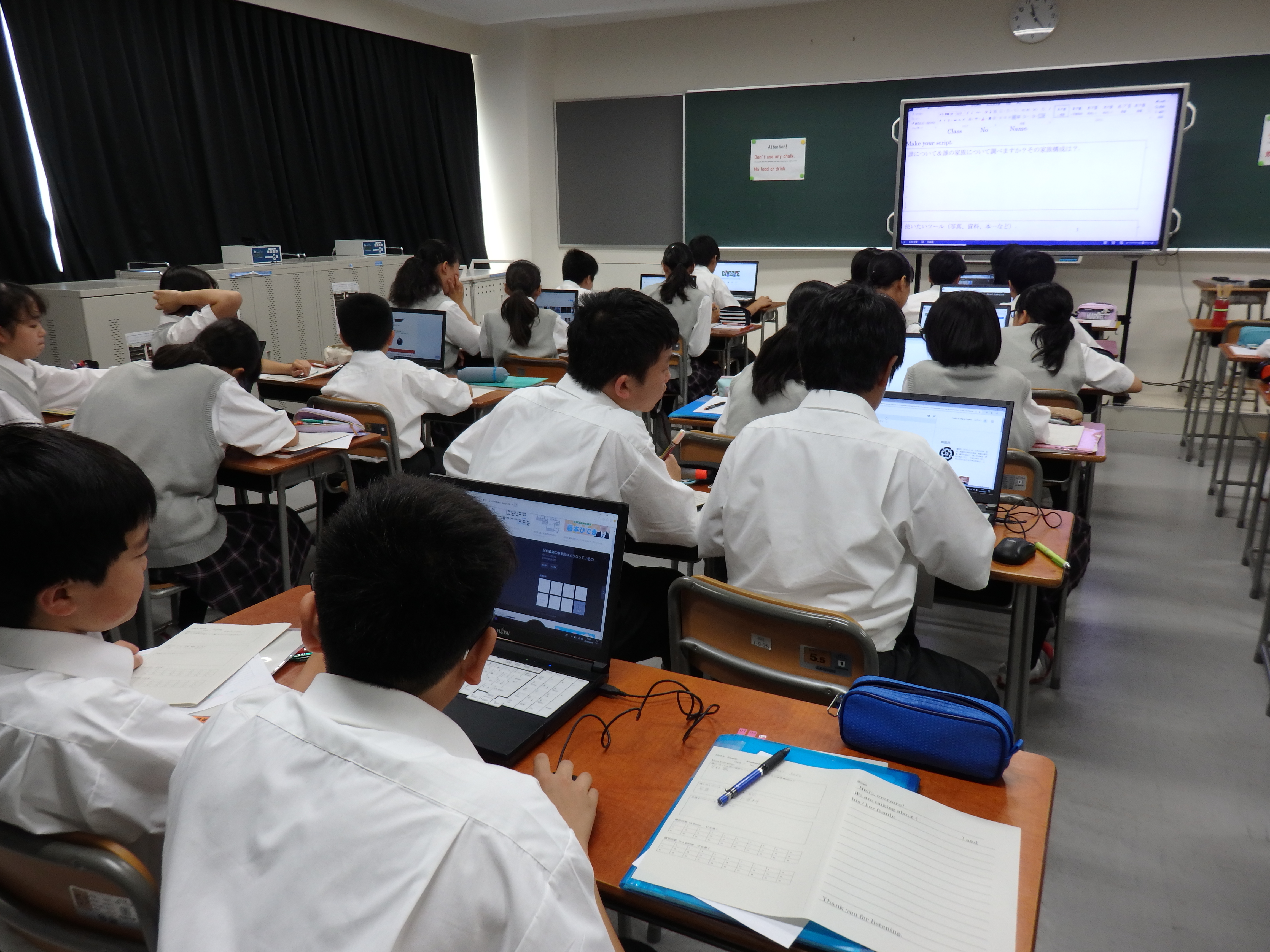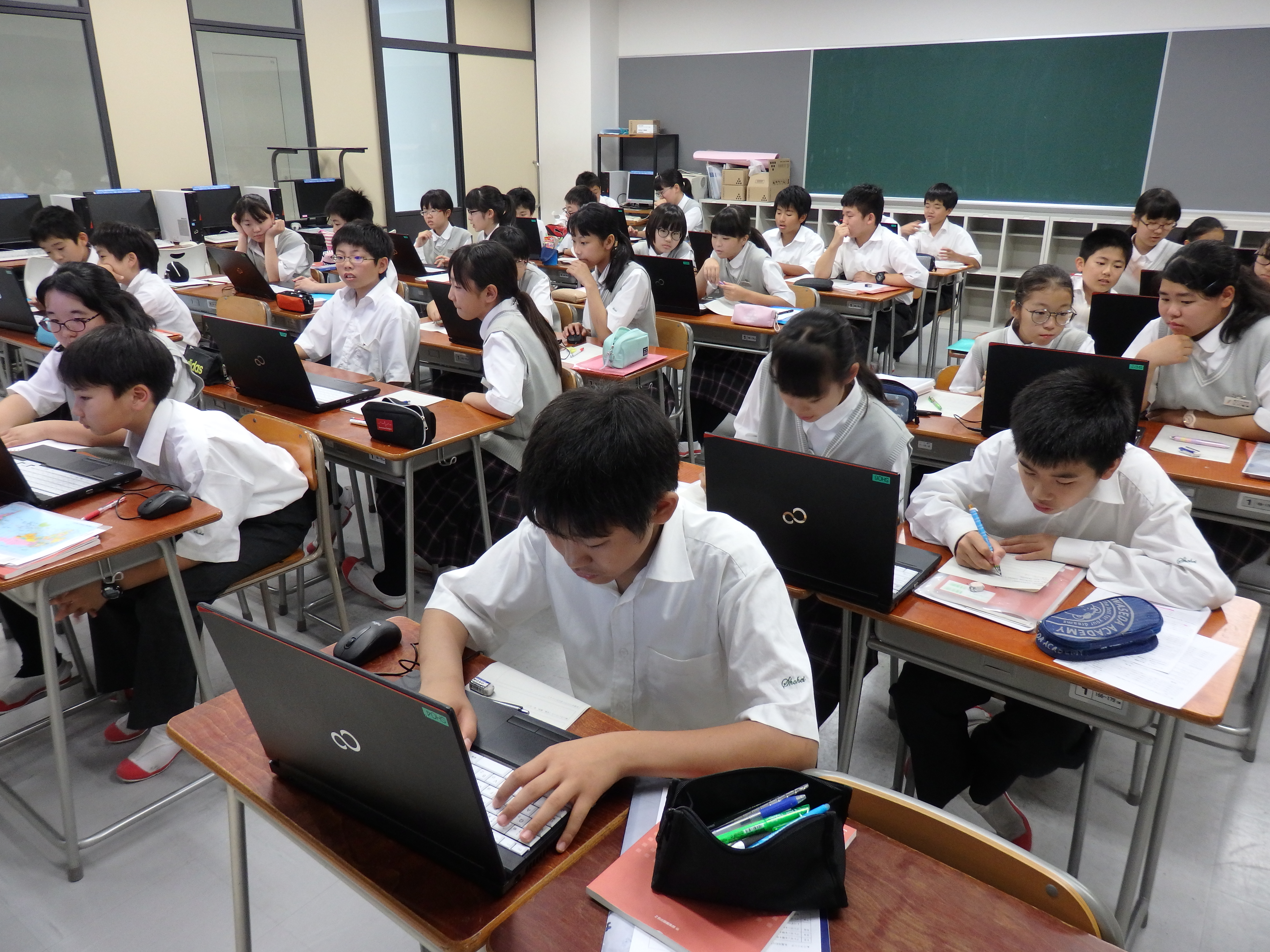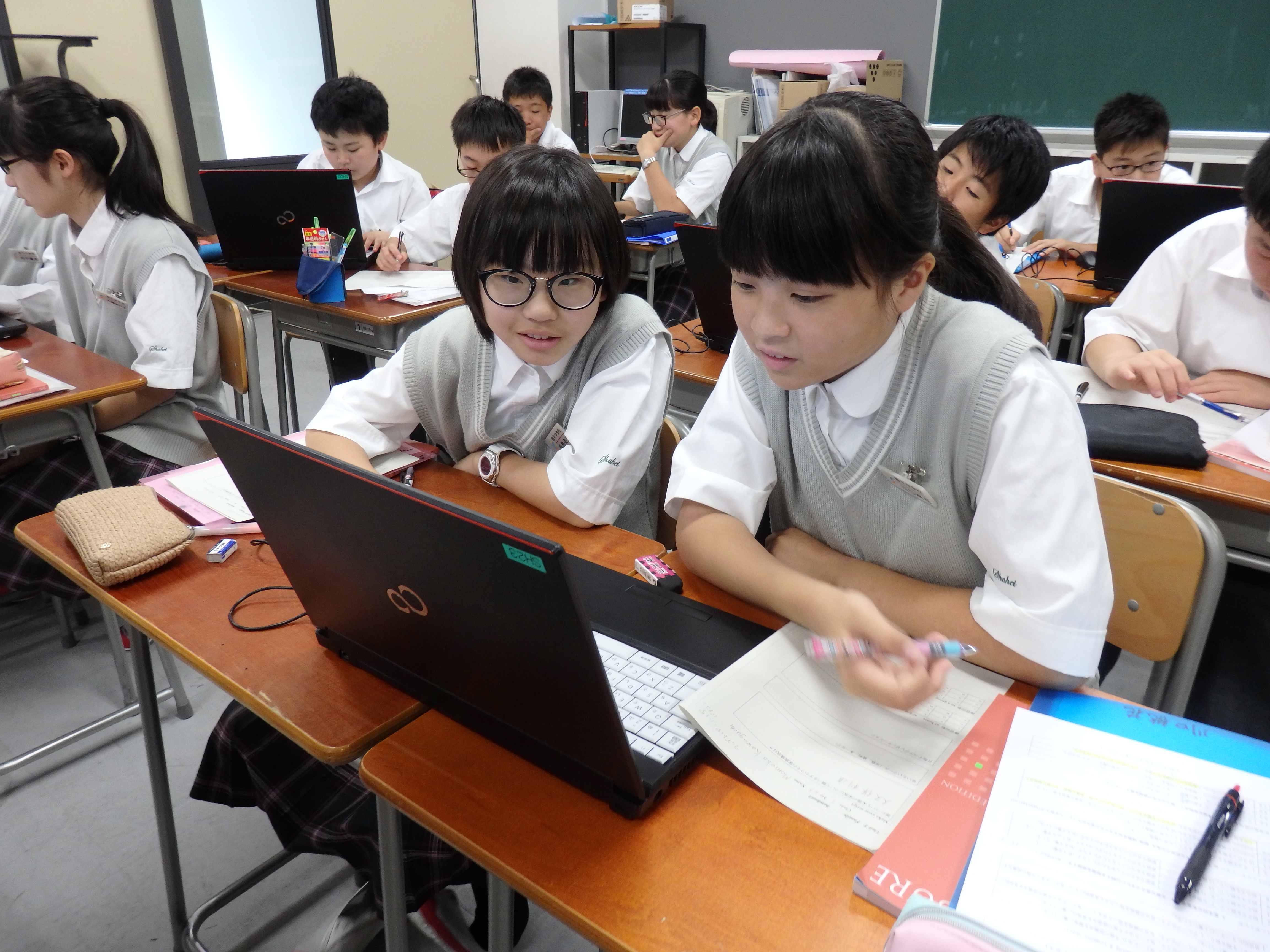 昌平中学・高等学校ではクラスの生徒全員が一度に使えるパソコンを備えた教室がいくつかあります。中学生が主に利用しているのがPC(パソコン)室です。今日は1年生が英語のIB(国際バカロレア)の授業でノート型パソコンを使いました。歴史上の人物のその家族についての調べ学習をするためにペアでパソコンを使いました。いろんなことを話し合いながら、良いプレゼンテーションにつながるように調べていました。今後はプレゼンテーションでパワーポイントも使う予定になっています。昌平を巣立った後も役に立つスキルが身に着くような授業を展開しています。