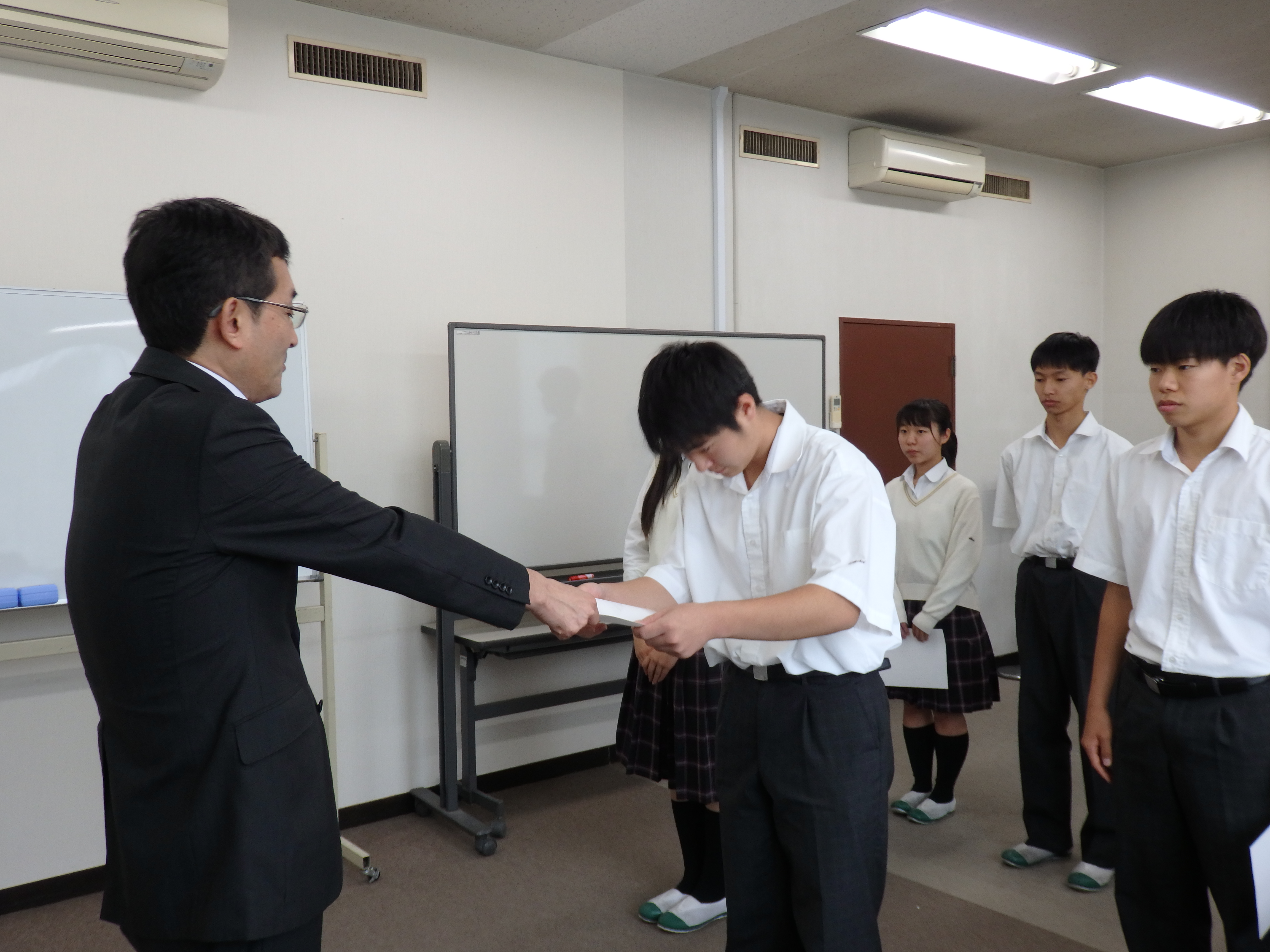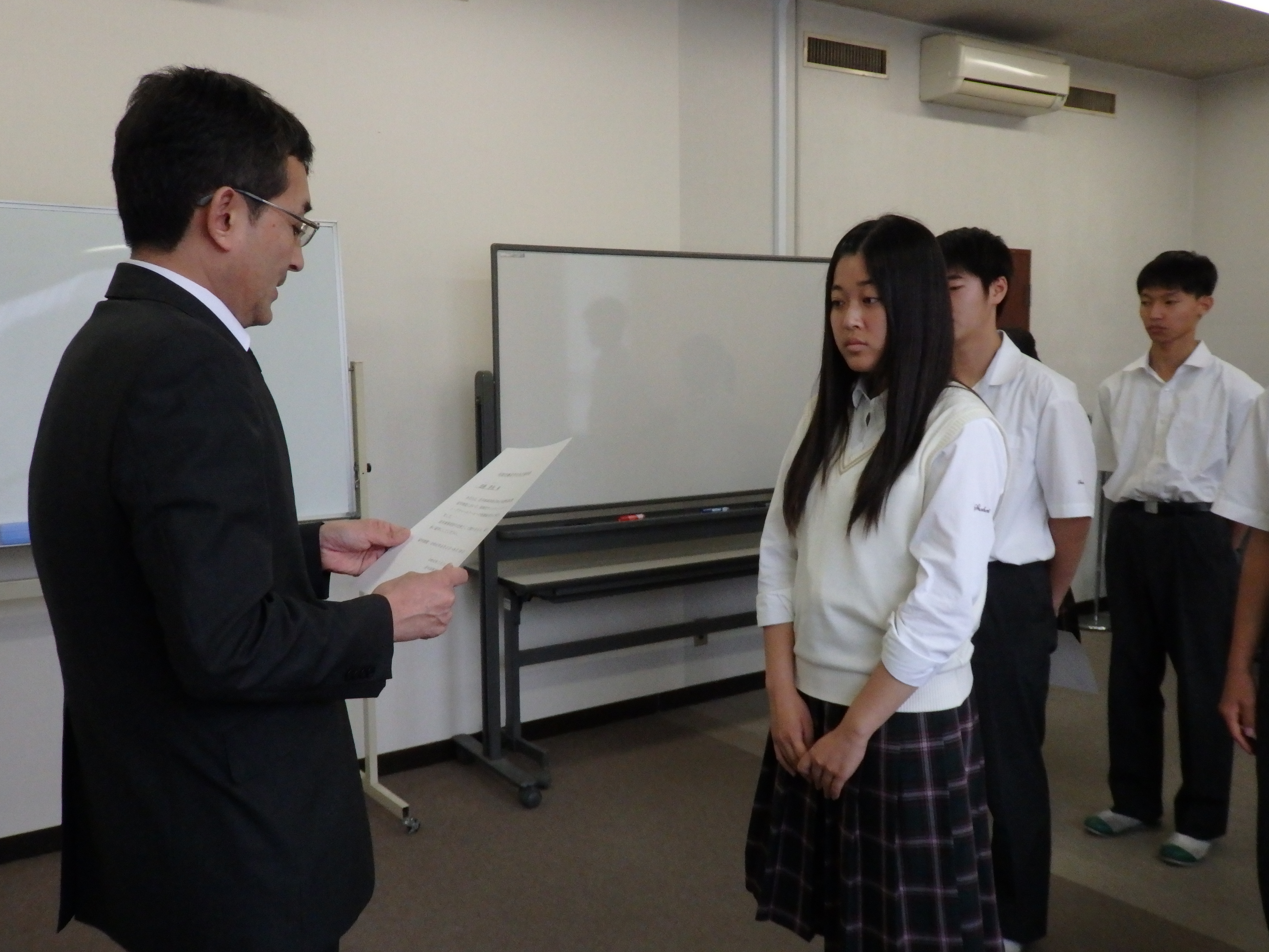 高校生対象の交換留学には毎年一貫生の先輩が選ばれています。今年度も英語の面接に合格した5名のうち、3名は一貫生(6期生)の先輩です。今日は決定通知授与式が行われました。面接では自分の考えや夢、決意などを英語でたくさん話していました。中学3年間で培った力が土台となり、高校での学習につながるということを示してくれています。約2か月、姉妹校2校で学校生活やホームステイなどから多くのことを学んでくるはずです。目標となる先輩がすぐ近くにいて、頑張る姿を見られるのも一貫校の良い点の一つです。