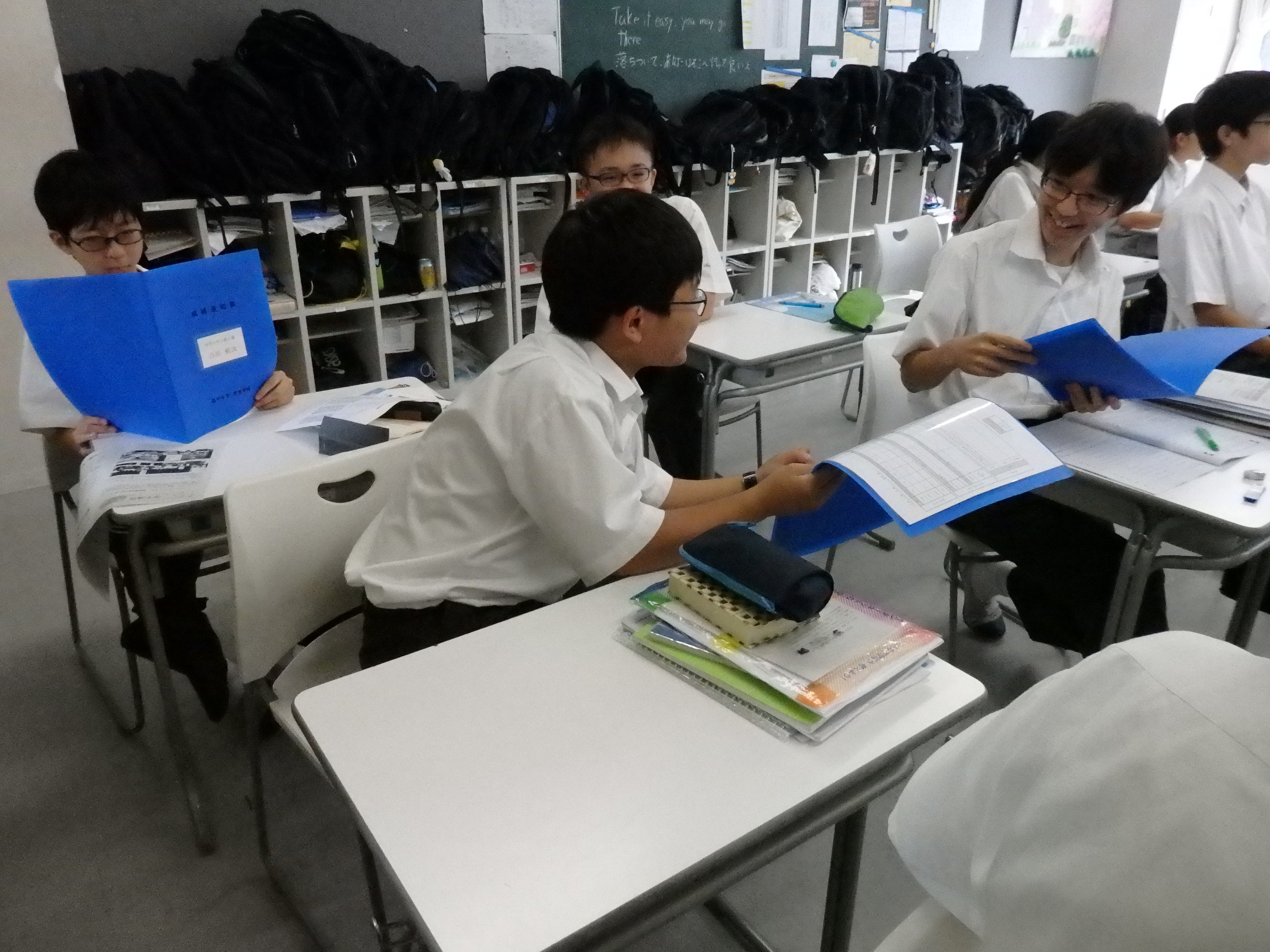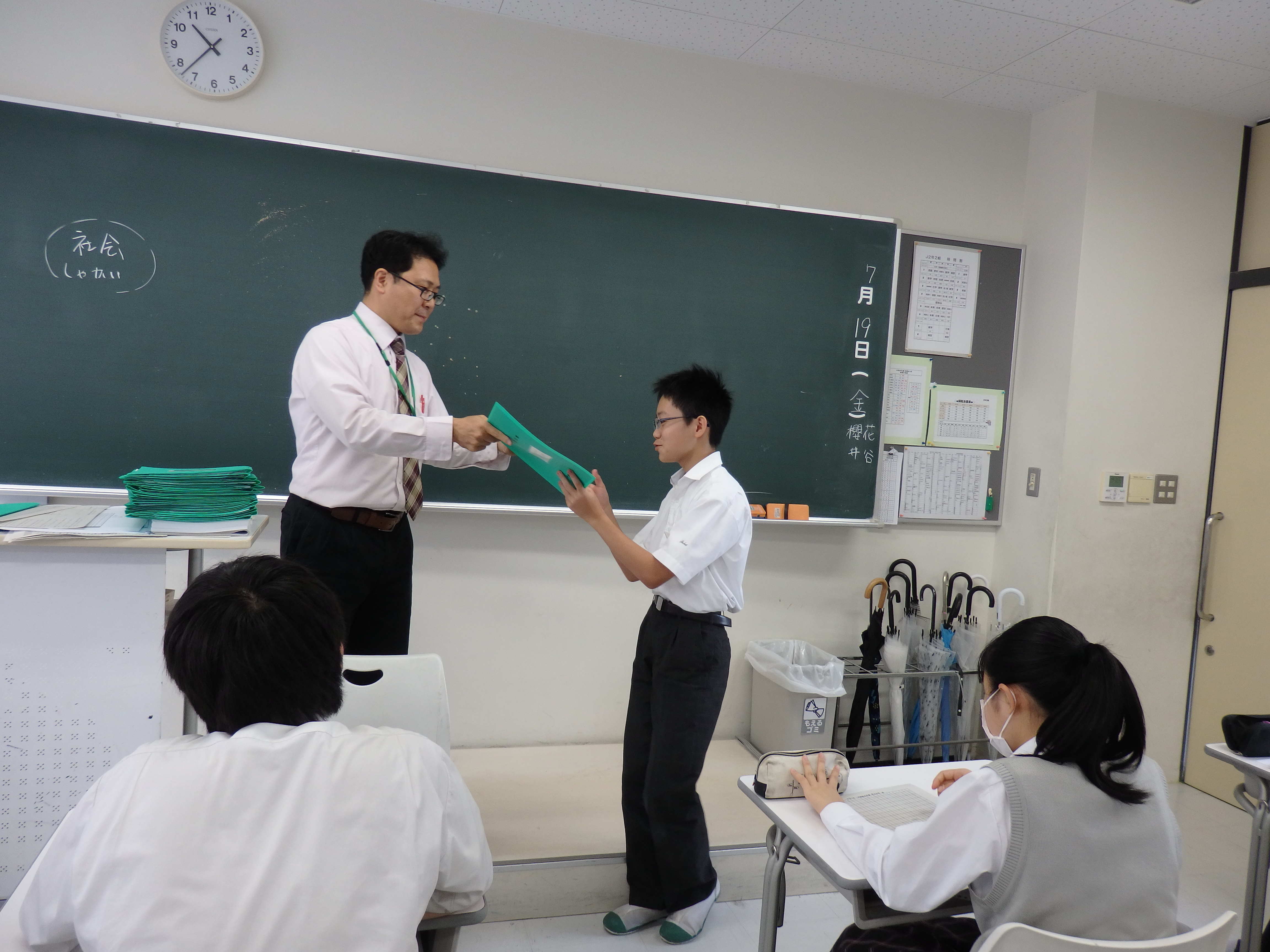 本日、1学期の終業式が行われました。いまだ梅雨が明けない中ではありますが、生徒達の表情は1学期間勉強をがんばった達成感や学校生活を楽しんだ充実感でいっぱいでした。特に1年生は入学してここまで必死に走り抜けてきたと思います。終業式の後は各教室で担任の先生方から通知表を受け取り、夏休みにこの結果をいかにつなげるべきかなどのお話をいただきました。夏期講習が来週いっぱいありますが、夏休み、スタートです。