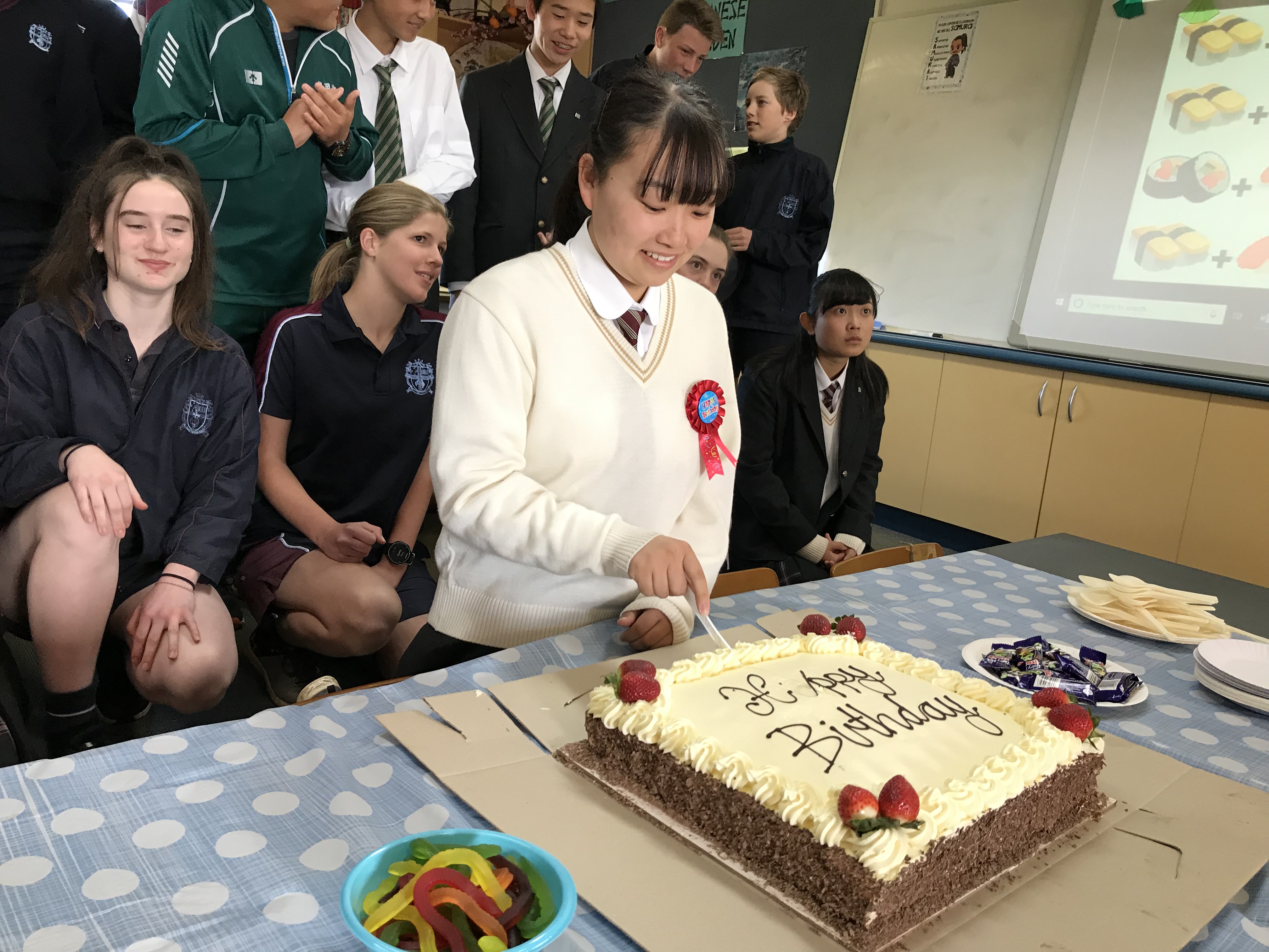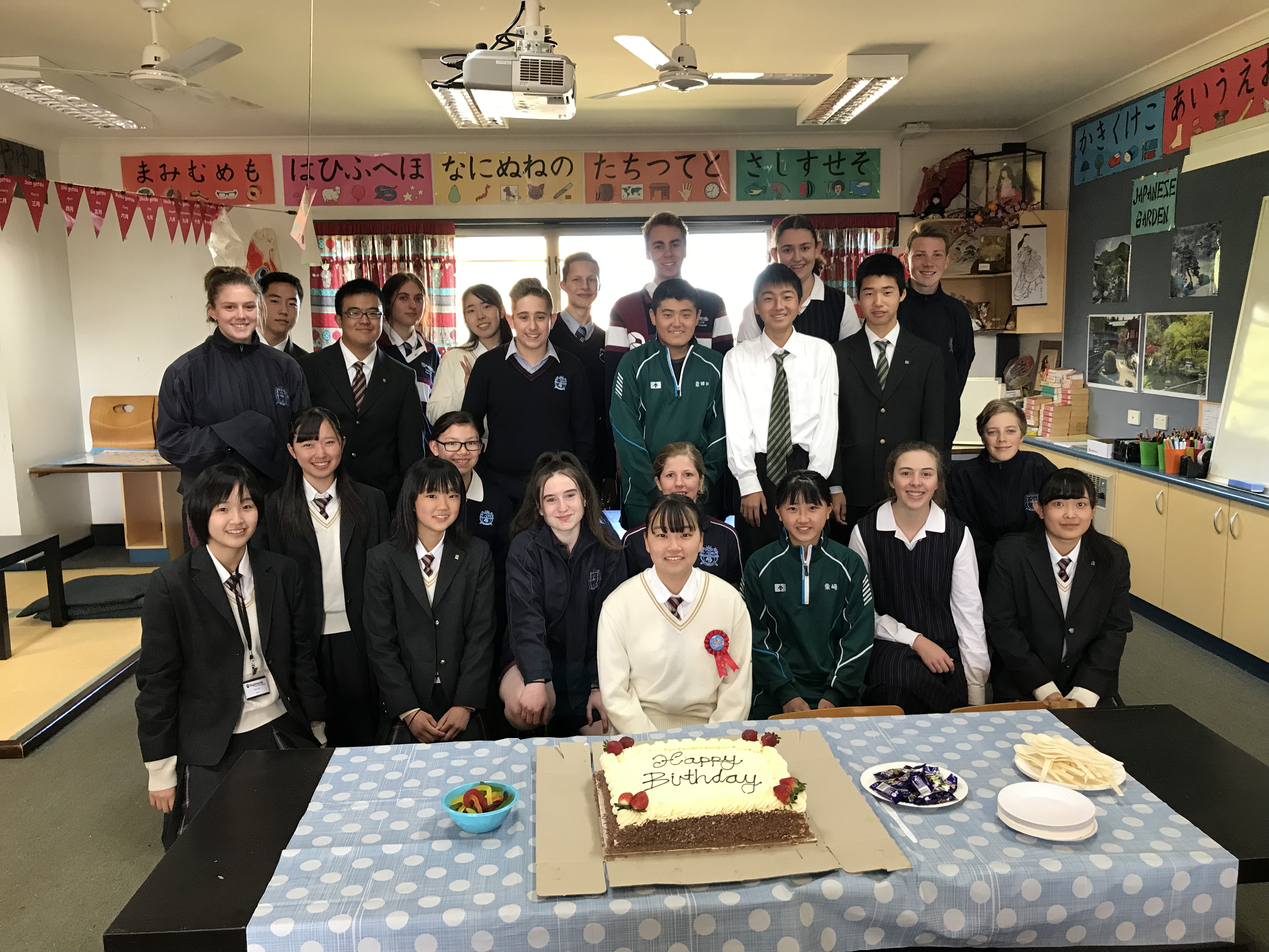 今日はハイランドで過ごす最終日、1日バディと一緒に授業を受けました。それぞれ、バディ以外の友だちもできたようです。モーニングティーの時間には、今日が誕生日の中山さんにハッピーバースデーのサプライズ! 今晩は、仲良くなったホストファミリーの方々に、しっかりと感謝の気持ちを伝えてくださいね。