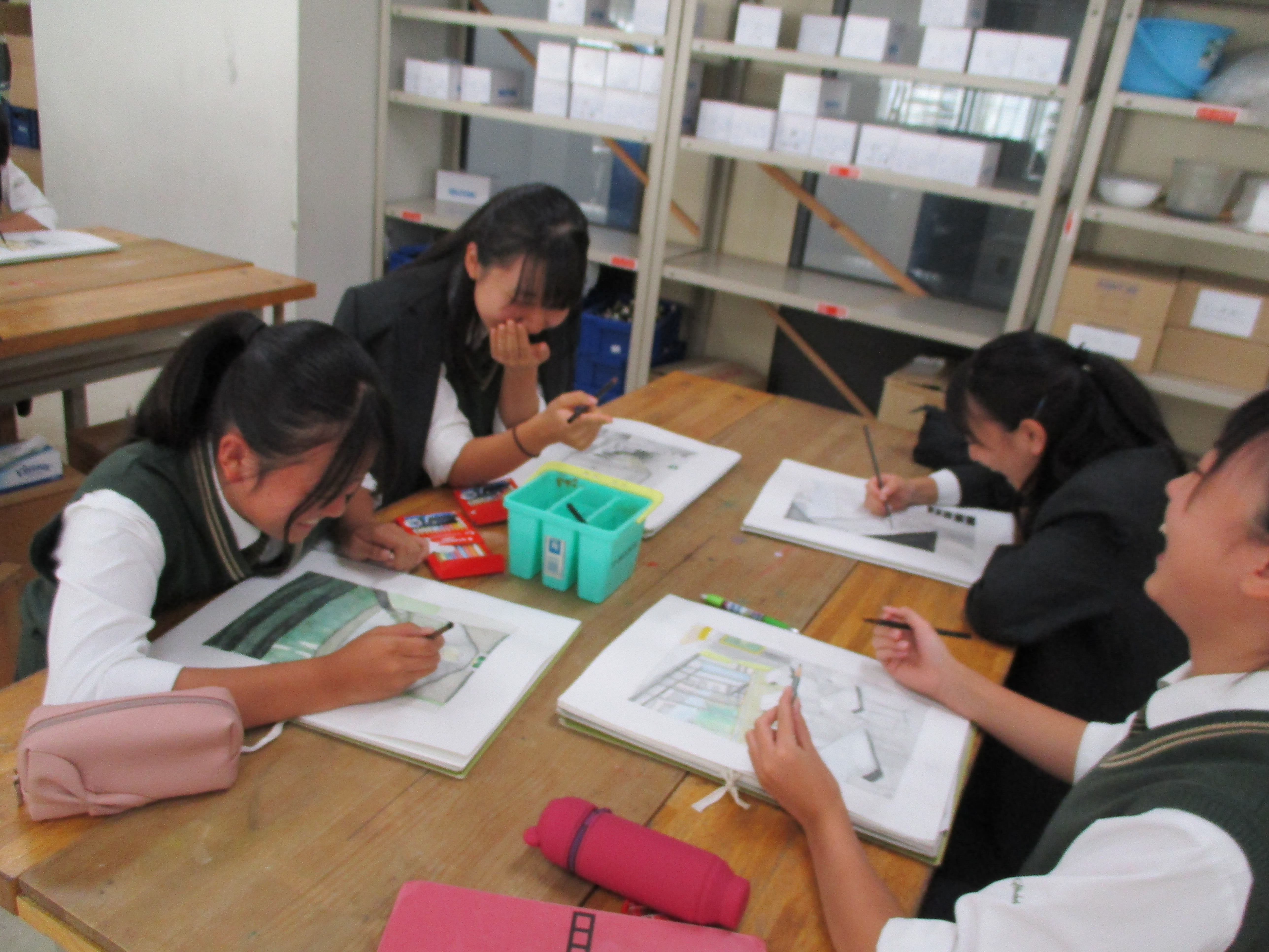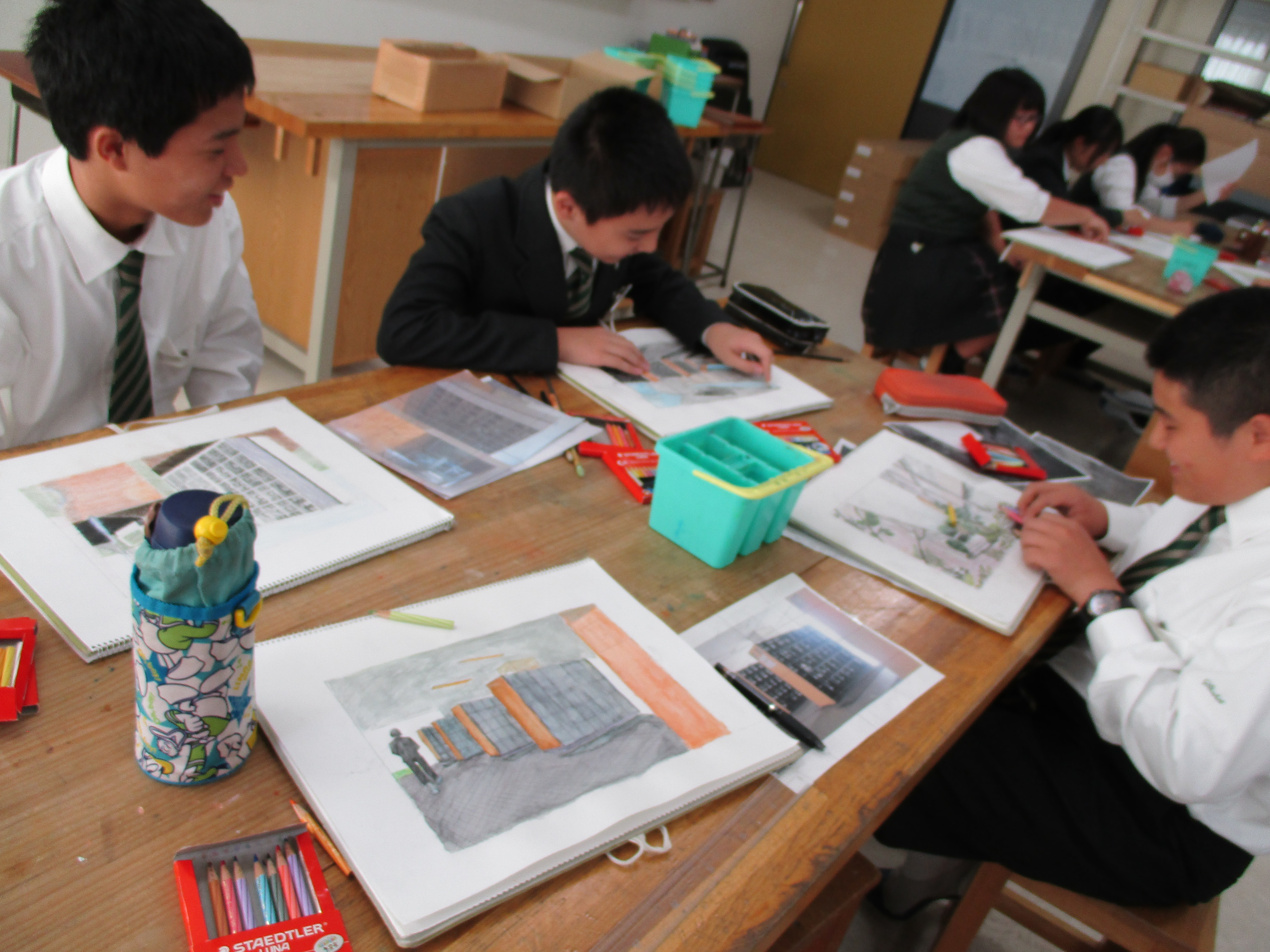 中学三年生は今美術の授業で風景画を書いています。風景の一部を切り取って、光や影を意識して立体的に作品を完成させていきます。先生からのアドバイスをもらい、完成に近づけていました。