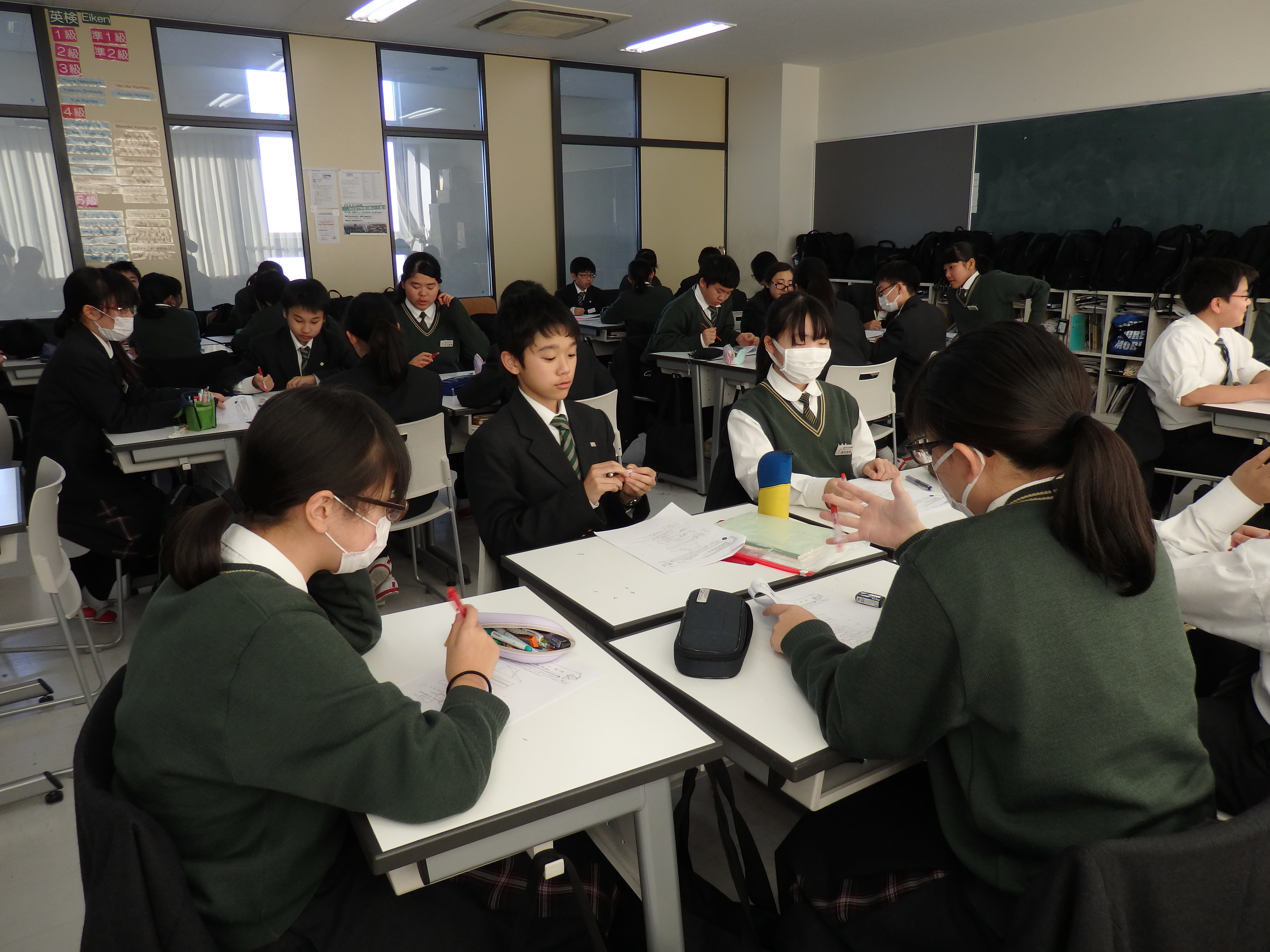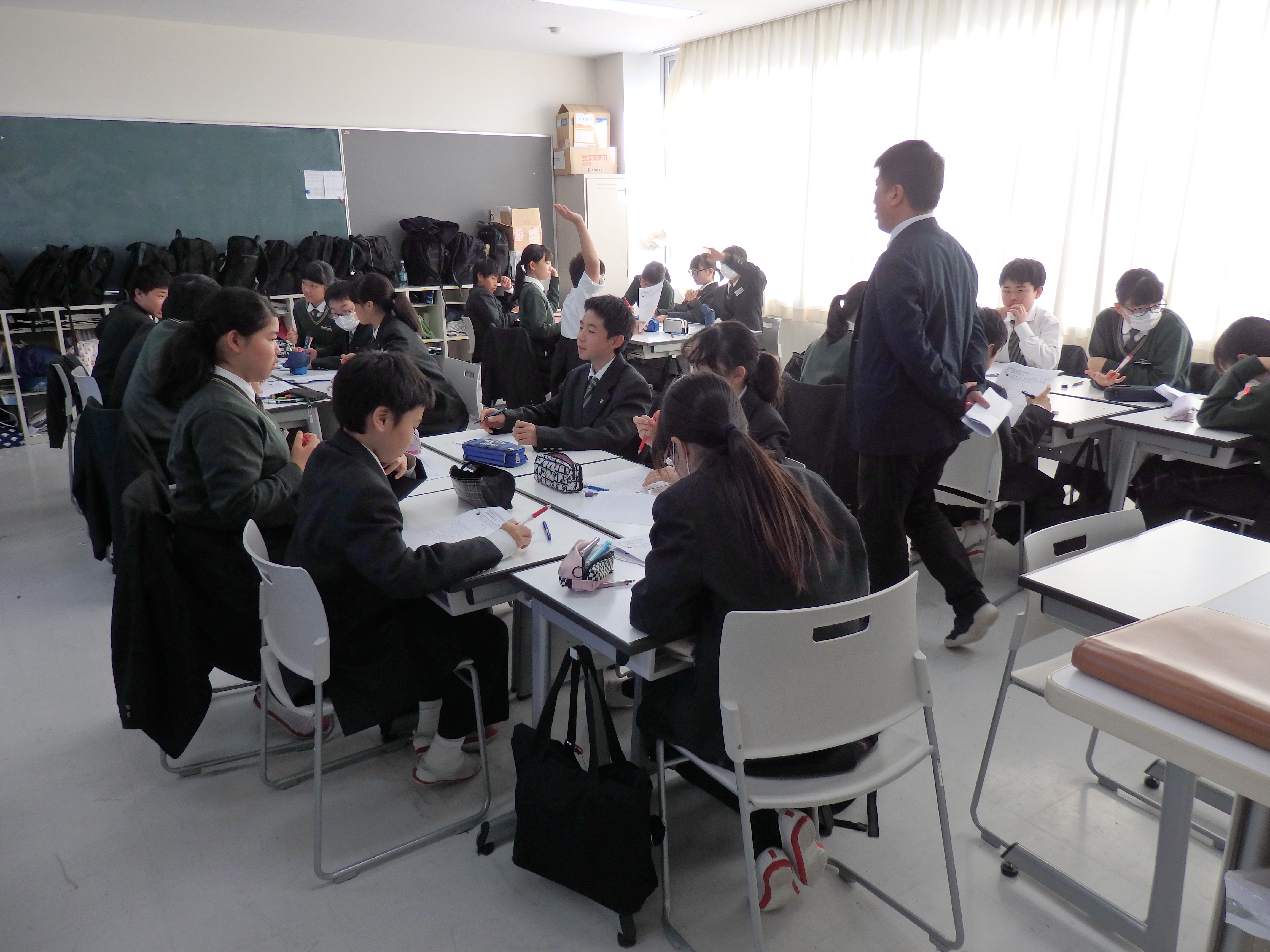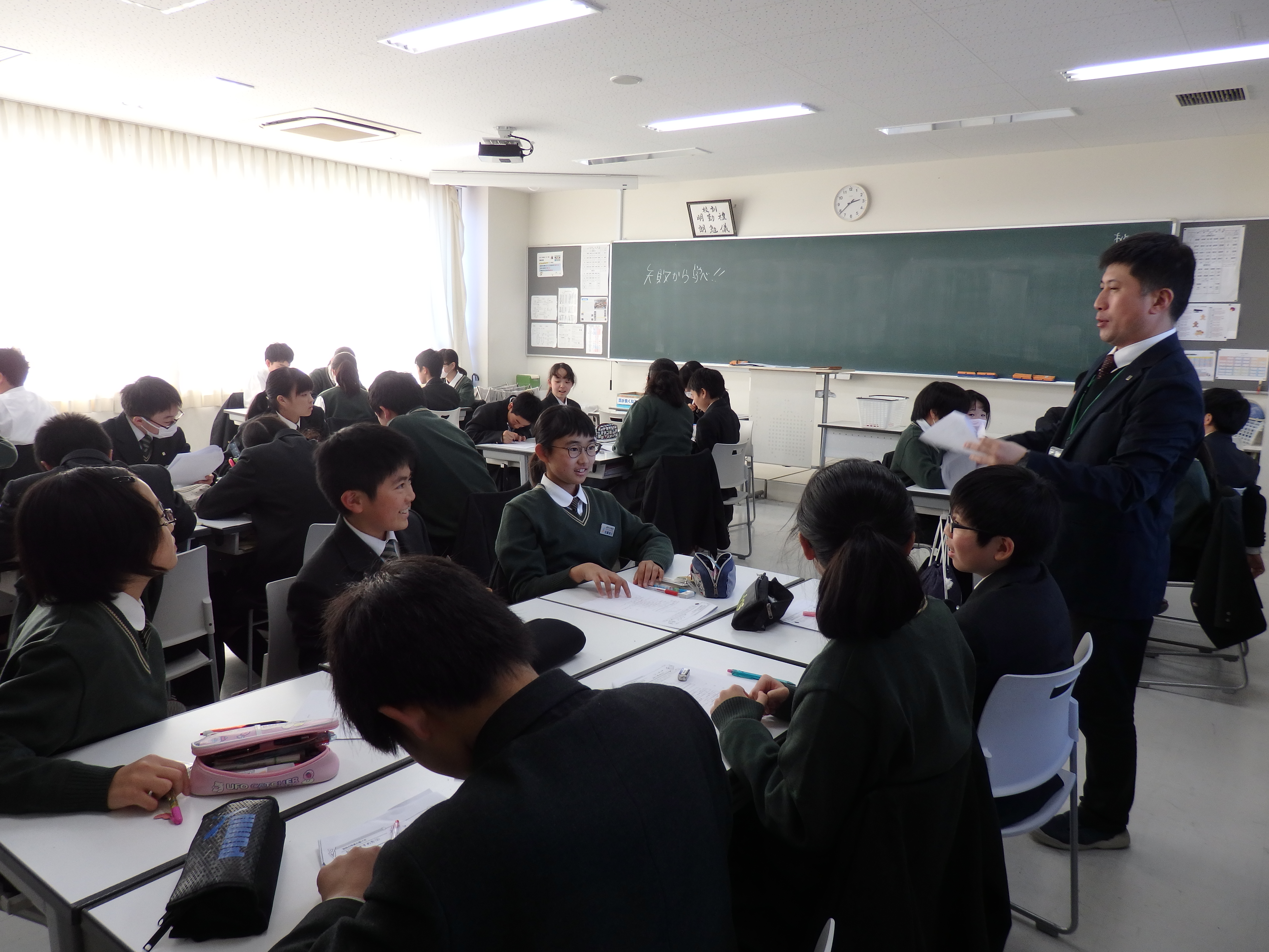 中学1年1組のLHRの様子です。来週月曜から始まる期末考査に向けて学習会を行いました。内容は幾何の証明問題です。まず最初に個人で解き、その後グループで話し合い答え合わせをします。本当にその答えでいいのか、自分はどこでつまづくのか、積極的に学ぶ姿がありました。単に答えを覚えるだけでなく、筋道を立て答えを作り出す力が高まりました。