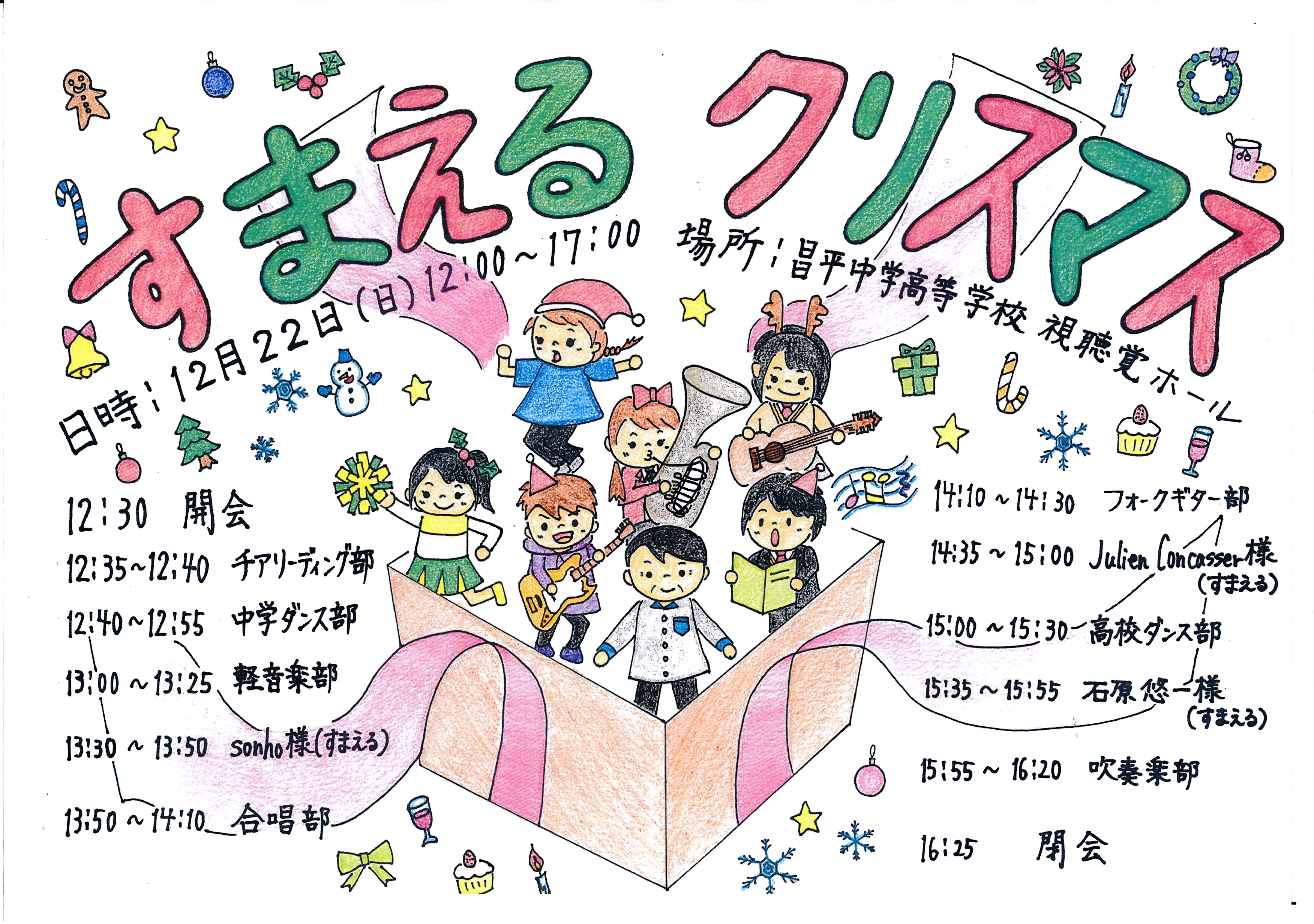 今年も12月22日(日)12:00~17:00にすまえるプロジェクトとのコラボ企画を行います。ただいま、生徒会を中心に、生徒による装飾が着実に進んでいます。各参加団体もクリスマスコンサートに向けての準備を進めています。 すまえるプロジェクト・クリスマスコンサートの案内は以下の画像を参照してください。ご来場、お待ちしています。
