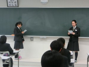 中学2年生の授業風景です。有名な「走れメロス」のワンシーン、メロスが妹の結婚式から戻ってくるまでの間のセリヌンティウスと暴君ディオニスの会話を想像して寸劇を行いました。どのペアも作品をしっかりと理解したうえで、オリジナリティ溢れるストーリーを考えていました。演技にも工夫を凝らしていて、見ごたえのある発表になりました。