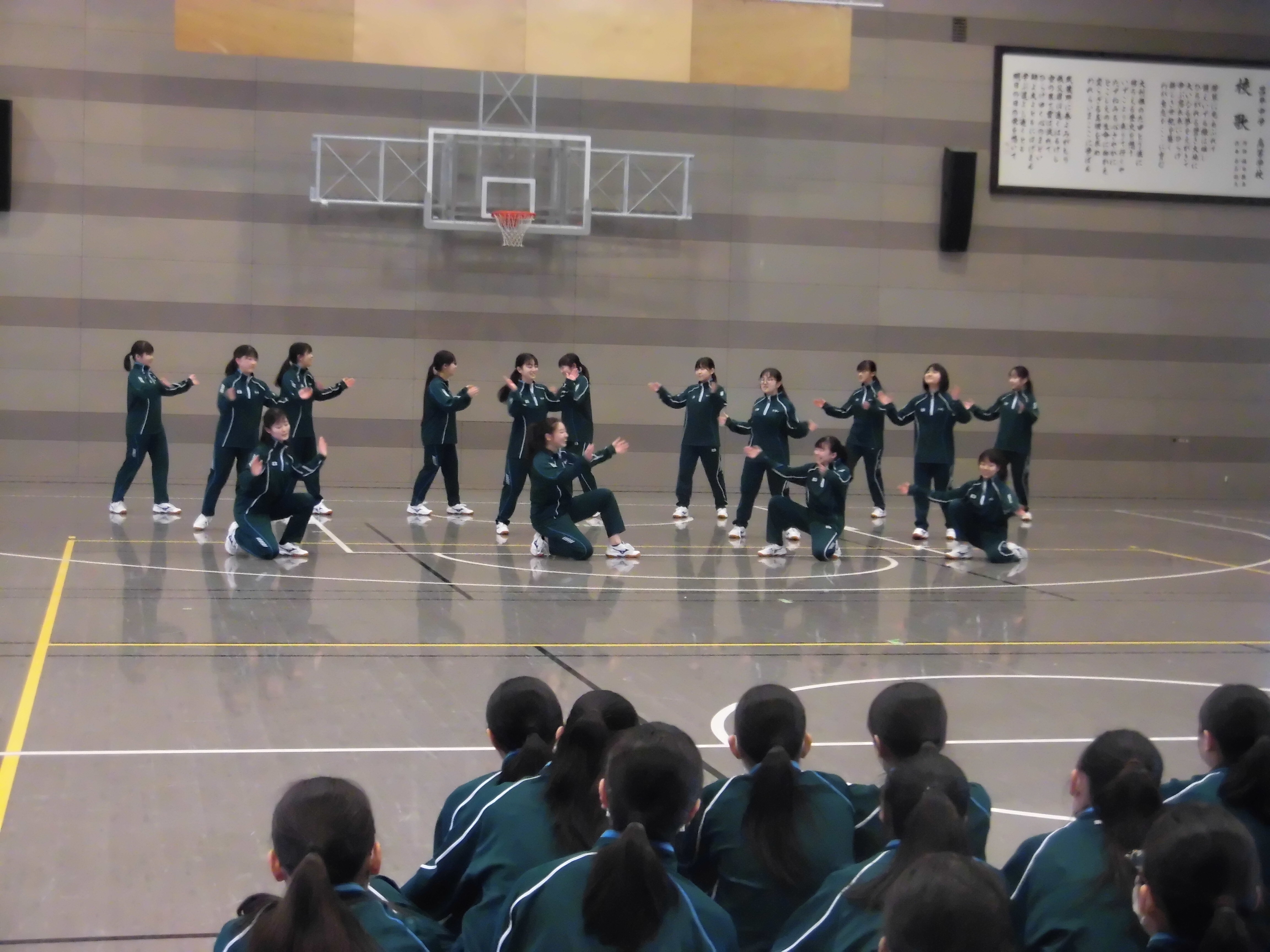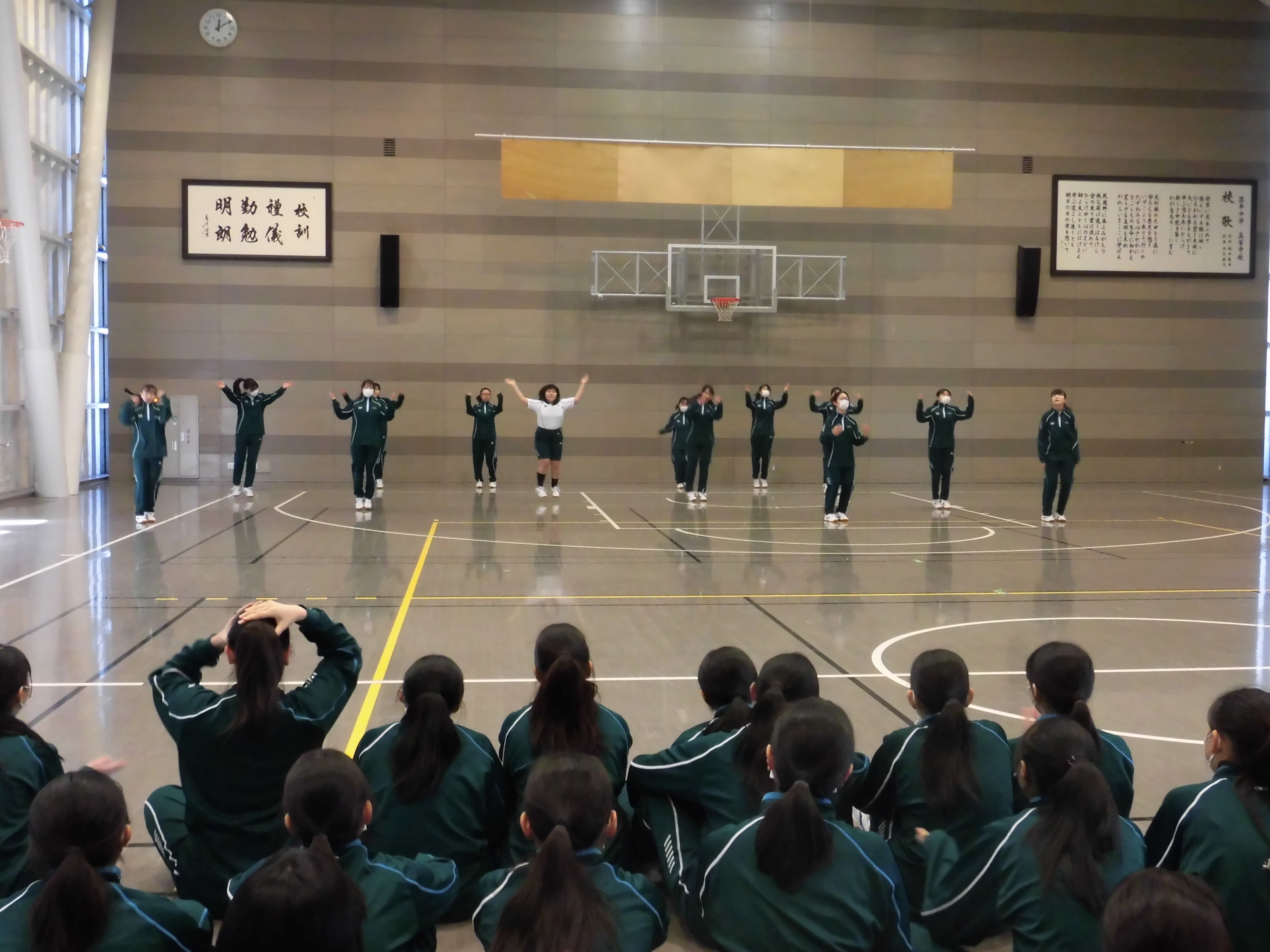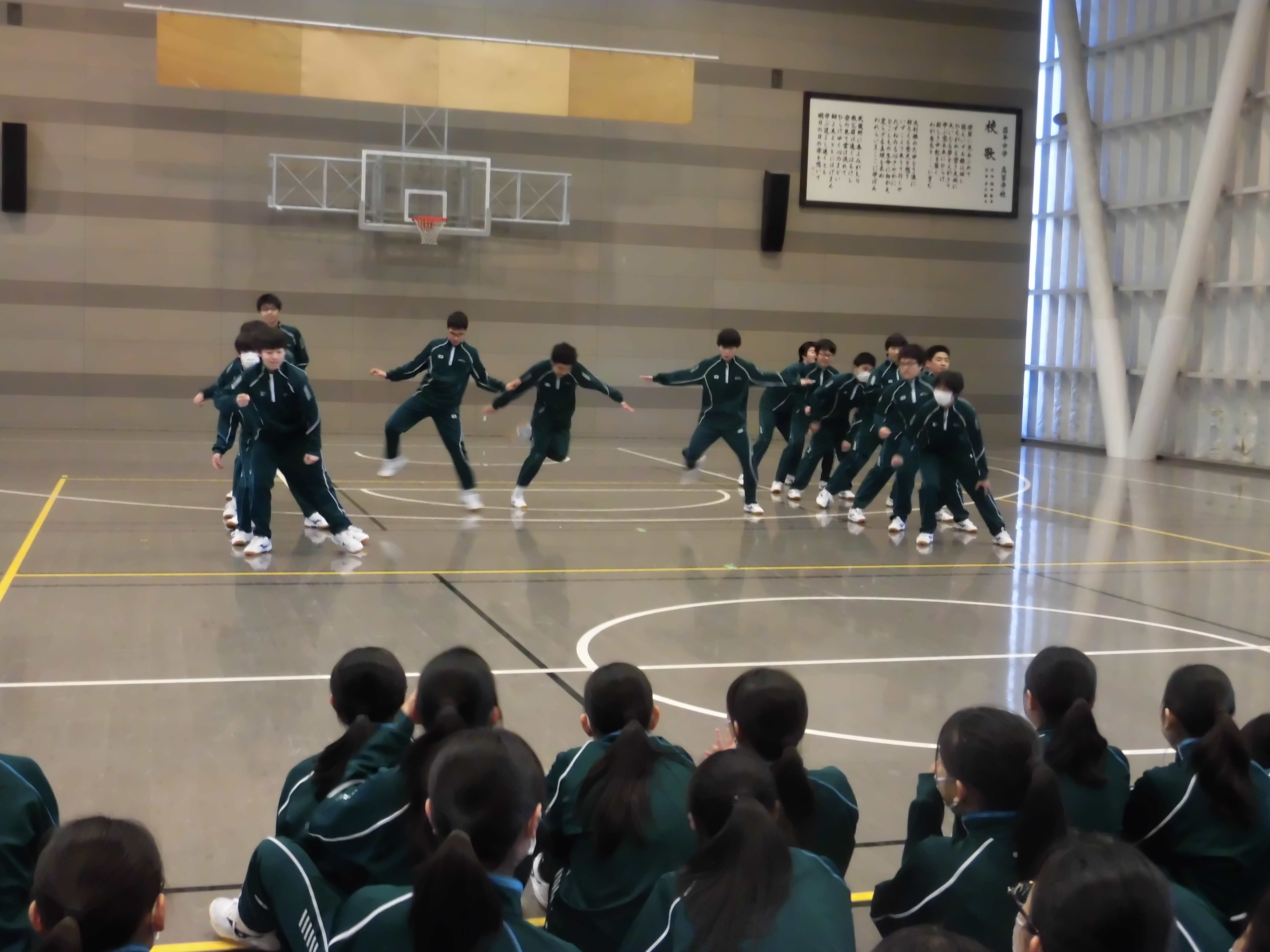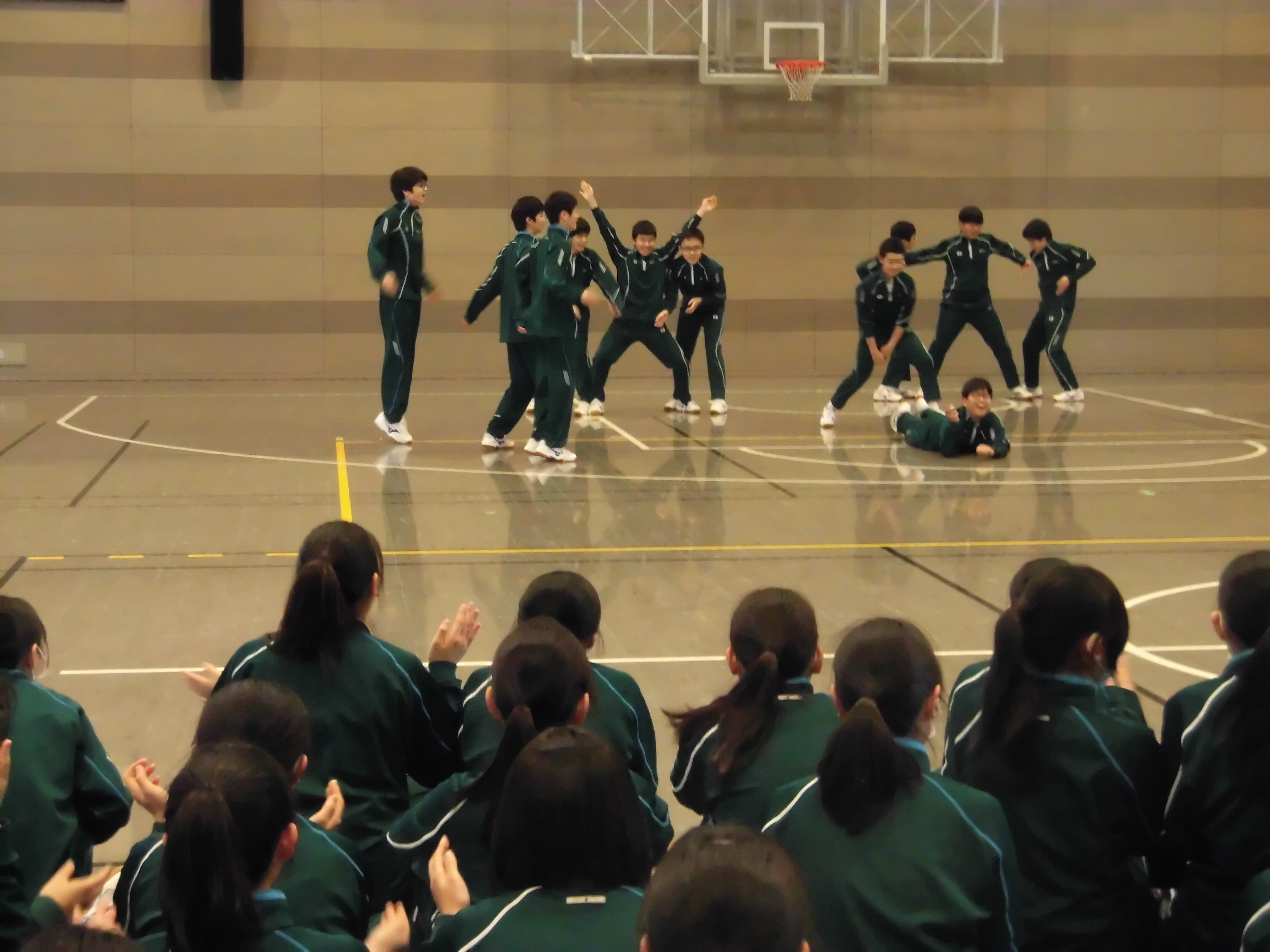 本日4限の体育の時間に、中3創作ダンス発表会が行われました。各クラスが男子チーム・女子チームに分かれ、自分たちで創作して練習を重ねてきたダンスを披露。曲はコカ・コーラのCM曲としても有名な「世界はあなたに笑いかけている」です。どのチームも工夫を凝らした楽しいパフォーマンスを見せてくれました。