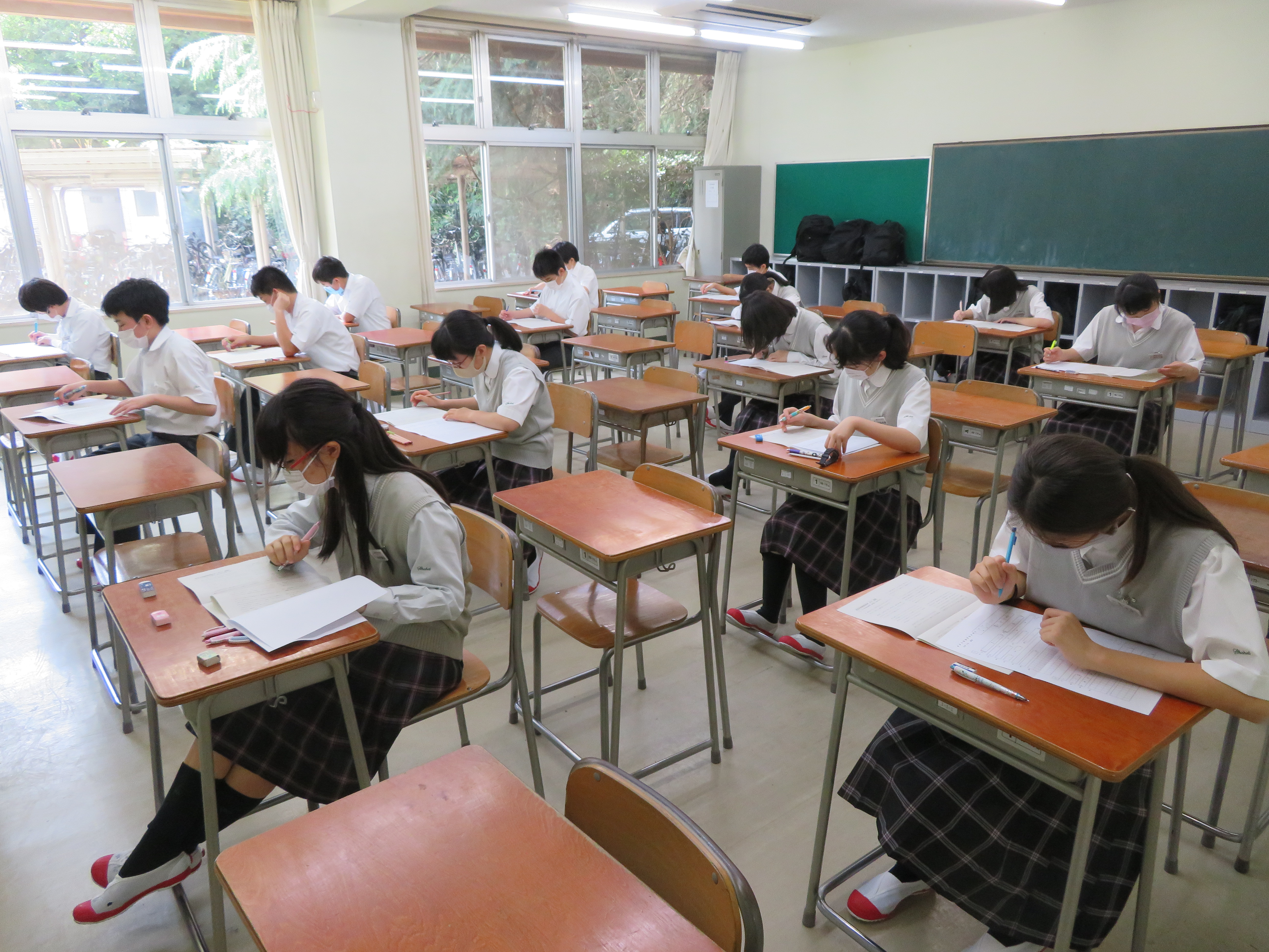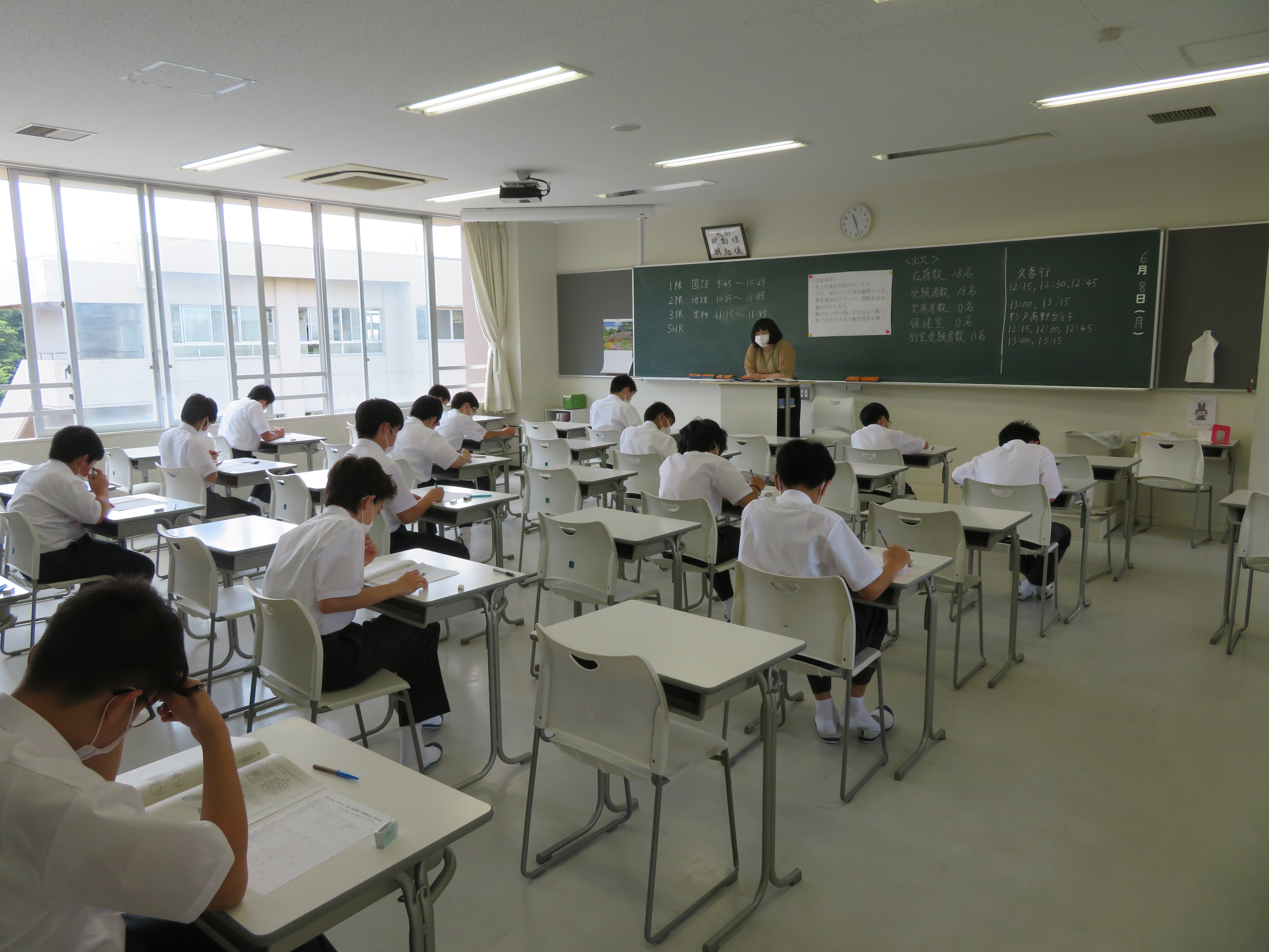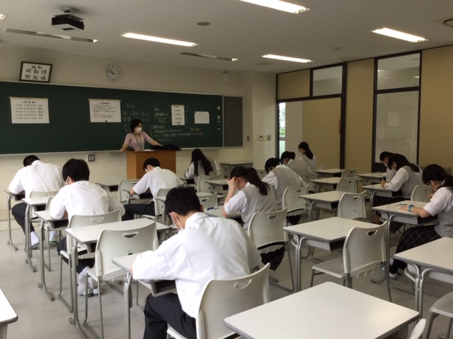 全学年で休校期間中学習確認考査が始まりました。休校期間中、生徒はオンライン授業を受けることに加えて、配布・WEB配信された課題に励みました。本日からの考査は、教室の密を避けるために、1クラスを2教室に分けて行っています。久しぶりの考査ではありますが、生徒は気持ちをしっかりと切り替え、真剣に受けていました。1年生にとっては初めての考査であり、開始直後には、緊張している姿も見受けられましたが、徐々に落ち着いて受けることができるようになりました。休校期間中学習確認考査は、10日(水)、12日(金)と続きます。