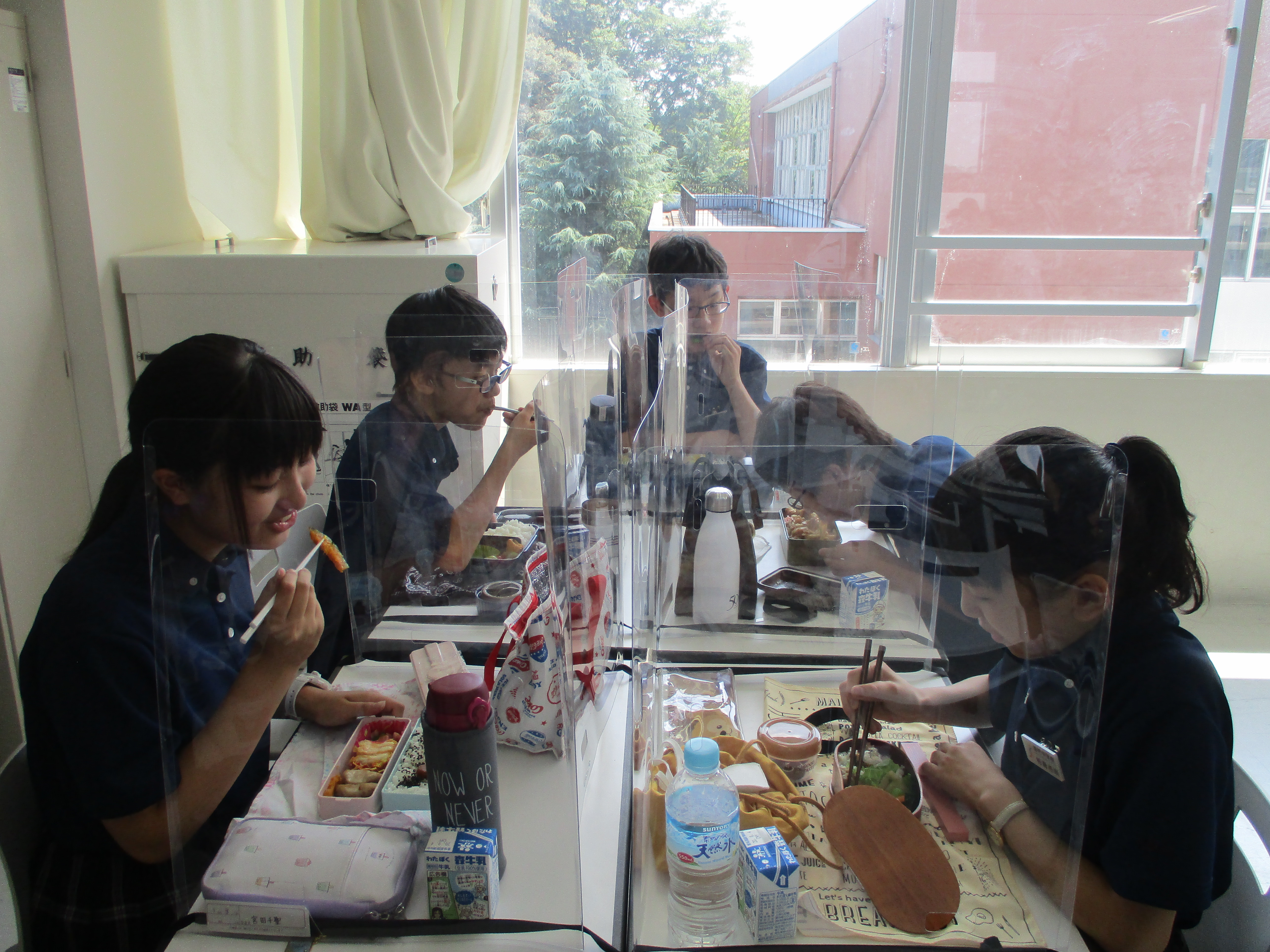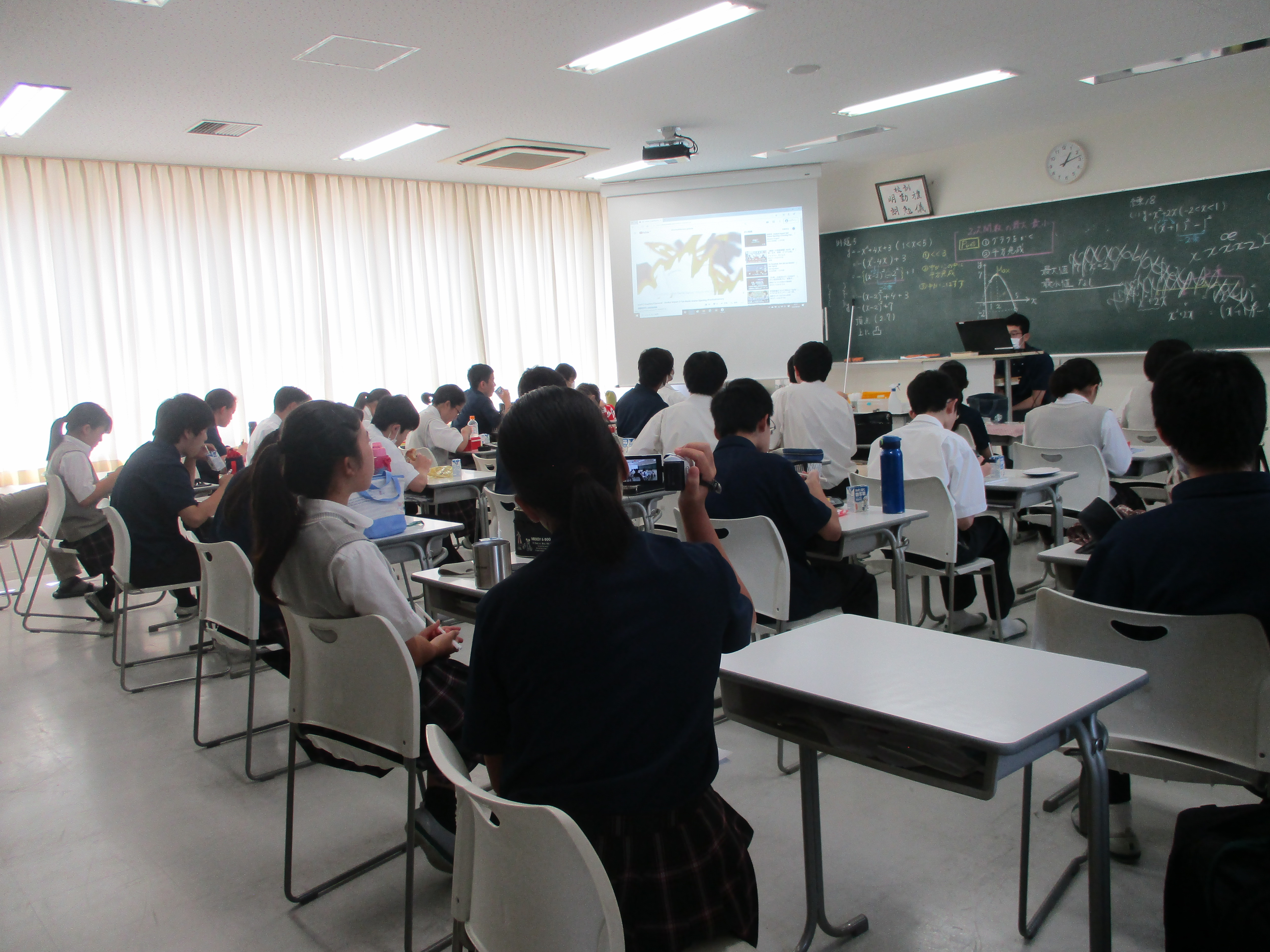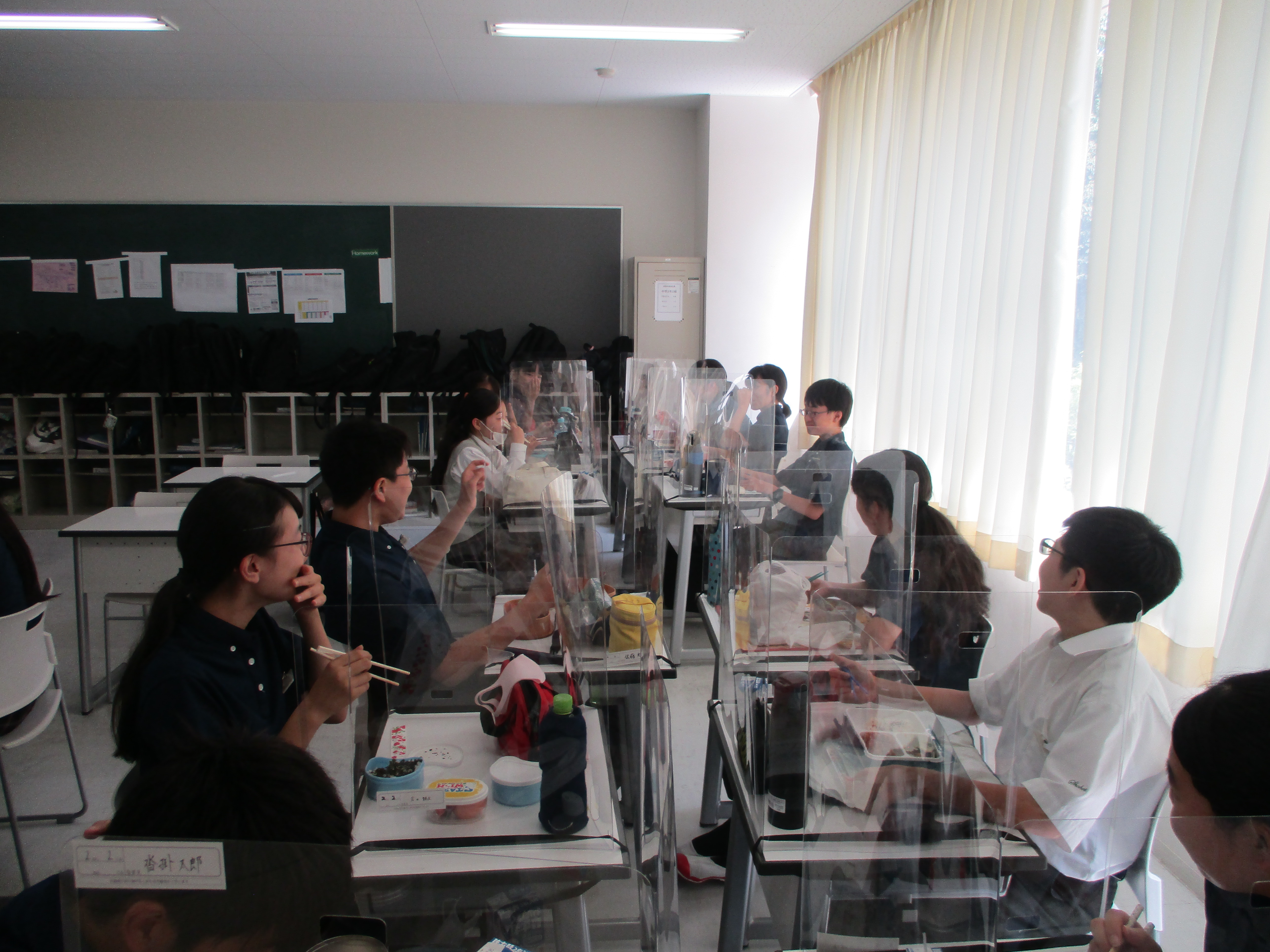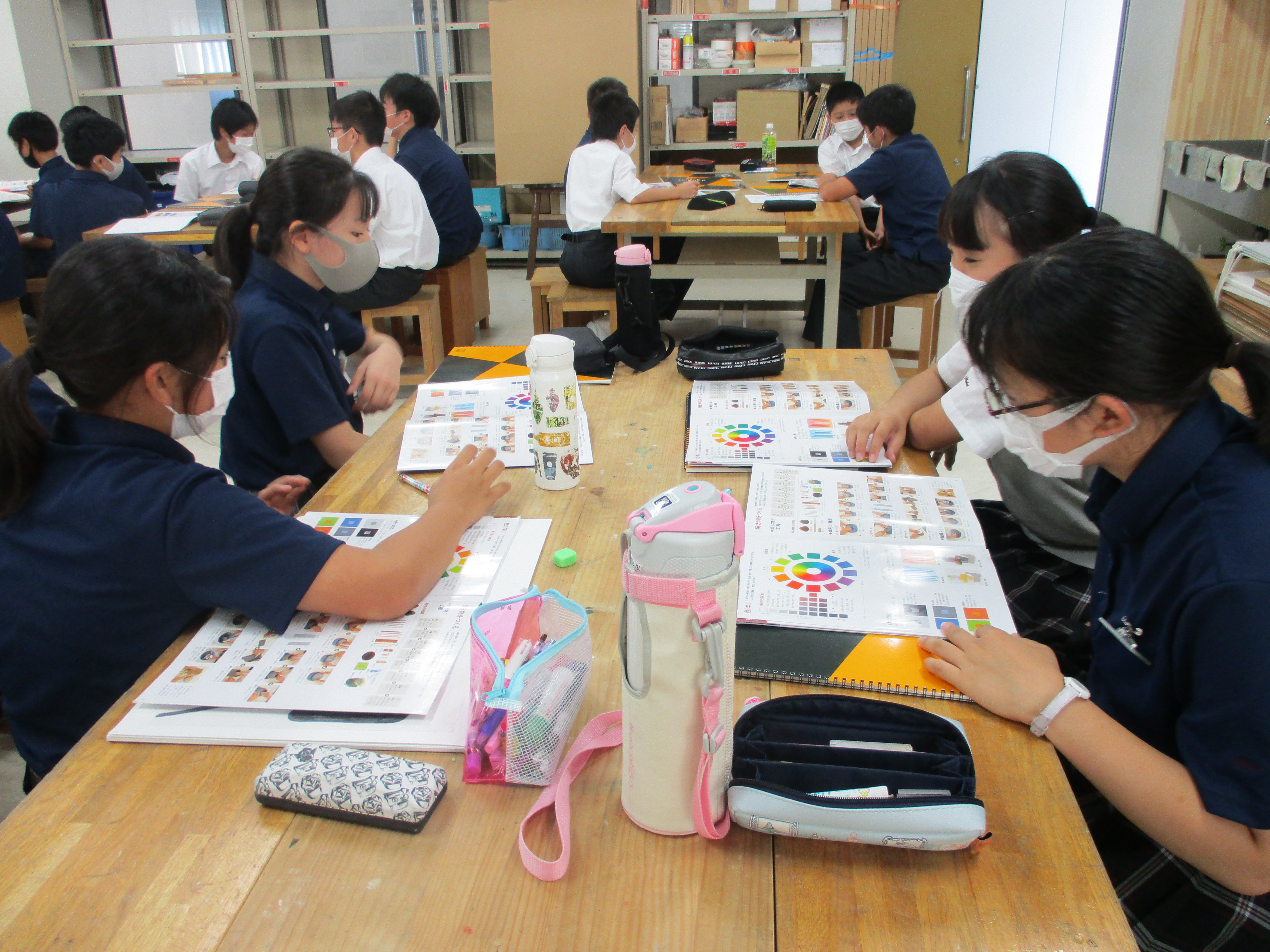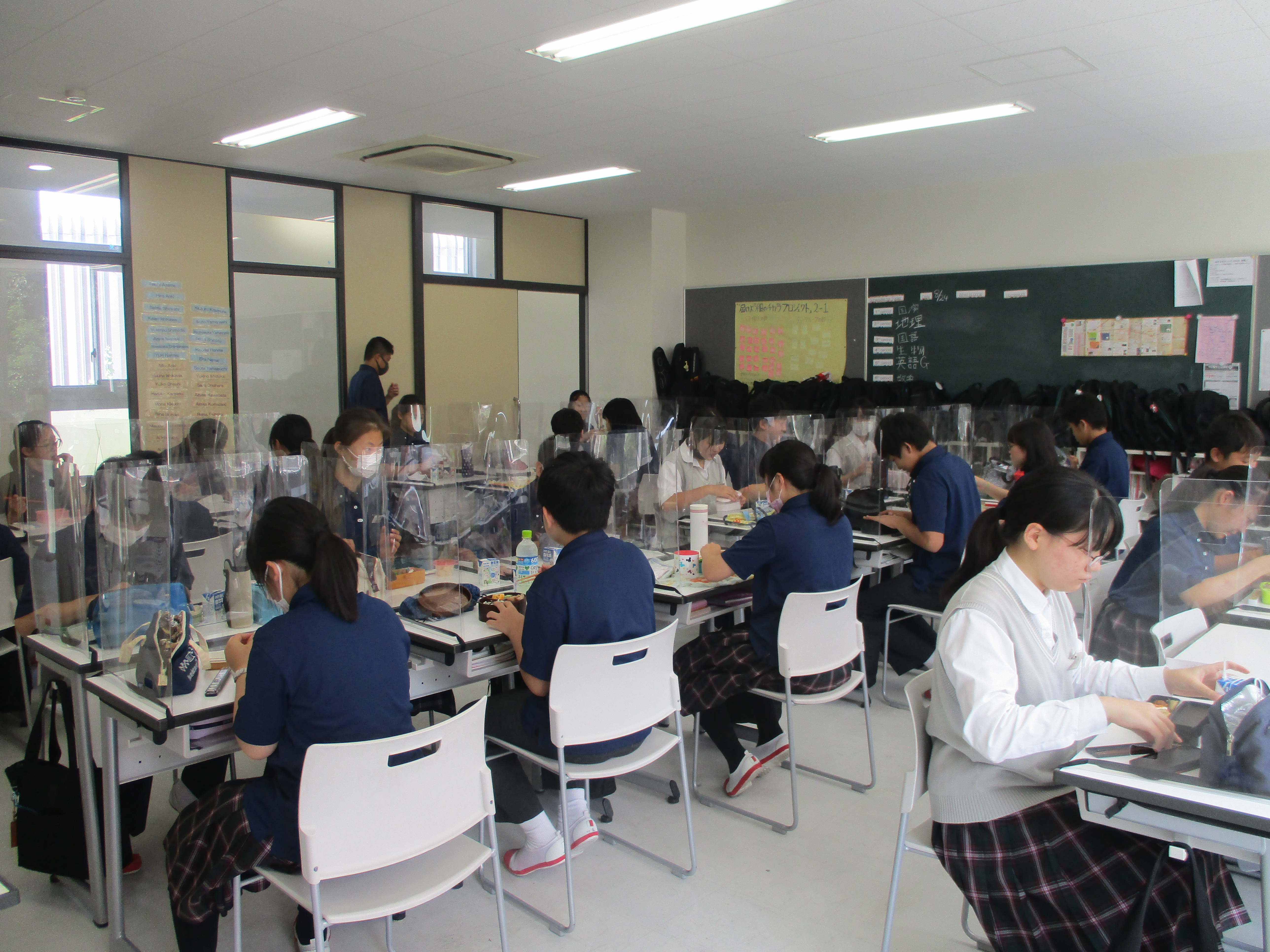 例年よりも短かった夏休みも終わり、今日から2学期の通常授業が始まりました。中1の美術の授業では、色の三要素について学びました。生徒達は2学期から飛沫防止パネルを使って昼食を食べています。1年生は入学してから全員が前を向いて昼食をとっていたので、初めて班ごとに向き合って食べ、少し緊張しているようでした。2年生は班ごとに食べるのは慣れているようで、昼食を楽しんでいました。3年生は昼食の時間に映像を見ながら、飛沫が飛ばないように黙々と食事をしていました。それぞれの「生活様式」で昼休みを過ごしています。制限のある生活の中から、安全に学校生活を楽しむ方法を見つけていきましょう!