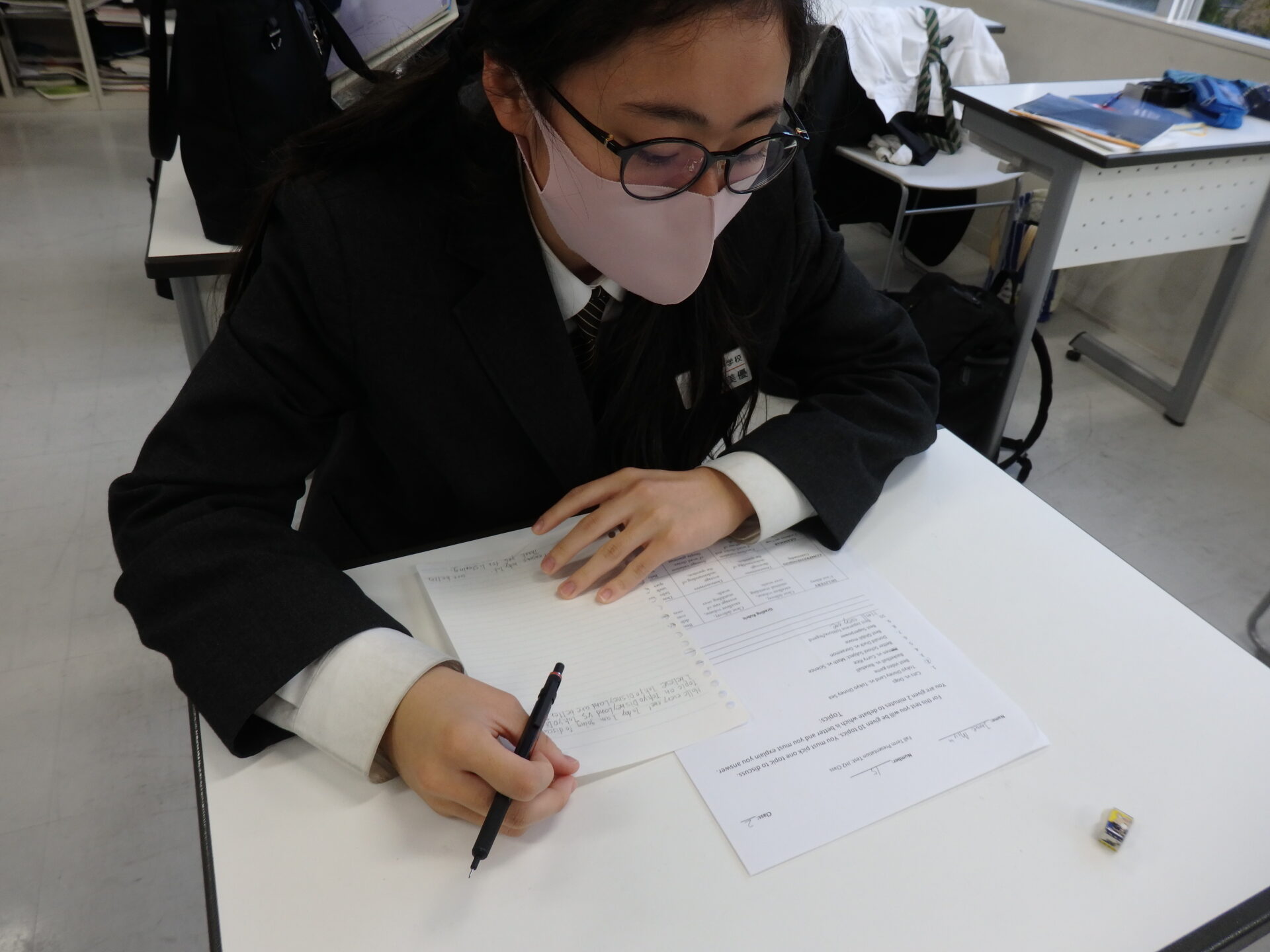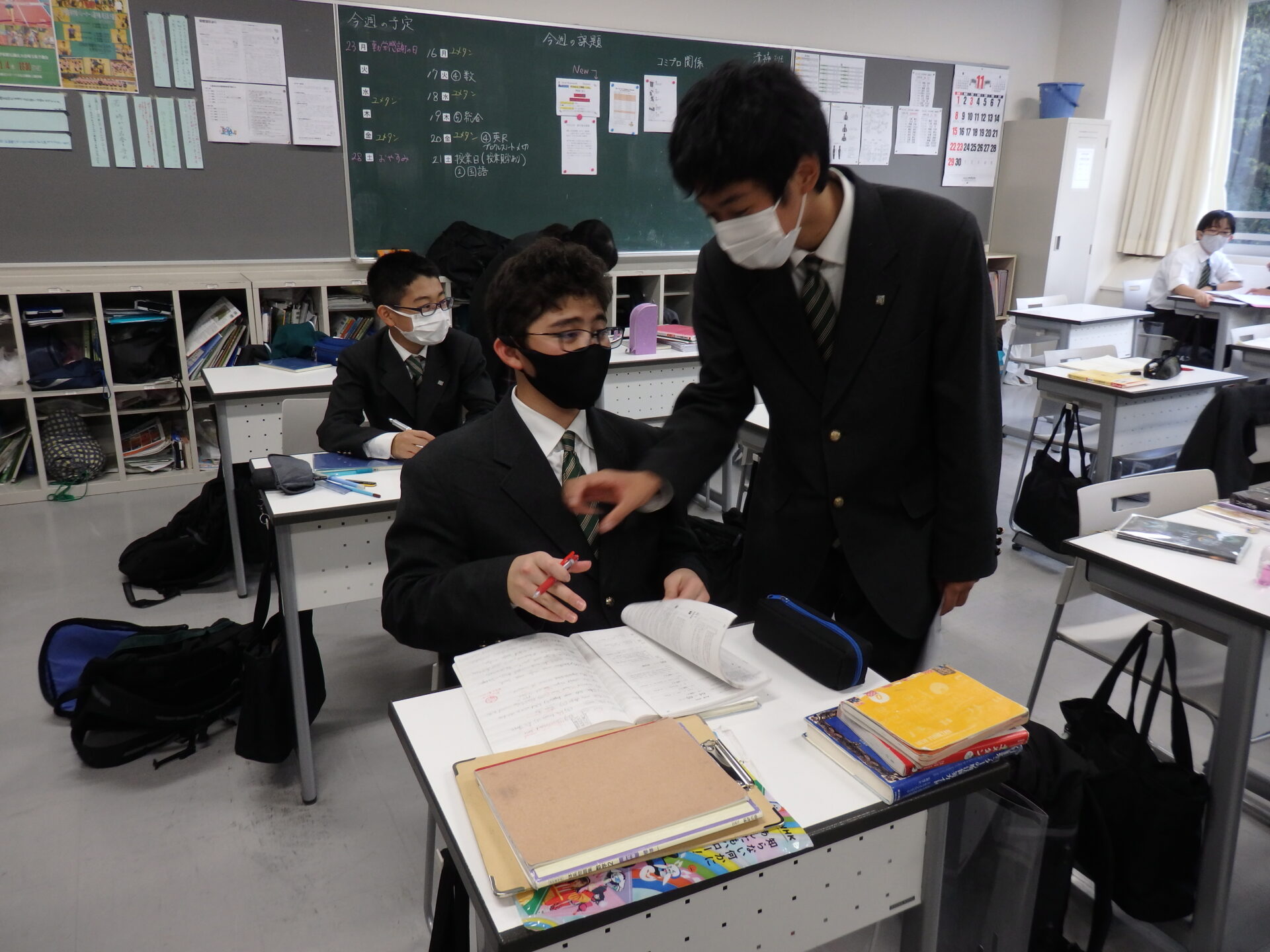 放課後紹介ウィーク、中3に引き続いて今回は中2をご紹介いたします。中2は3学年の中で一番生徒数も多く、何事にも積極的でパワフルな学年です。放課後は部活、学習、面談などで過ごしていました。英語のIB(国際バカロレア)の授業でスピーチ発表も近いので、原稿のチェックと練習をしている生徒もいます。あと4ヶ月ちょっとで3年生になるという自覚が少しずつ芽生えているのも感じますね。