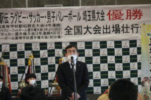 学校長からの激励が終わると、杉戸町長 古谷様から応援メッセージをいただいたり、JA埼玉みずほ様より贈呈品として激励米を授与していただきました。
