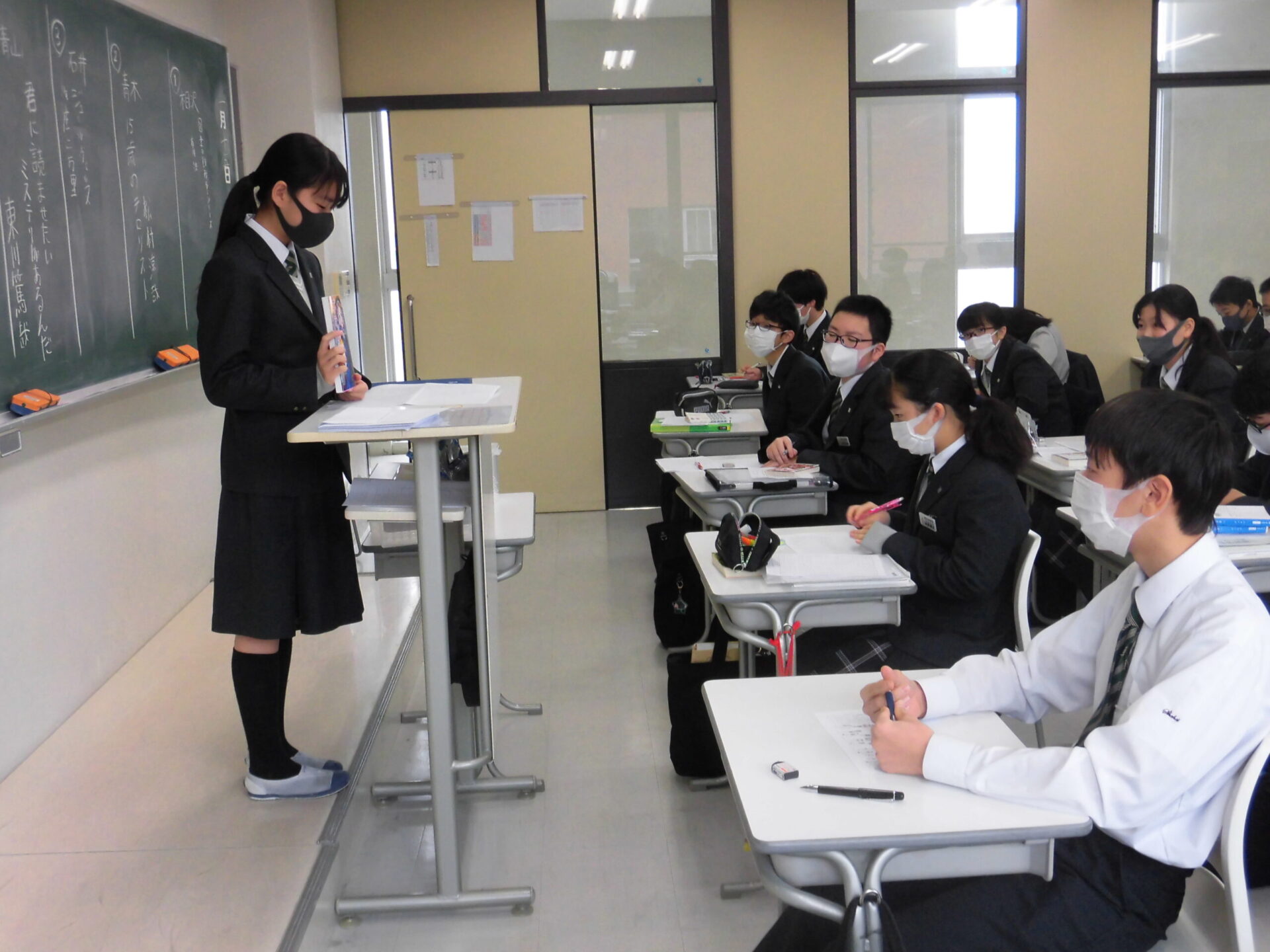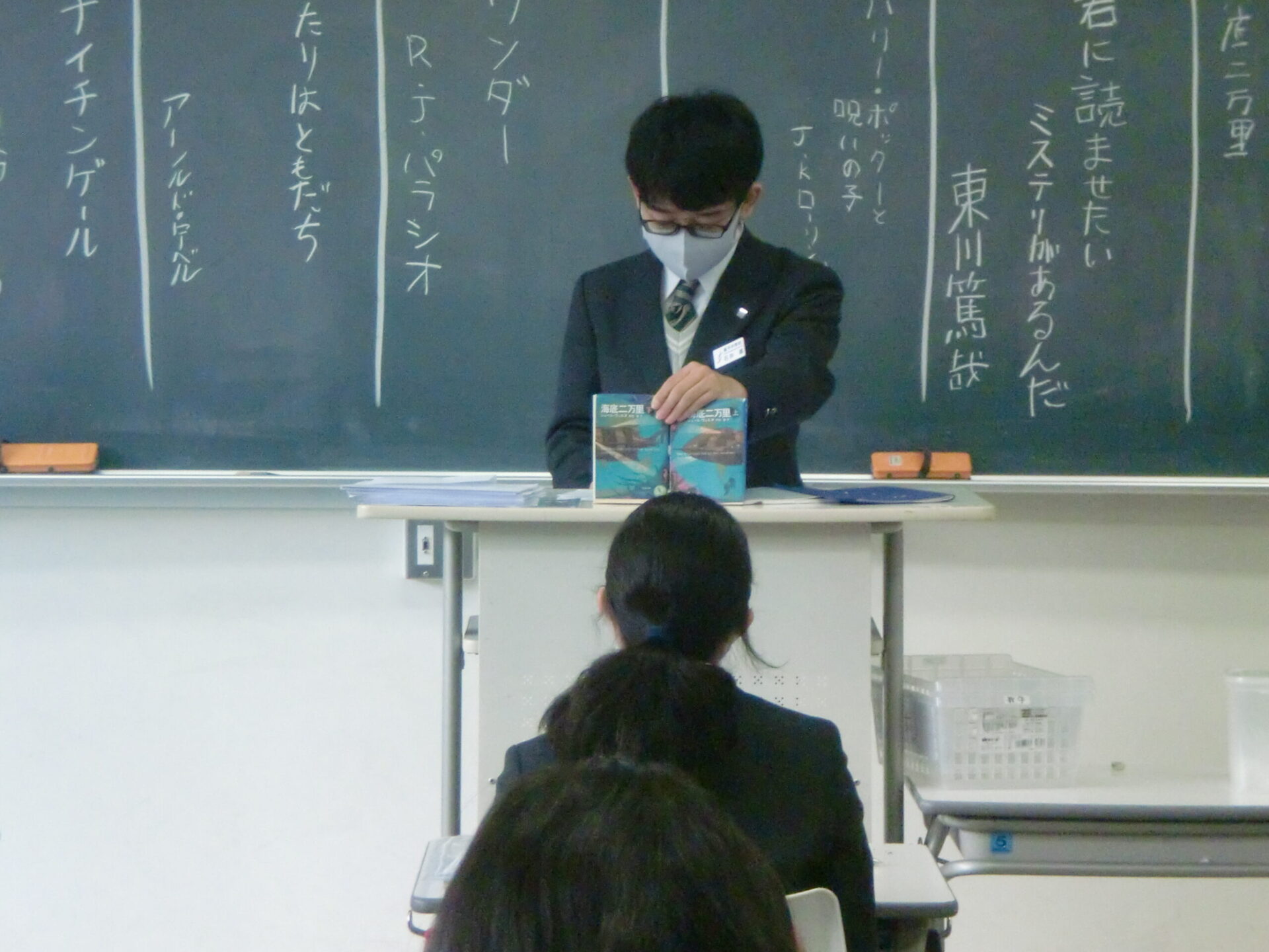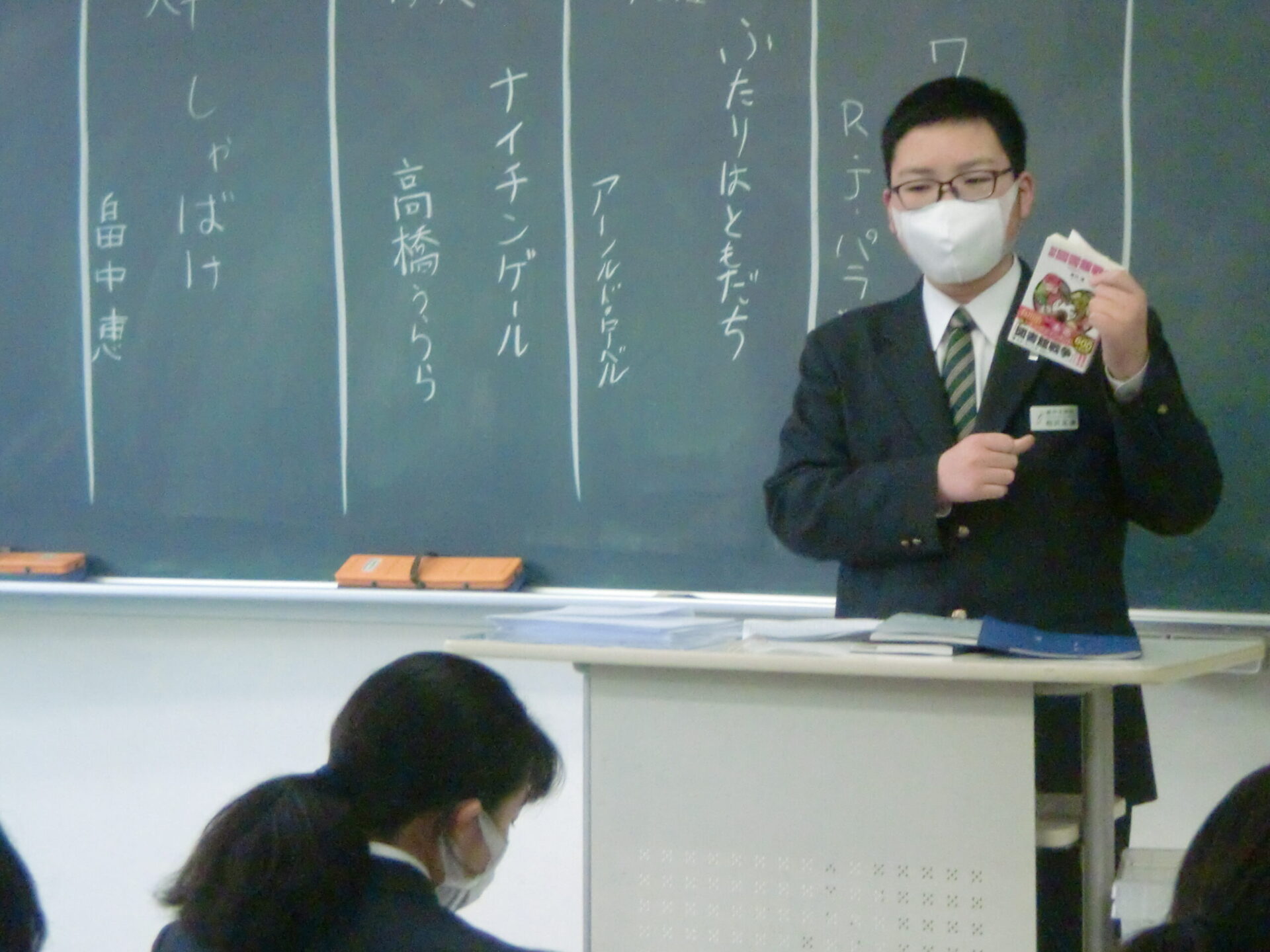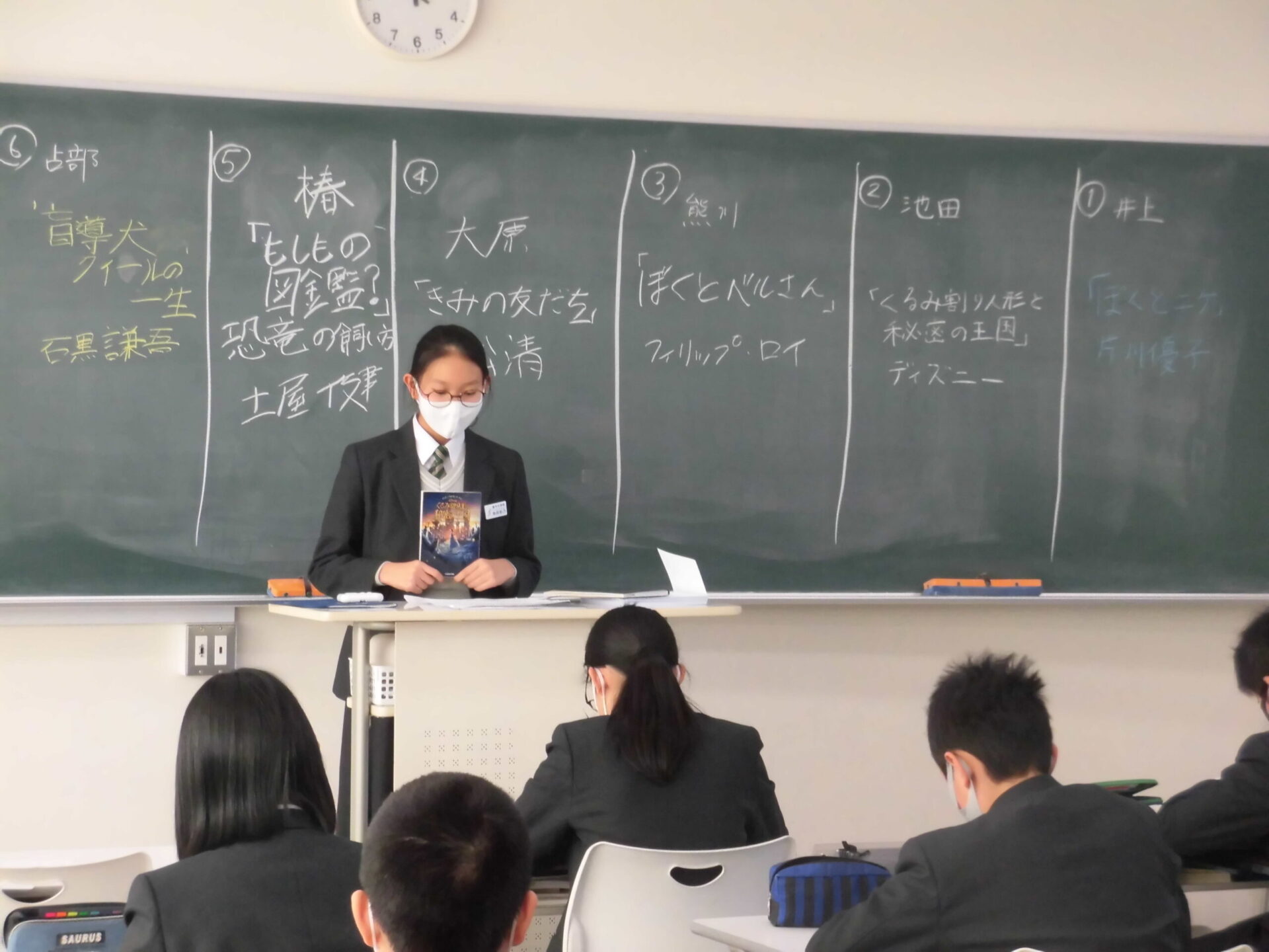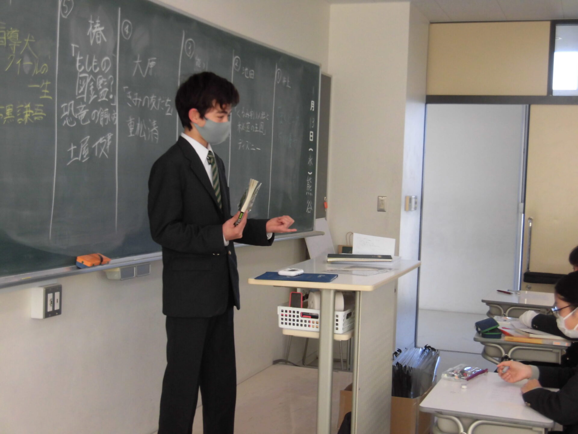 中学1年生の国語の授業でビブリオバトルを行いました。ビブリオバトルとは、紹介者が自分の気に入った本の魅力について語り、聞き手にいかに興味を持たせるかという書評ゲームです。紹介者は発表時間(2分30秒)内に収まる約1000字の原稿を準備し、各自が表現を工夫して臨みました。聞き手はあらすじや紹介者自身の感想といった内容と、声の大きさや視線など発表の態度により評価しました。昌平中では朝読書を毎朝行なっていますが、その読書体験により生徒一人ひとりの感性が確かに、そして豊かに育つことを感じる授業でした。