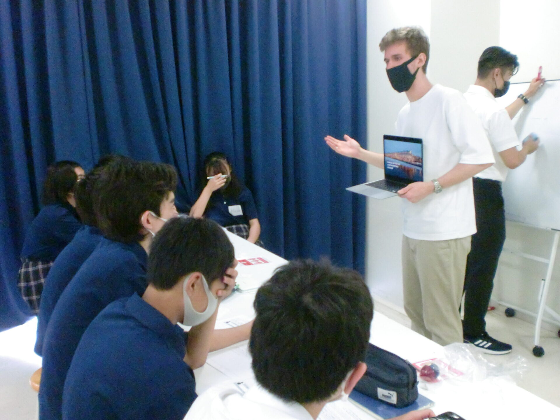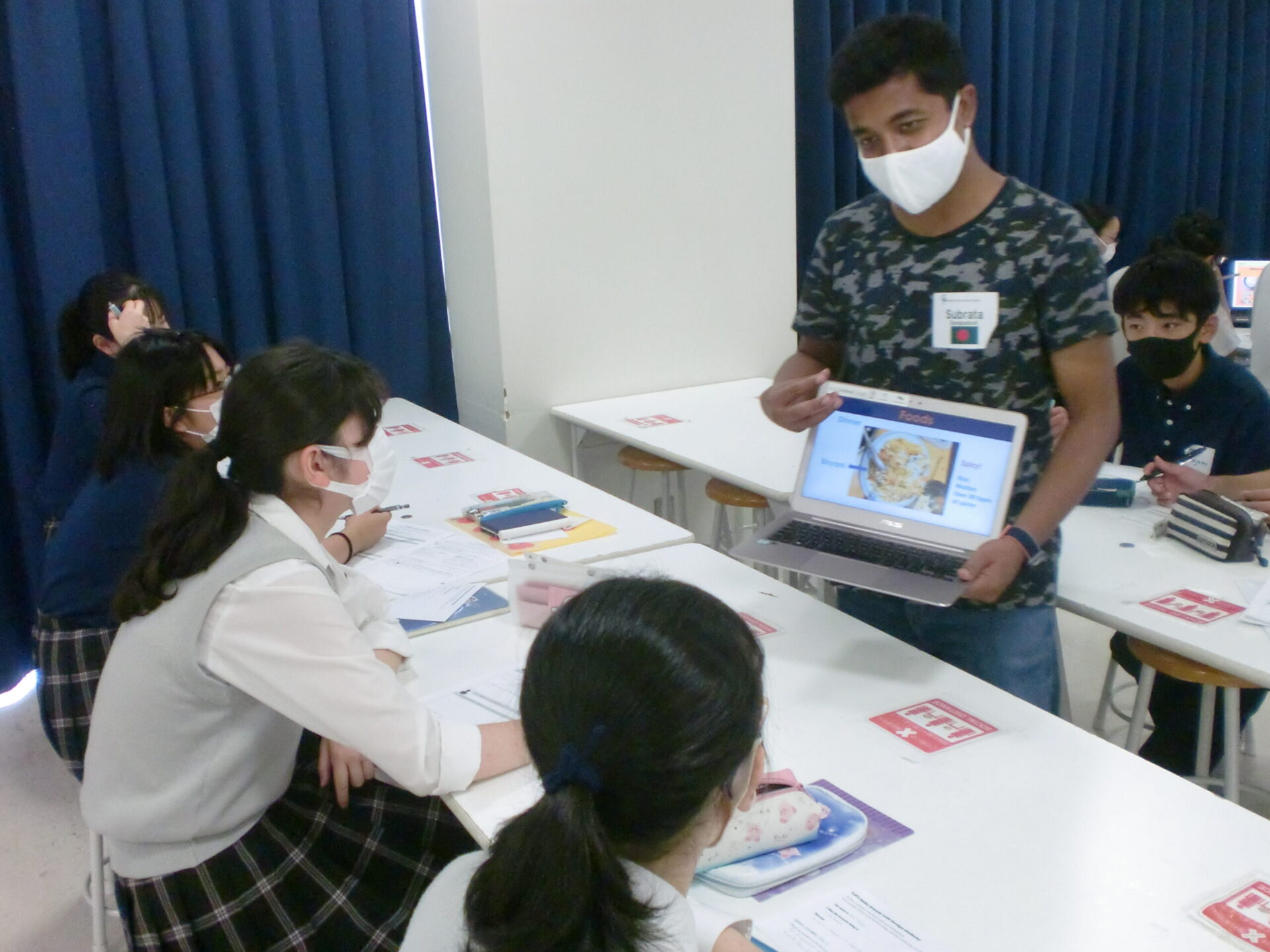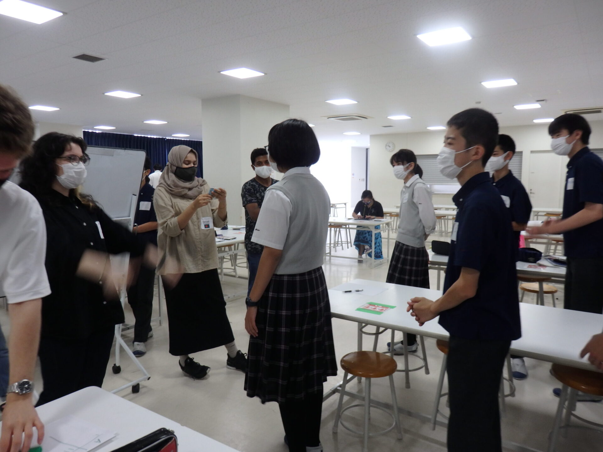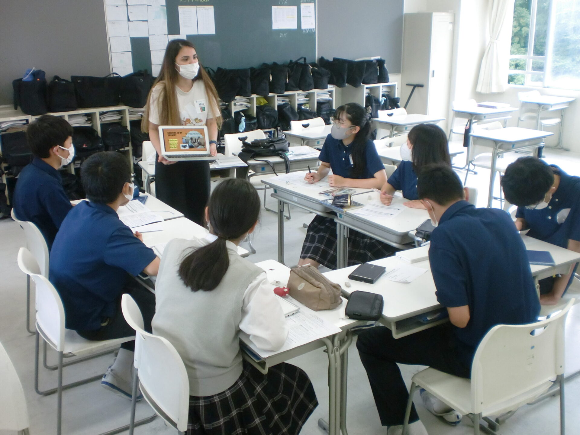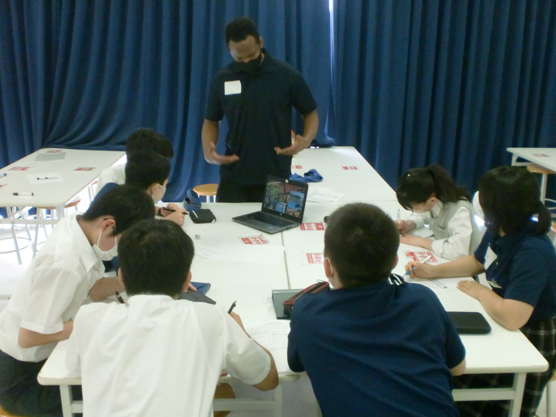 7月14日(水) に中学2年生はGlobal Villageの活動を行いました。内容は、海外からの留学生と一緒に,自己紹介やジェスチャー伝言ゲーム,単語ゲームなどの様々な活動を通した異文化理解です。コロナ禍にあって外部のネイティブスピーカーとの関わりは大変貴重な経験でした。最初は緊張し戸惑いもありましたが、時間が経つに連れて積極的に英語で伝えようとする生徒が多くなりました。生徒は英語を実際に使い、コミュニケーションできる喜びを感じていました。今後の英語の学習に更なる積極性が期待できそうです。