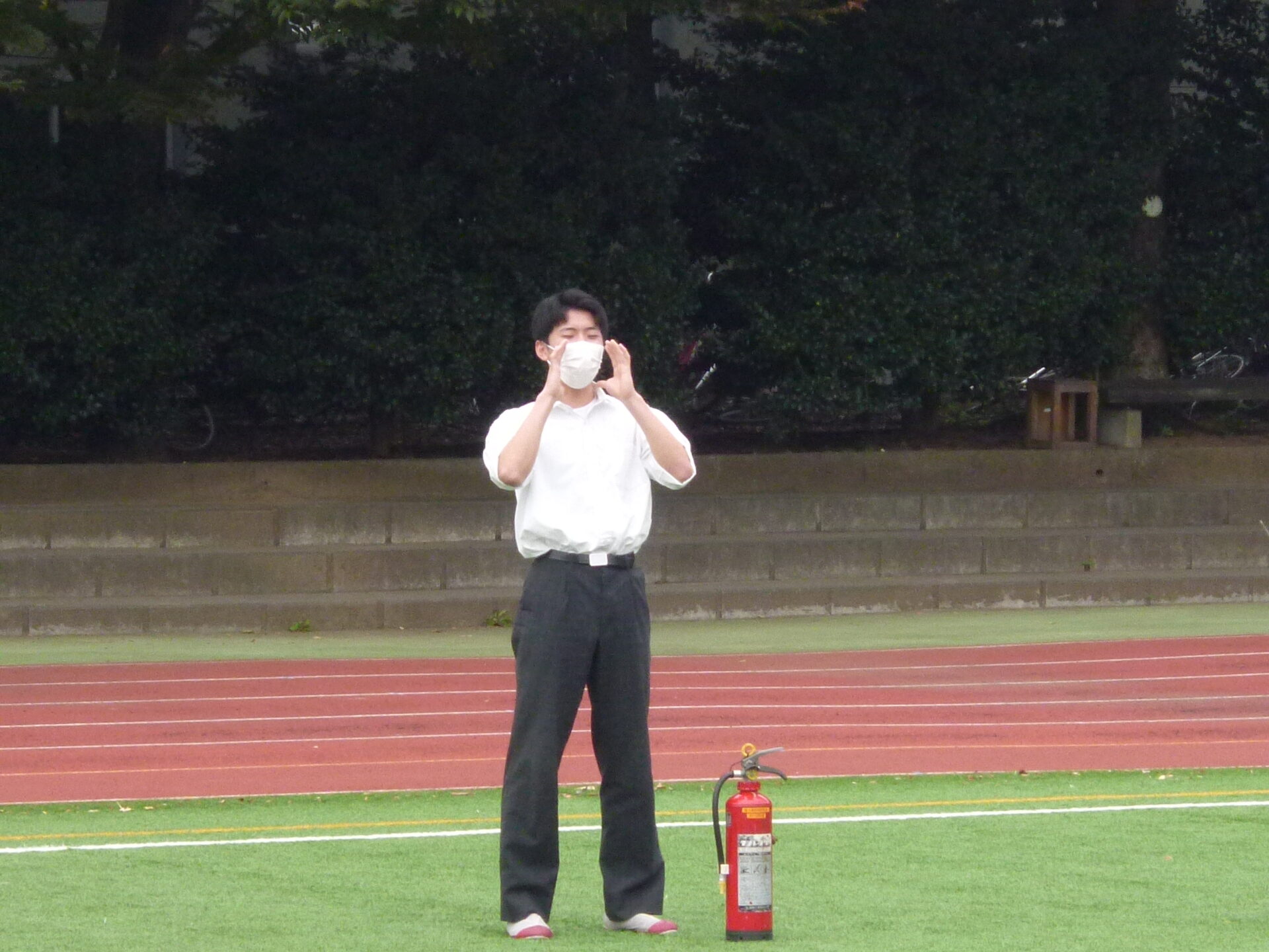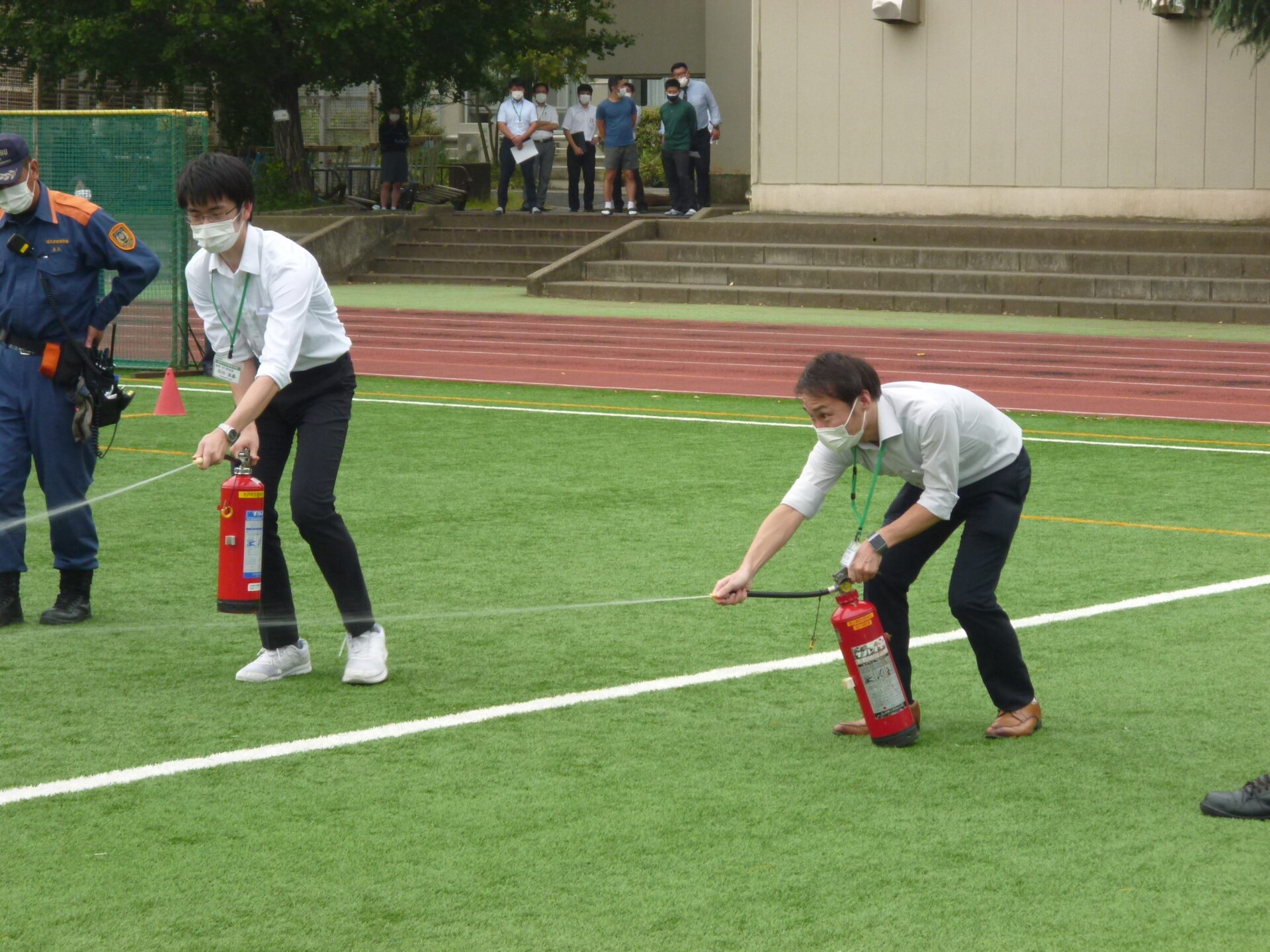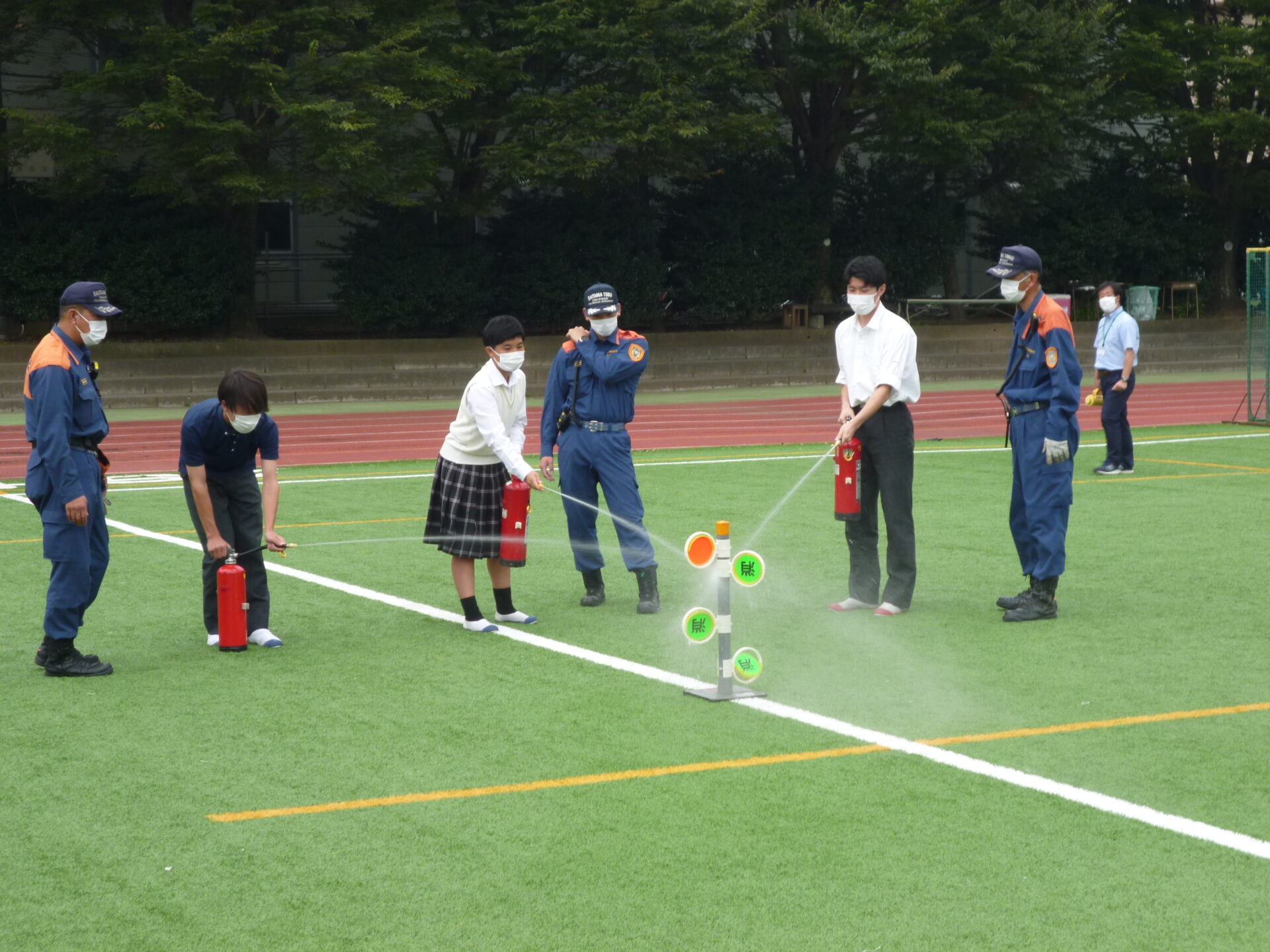 まず全校生徒への避難学習を実施し、代表生徒による避難訓練を行いました。その後、杉戸消防署の方々からの指導の下、消火器の使い方や避難時の注意事項が説明され、代表生徒が消火器訓練を行い、防災意識の向上に努めました。初めて消火器に触れる生徒もいましたが、上手に消火活動を行えていました。