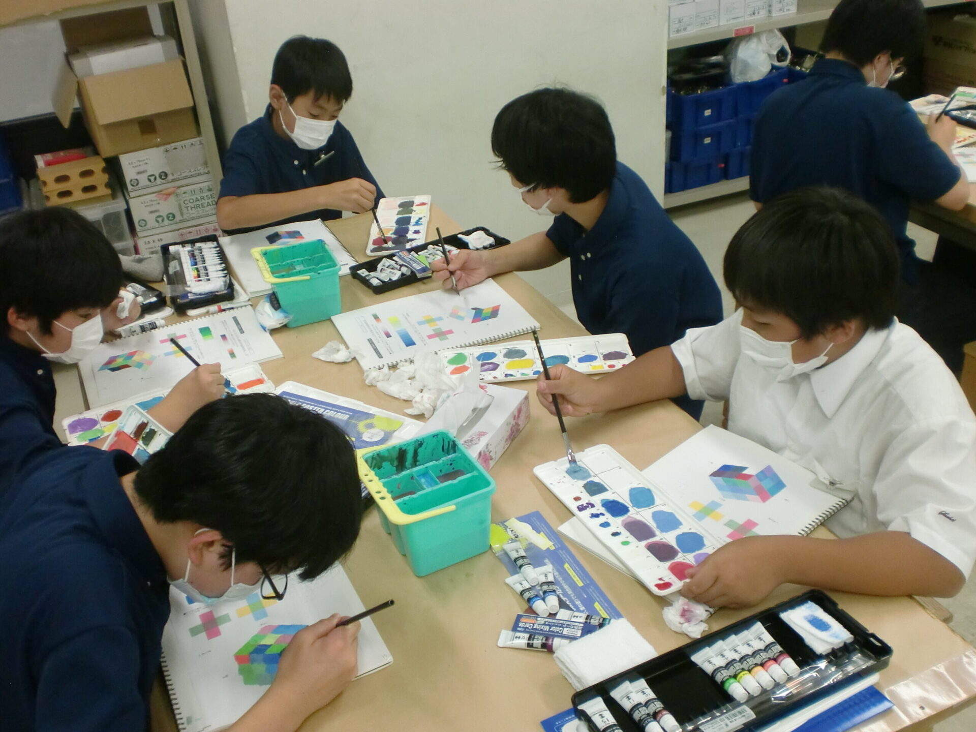 中学1年生の美術の授業です。今日は平面構成の前段階として色彩理論を学び、ポスターカラーや筆を上手に使ってグラデーションや色立体を制作しました。色彩理論の中で、今回は特に明度について意識が深まり、平面上の六角形が立方体に見えるよう色を塗ることができました。