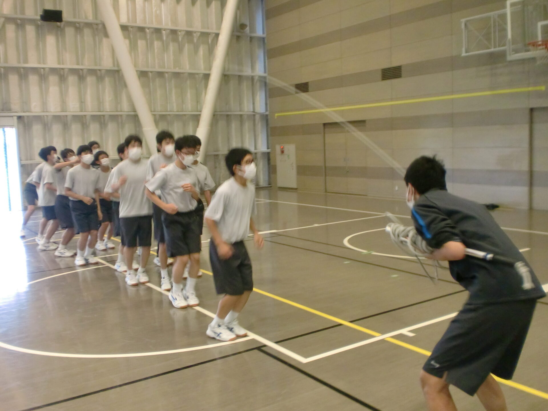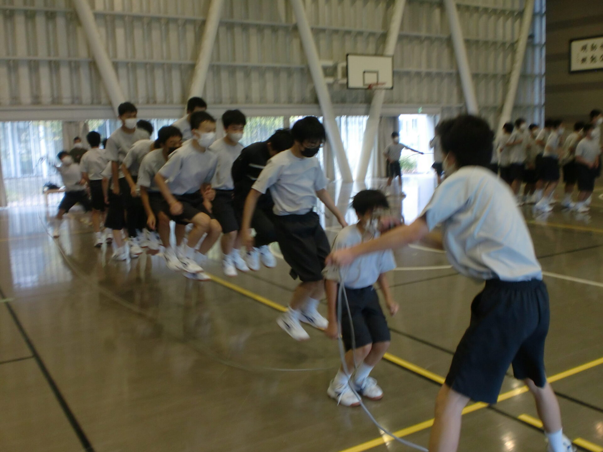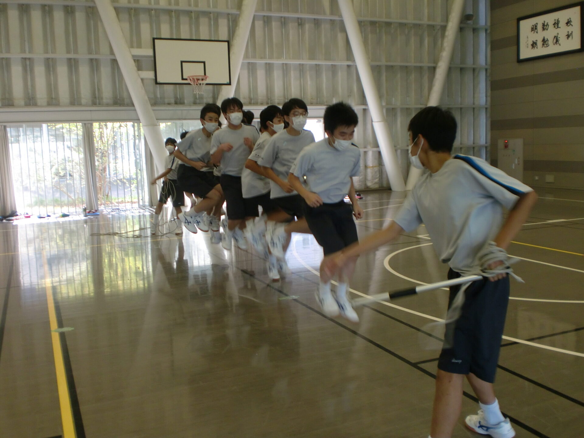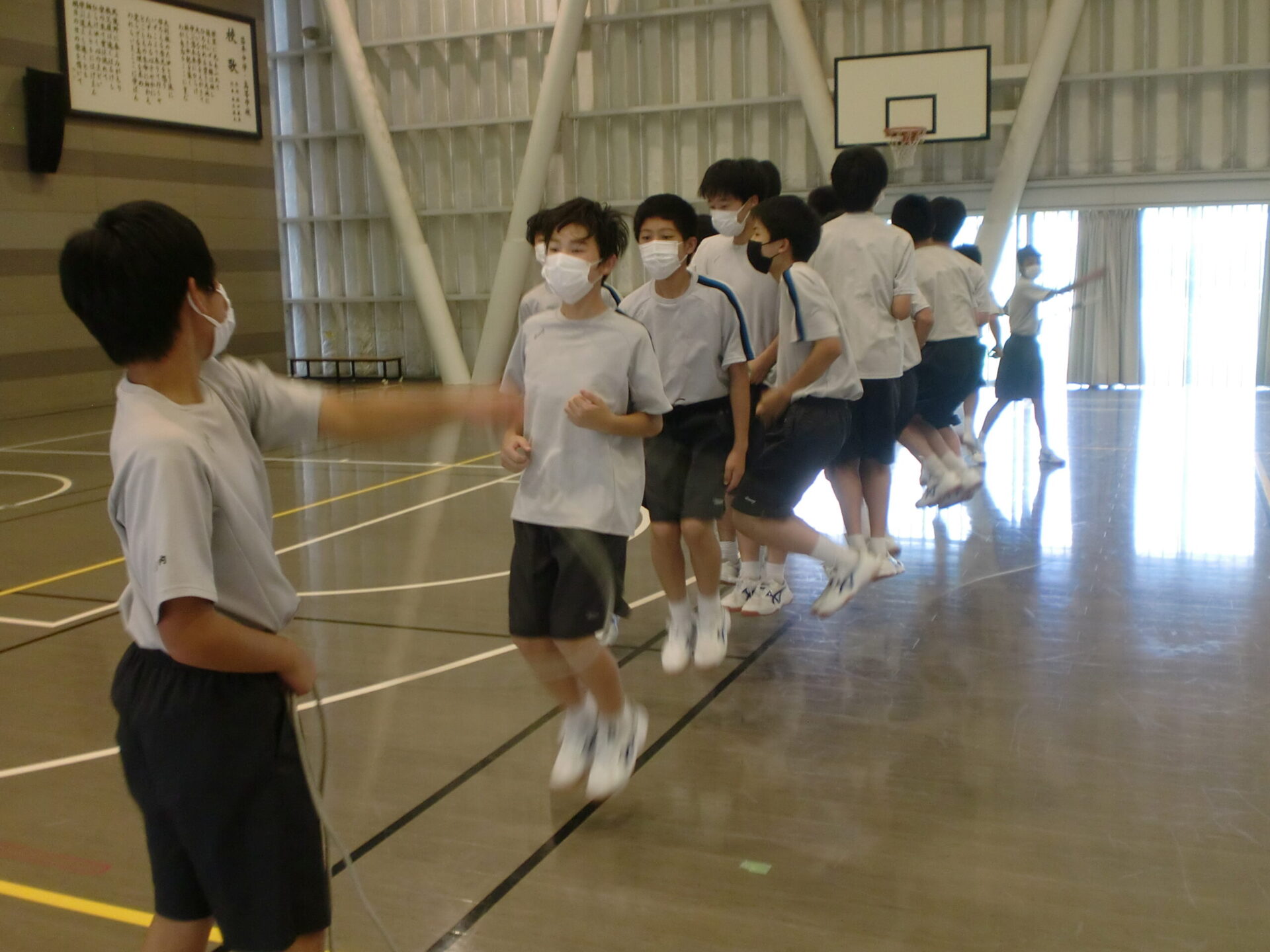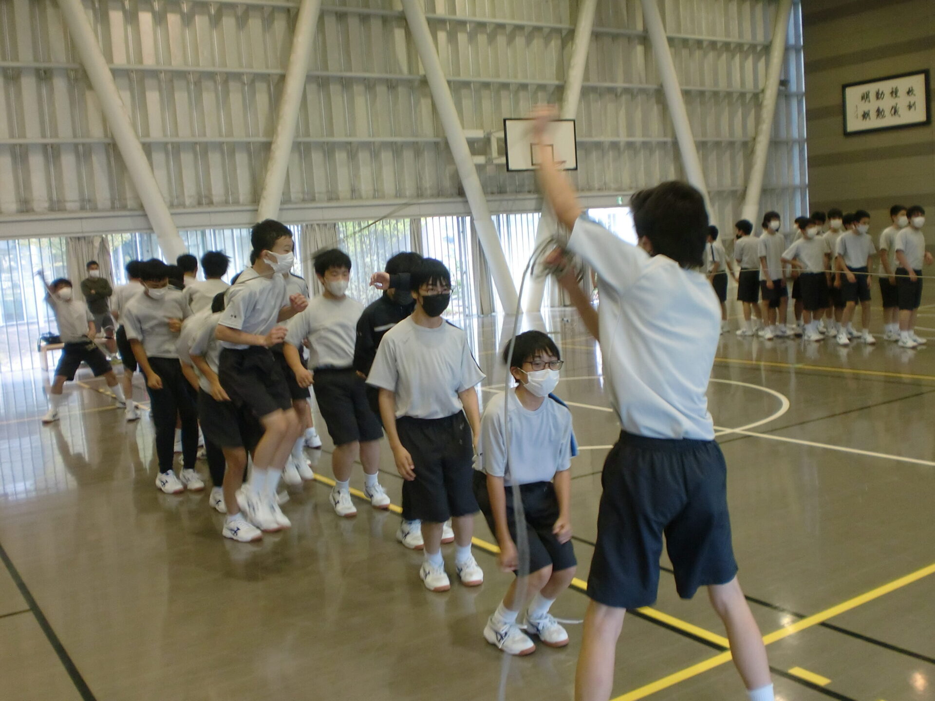 中学2年生の体育の授業です。中間考査前で休み時間にも勉強に一生懸命取り組んでいますが、体育の時間は体を動かすことに専念しています。男子は縄跳び、女子はソフトボール。夢中になって皆で楽しんでいるようでした。