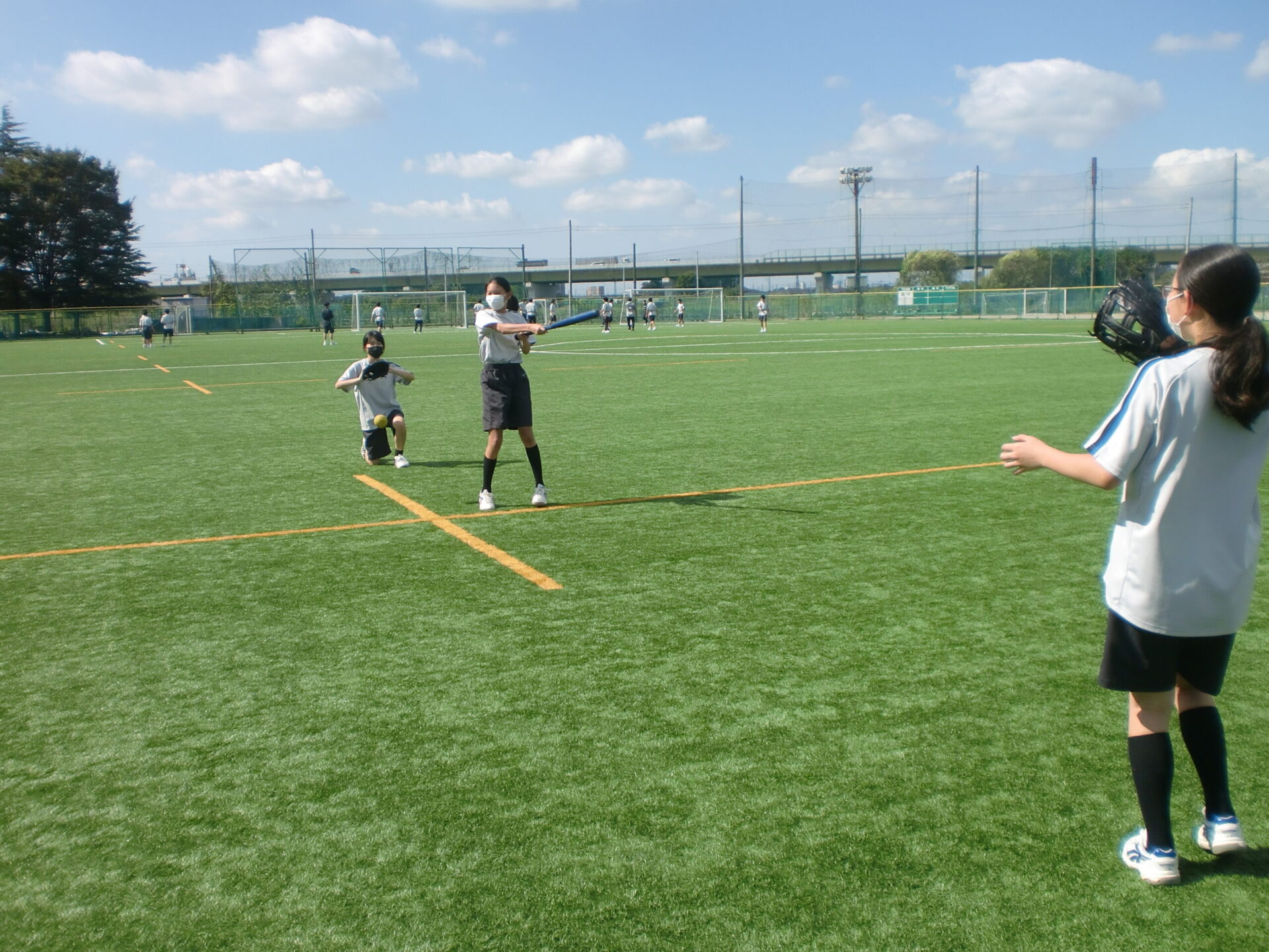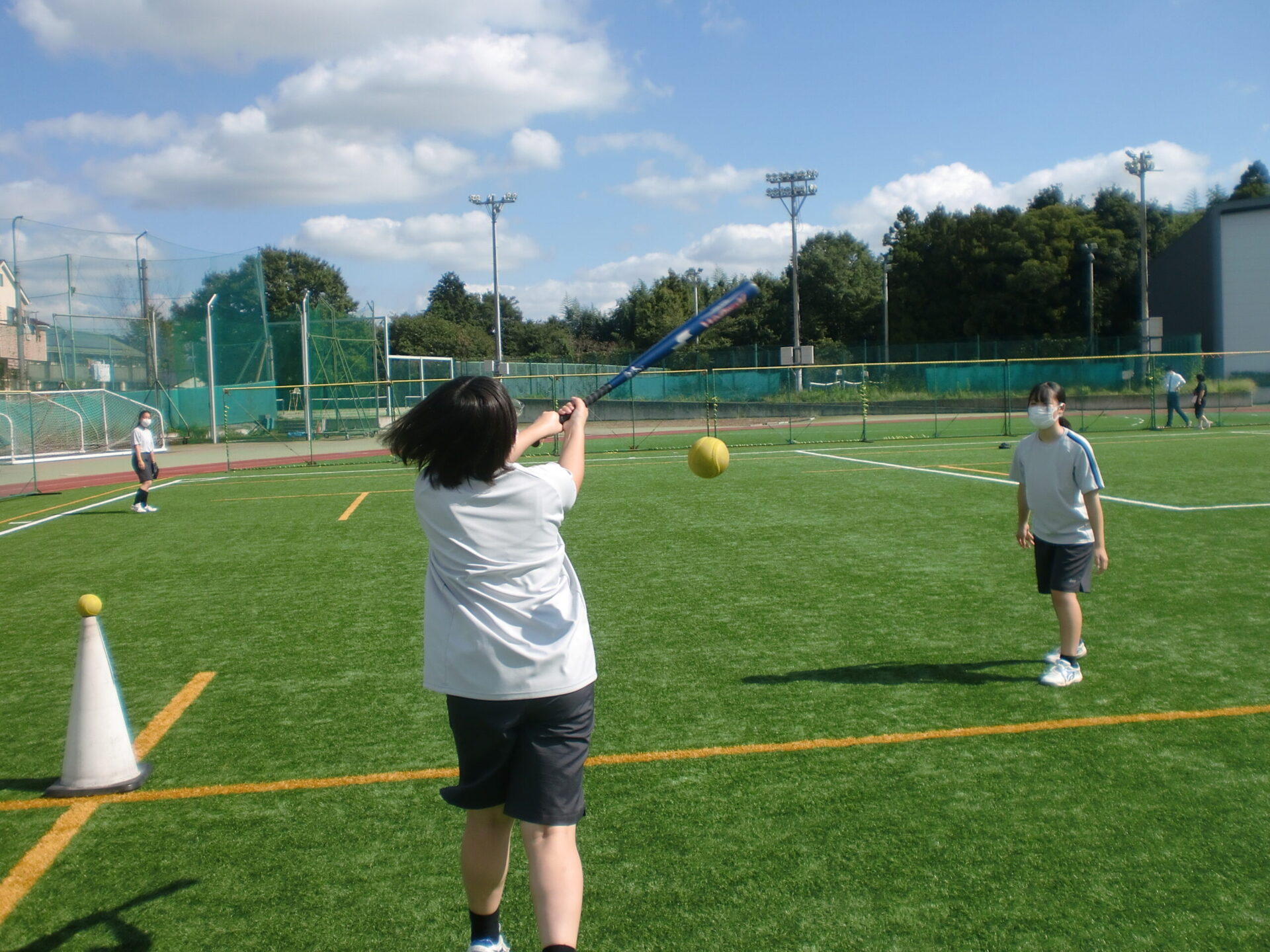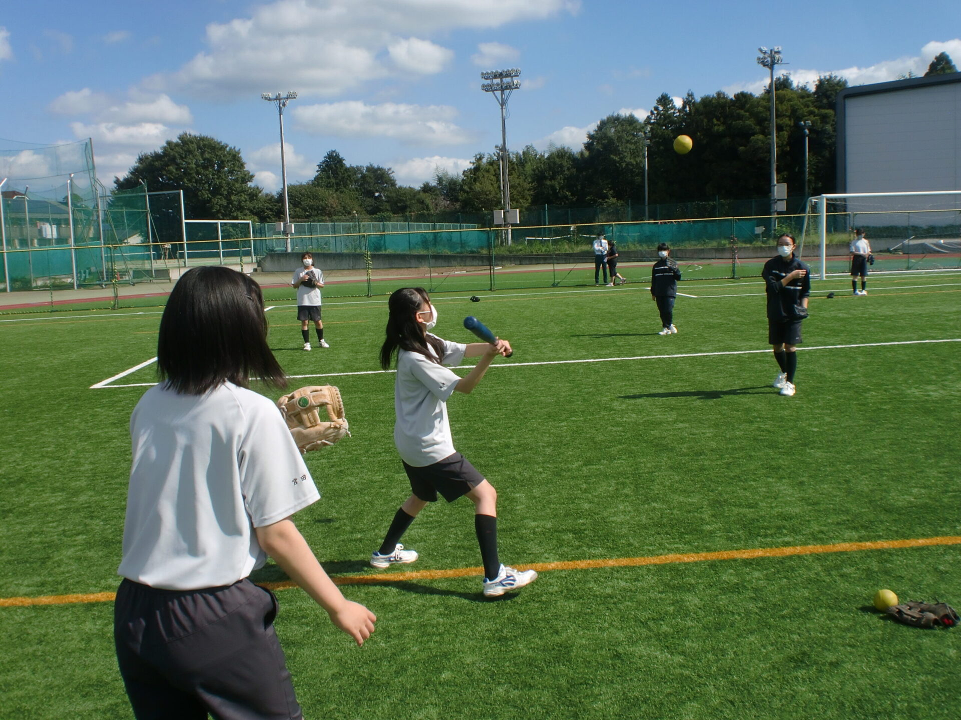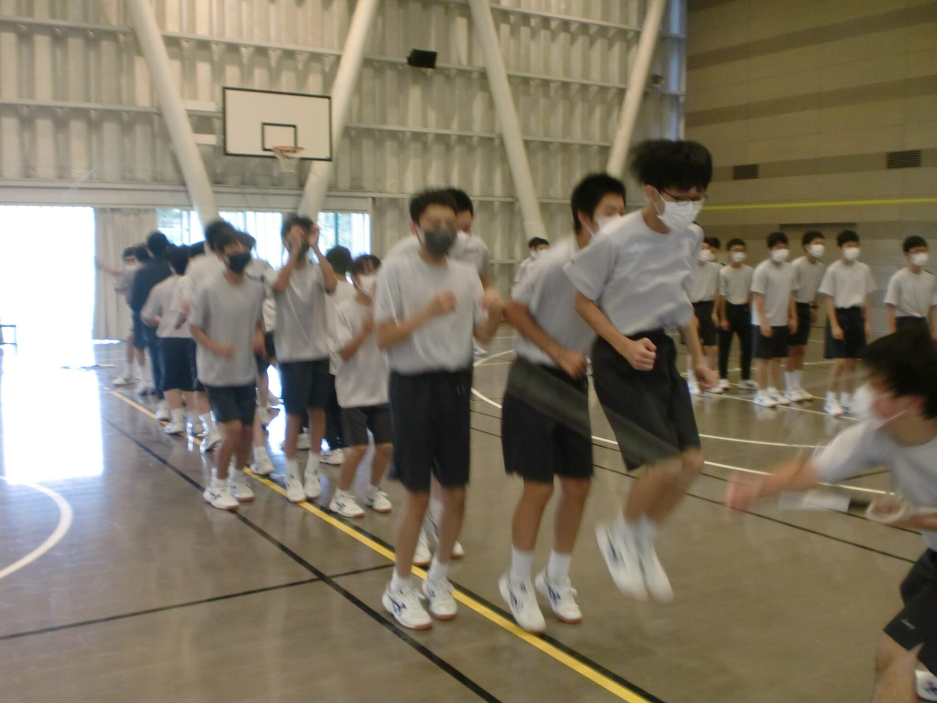 中学2年生の体育の授業です。中間考査前で休み時間にも勉強に一生懸命取り組んでいますが、体育の時間は体を動かすことに専念しています。男子は縄跳び、女子はソフトボール。夢中になって皆で楽しんでいるようでした。