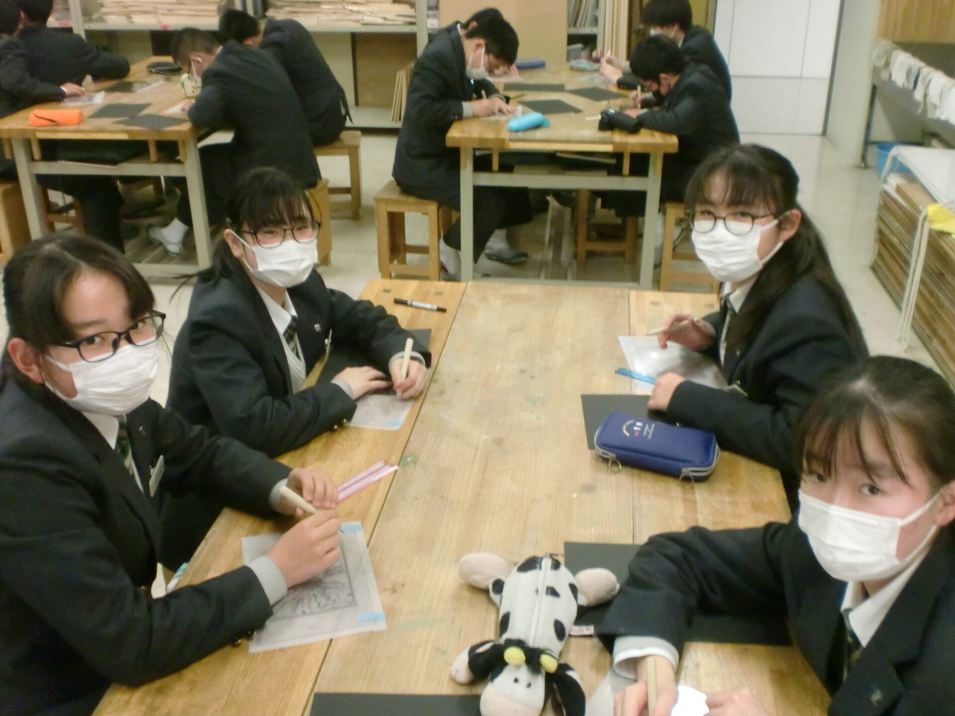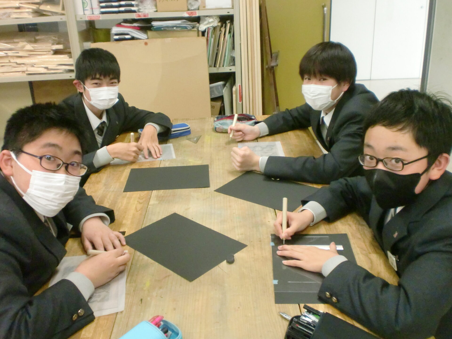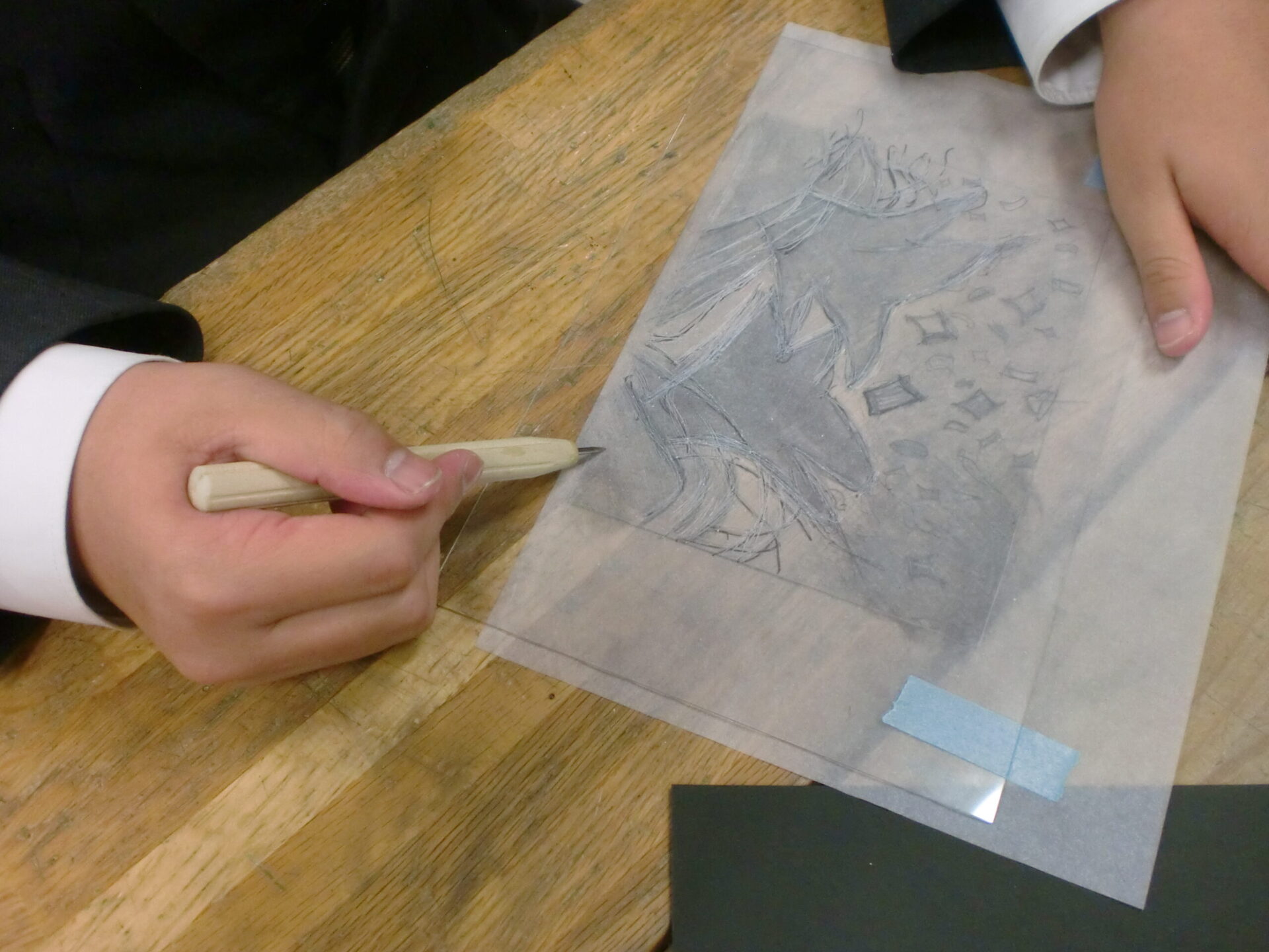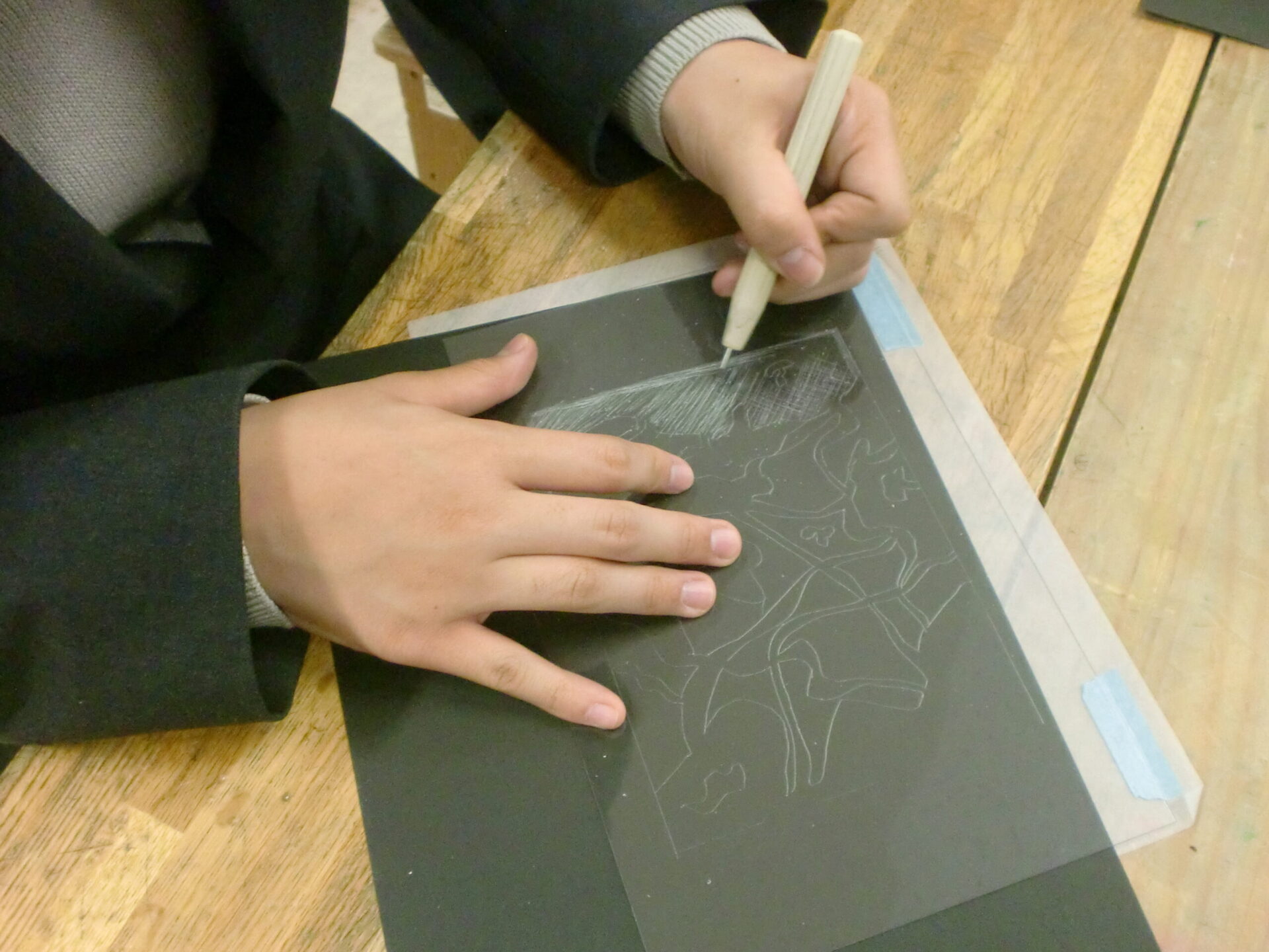 中学1年1組の5時間目の授業は美術です。「気持ちを表す抽象表現」をドライポイントの技法で制作します。今日から下描きを基に、アクリル板をニードルで彫る製版作業が始まりました。下描きを写しながらの作業ですが、絵を描くような新鮮な気持ちで取り組むことが大切です。生徒は夢中になって取り組んでいました。完成が楽しみです。