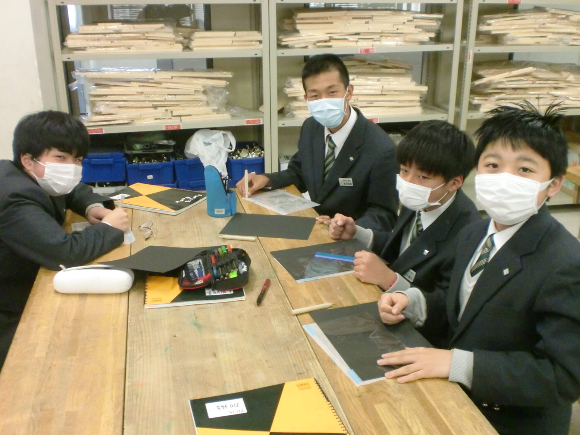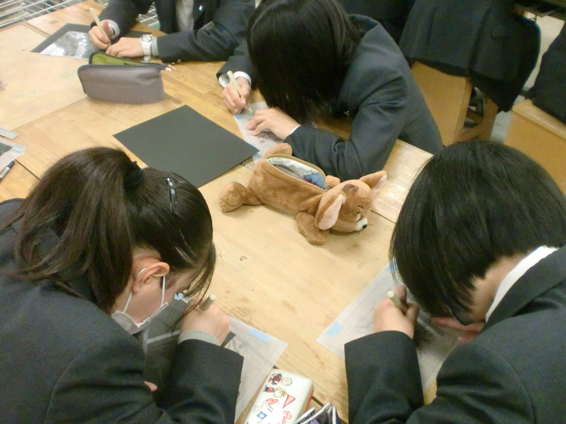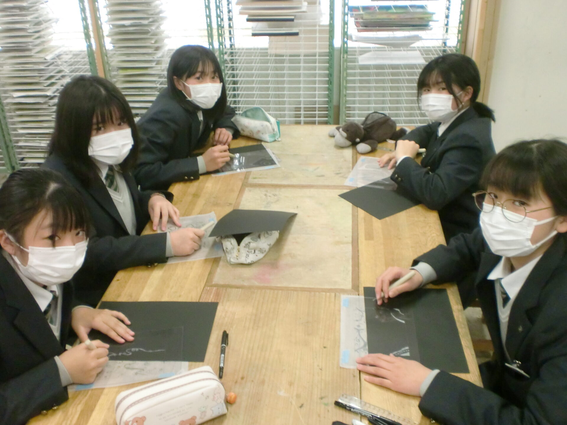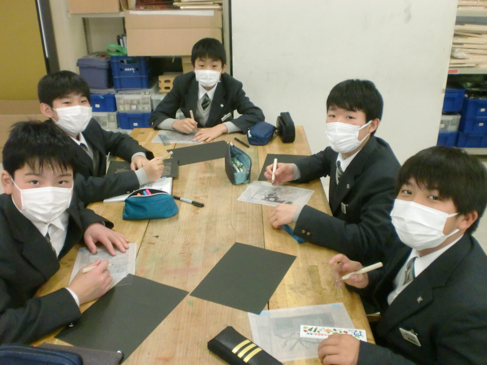 中学1年1組の5時間目の授業は美術です。「気持ちを表す抽象表現」をドライポイントの技法で制作します。今日から下描きを基に、アクリル板をニードルで彫る製版作業が始まりました。下描きを写しながらの作業ですが、絵を描くような新鮮な気持ちで取り組むことが大切です。生徒は夢中になって取り組んでいました。完成が楽しみです。