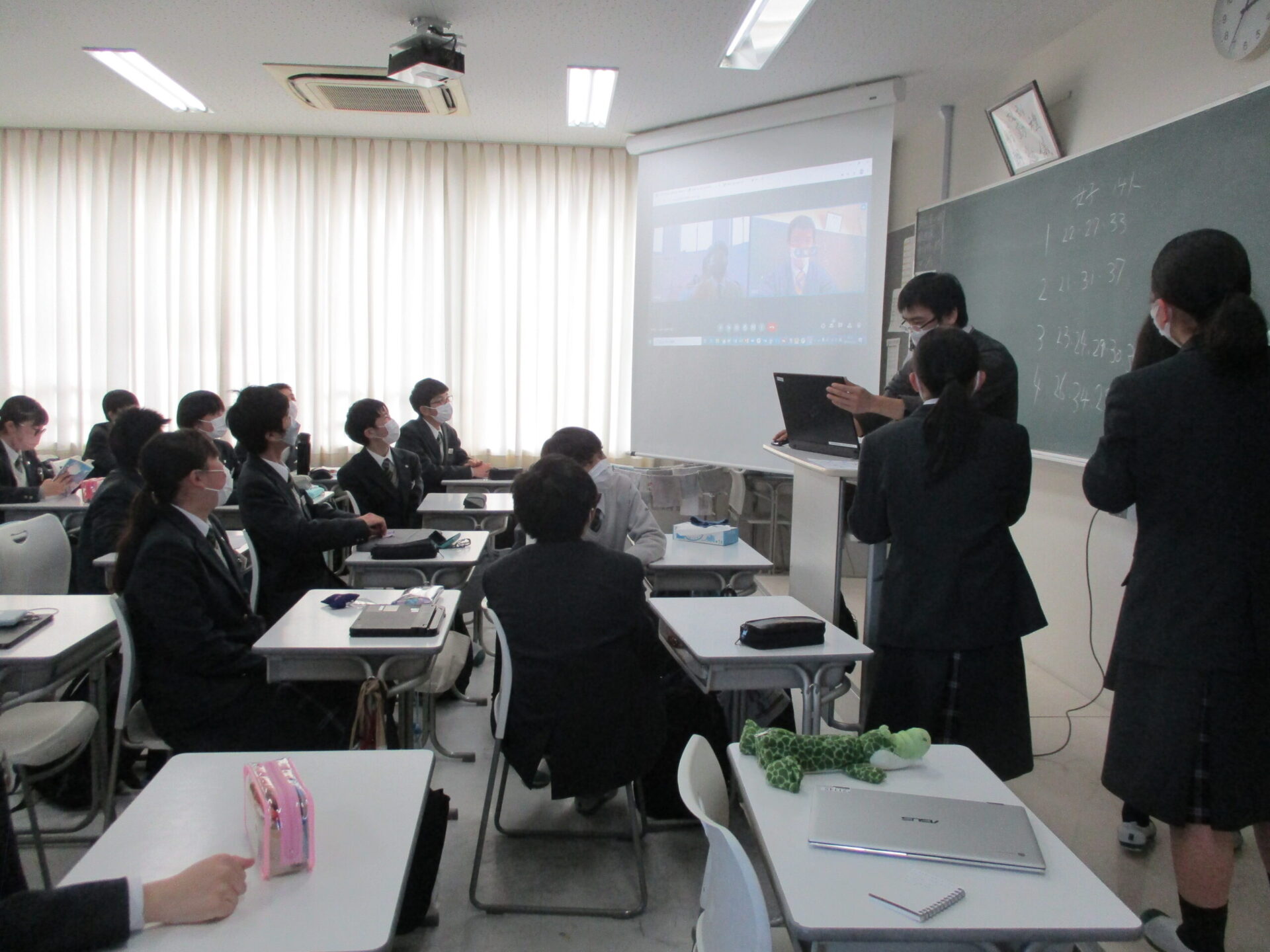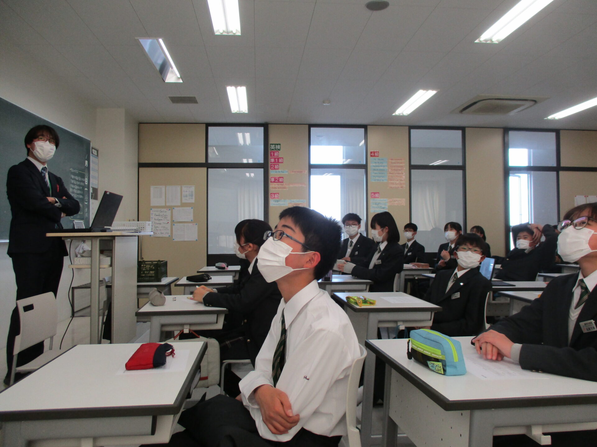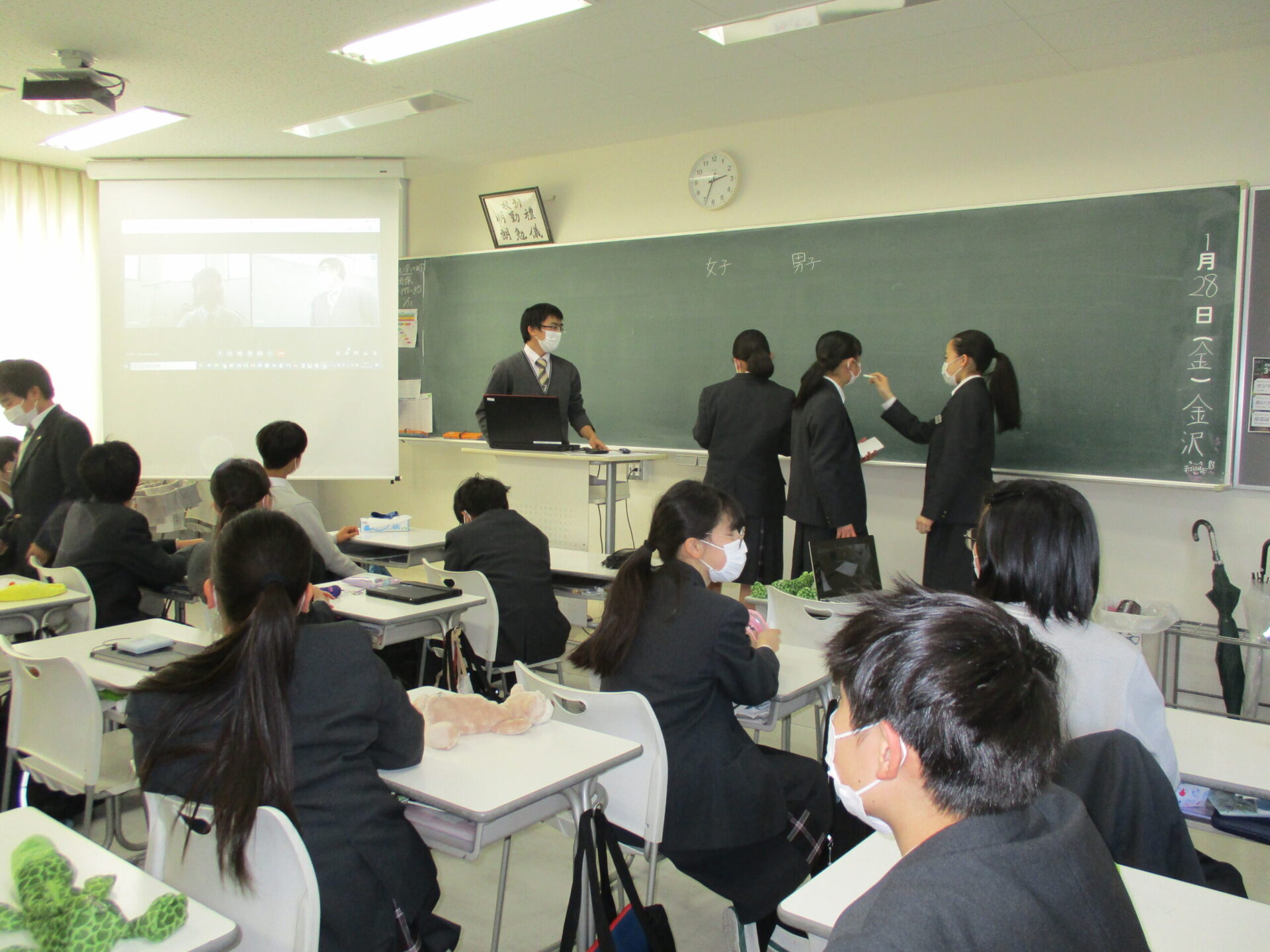 本日の中学1年生のLHRは各クラスごとに活動しました。1組では3月に予定されているボキャブラリーコンテスに向けて1年間のまとめとしてプレテストを実施しました。2組ではクラス全員でビデオレターの企画、制作に取り組みました。3組は水平思考ゲームを実施いたしました。このゲームは問題解決のために、概念や既成の理論にとらわれることなく、さまざまな角度からアイデアを考え出す思考法です。