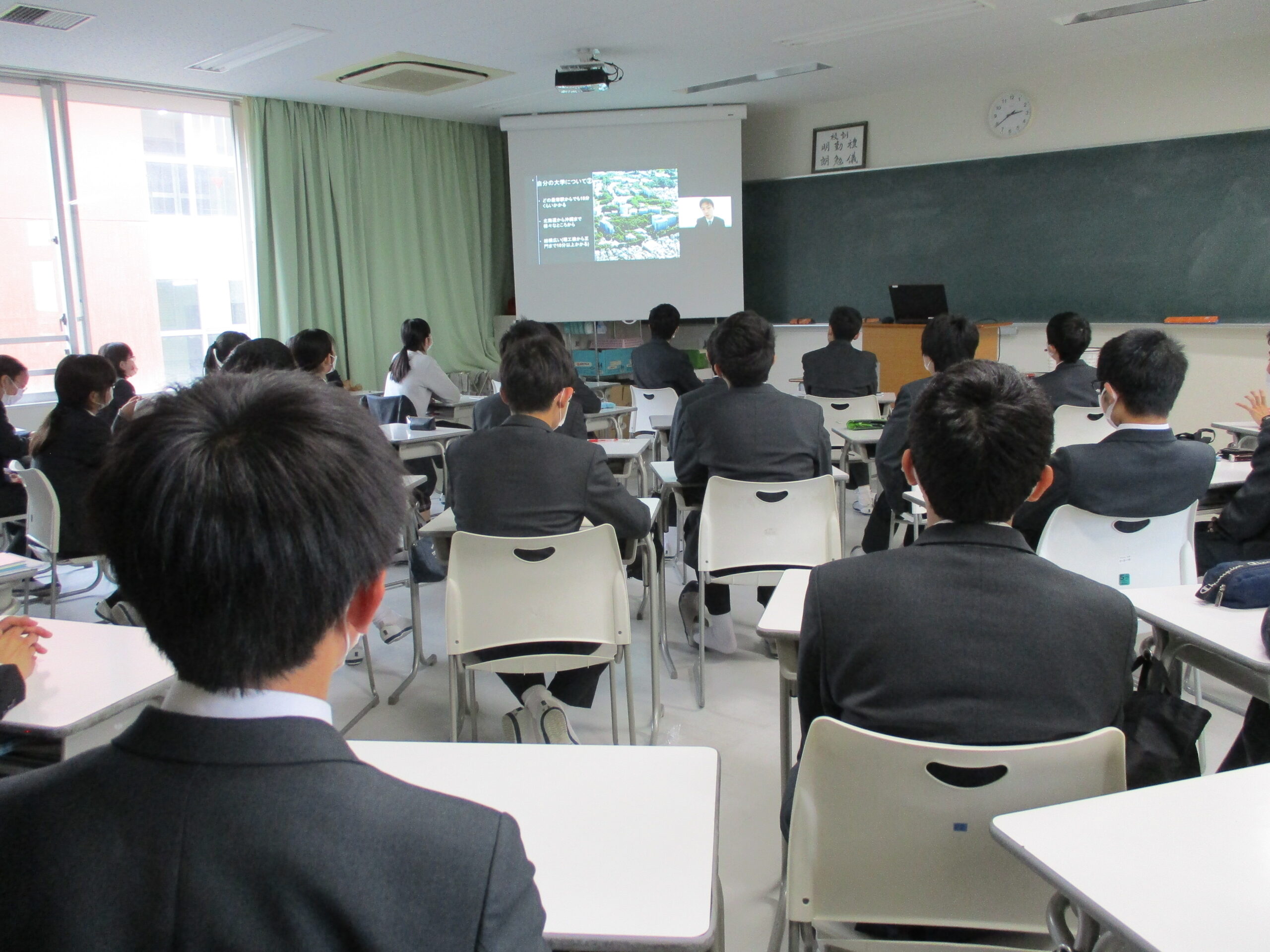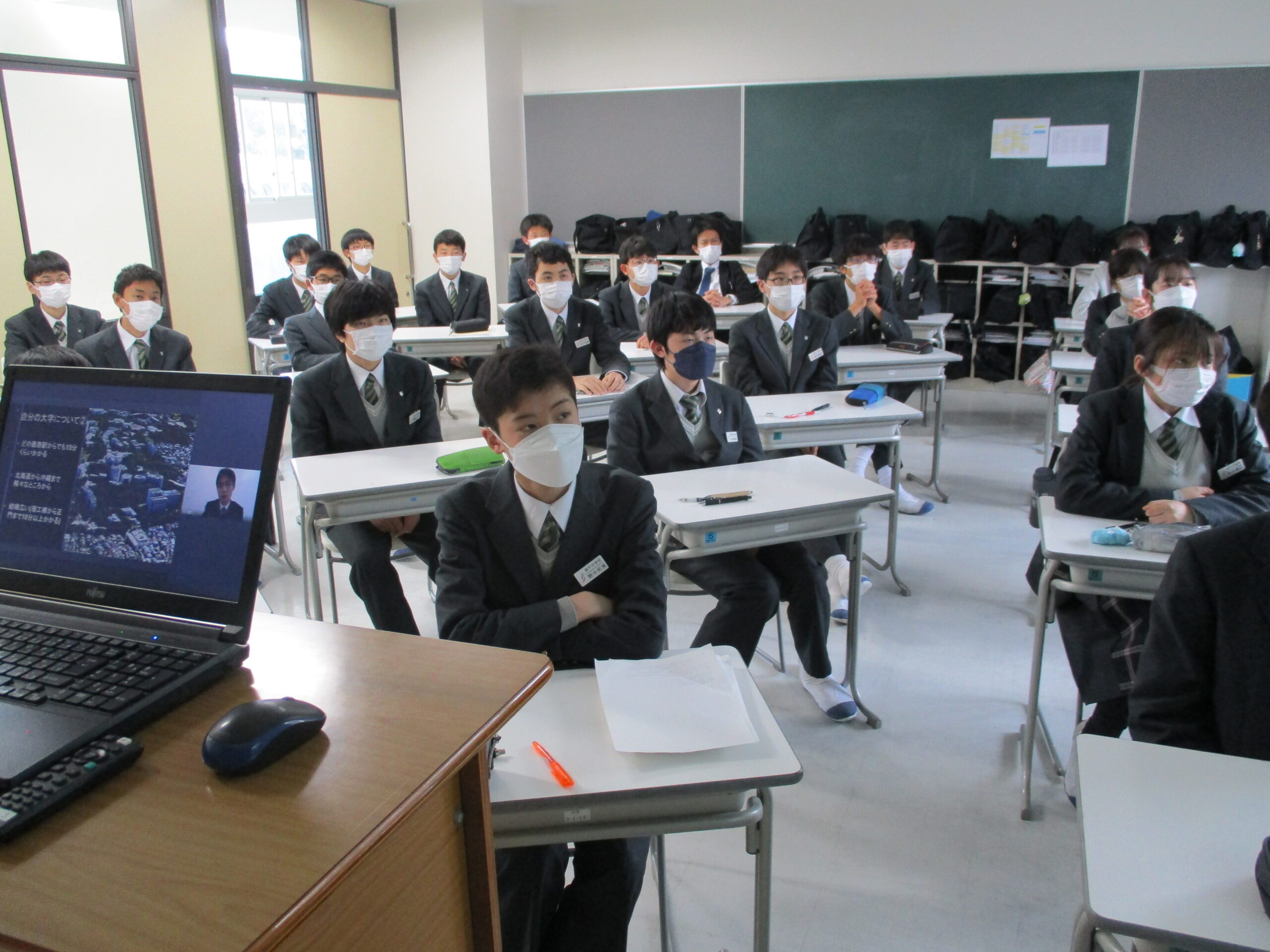 本日6限LHRにおいて、中学3年生を対象とした進路講演会を行いました。内容は大学生の学びと中3高1ですべきことです。講師は本校4期生OBである武藤雄介さん(横浜国立大学理工学部3年生)です。志川進路副部長によるインタビュー形式で事前に録画した動画を、生徒が視聴するという形式で実施しました。大学の紹介から学部学科の違いや授業の選択、さらに大学院や就職について丁寧に説明して頂きました。生徒はメモを取りながら真剣に聞いていました。一貫校の中学3年生として、自分の将来を真剣に考える良い機会となりました。