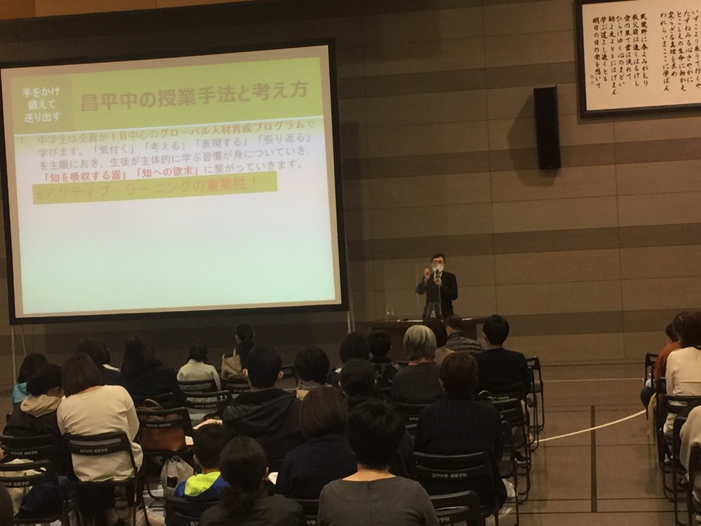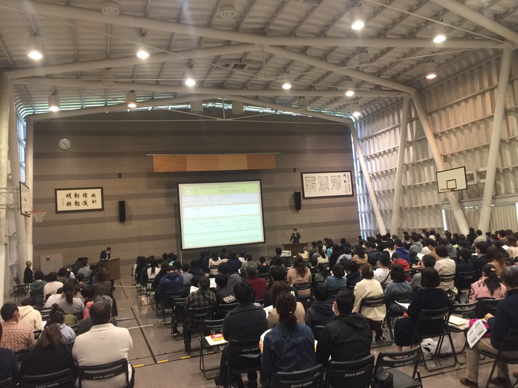 本校の教育内容、具体的な国際教育、英語教育そして本年度入試結果についての説明を大勢のご参加いただいた保護者・児童の皆様に聴いていただきました。
